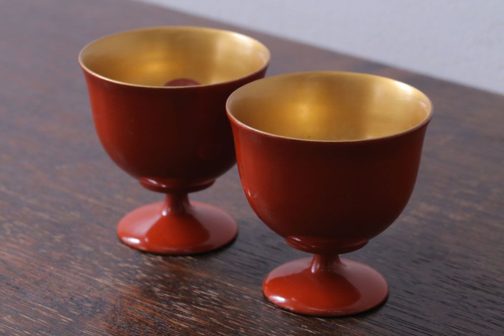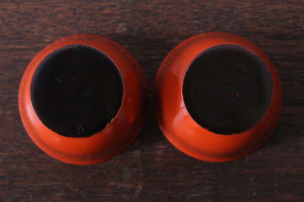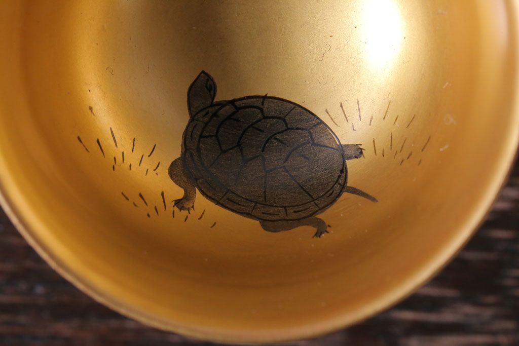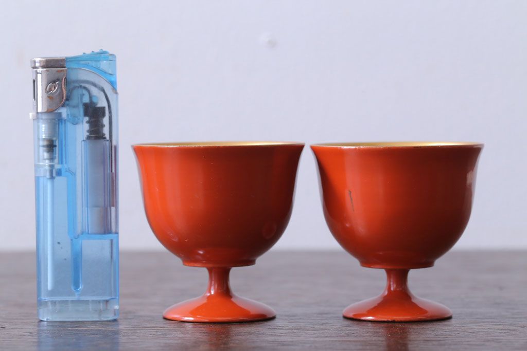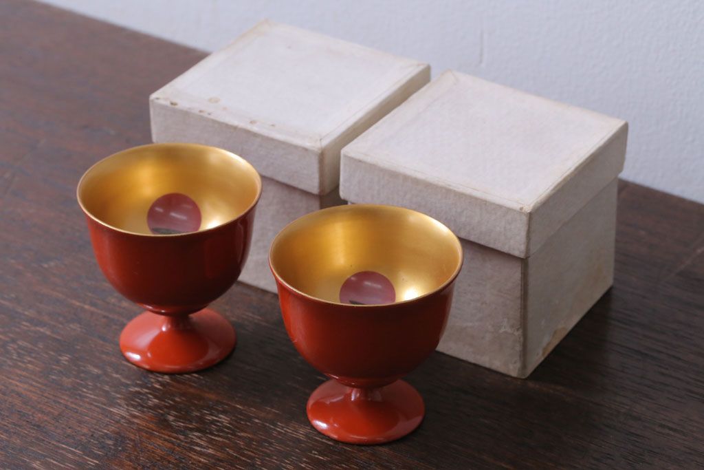 アンティーク雑貨 大正〜昭和初期 鶴亀の図 木製蒔絵盃2客(漆器・杯)