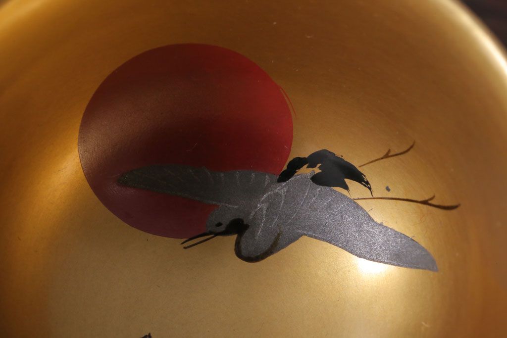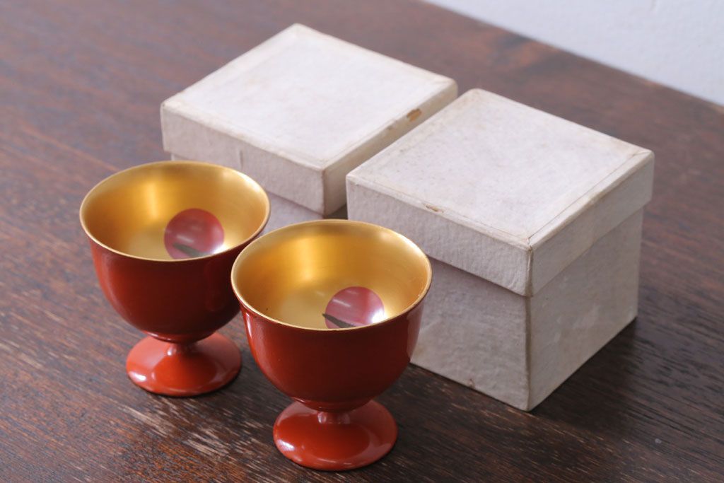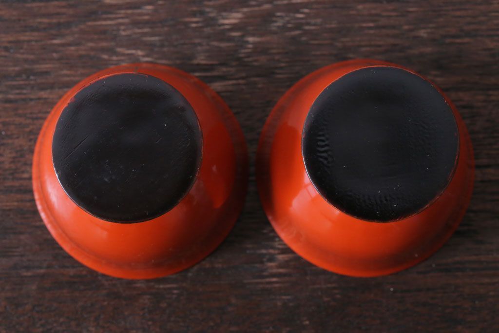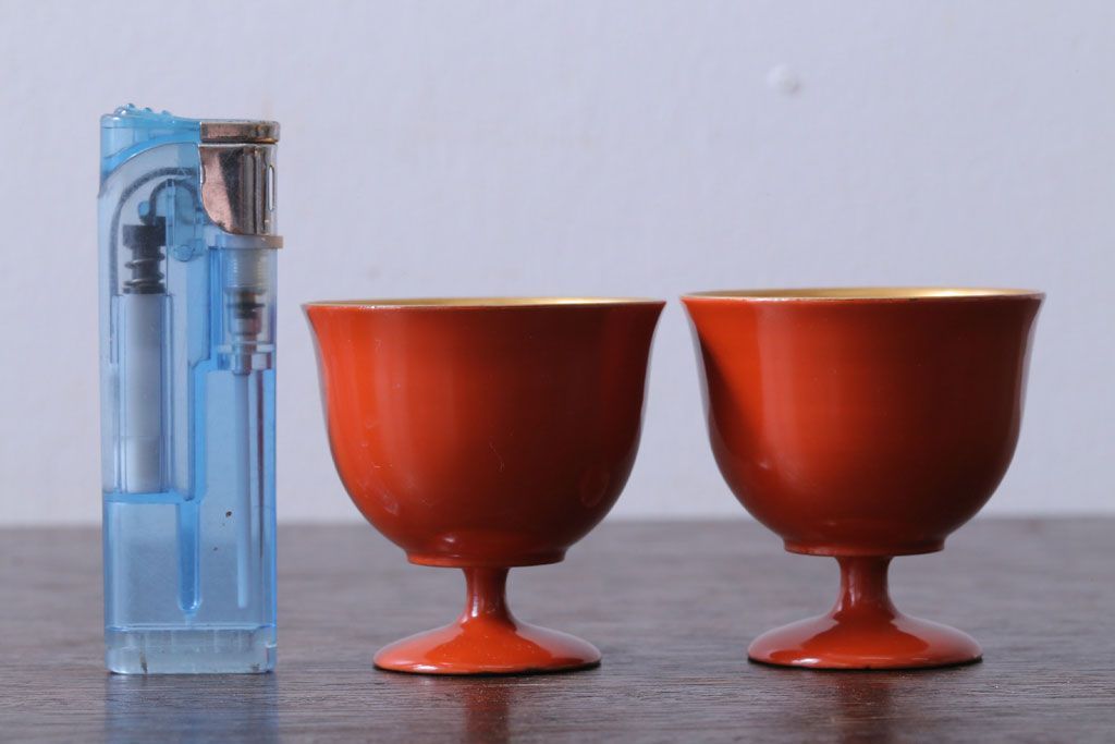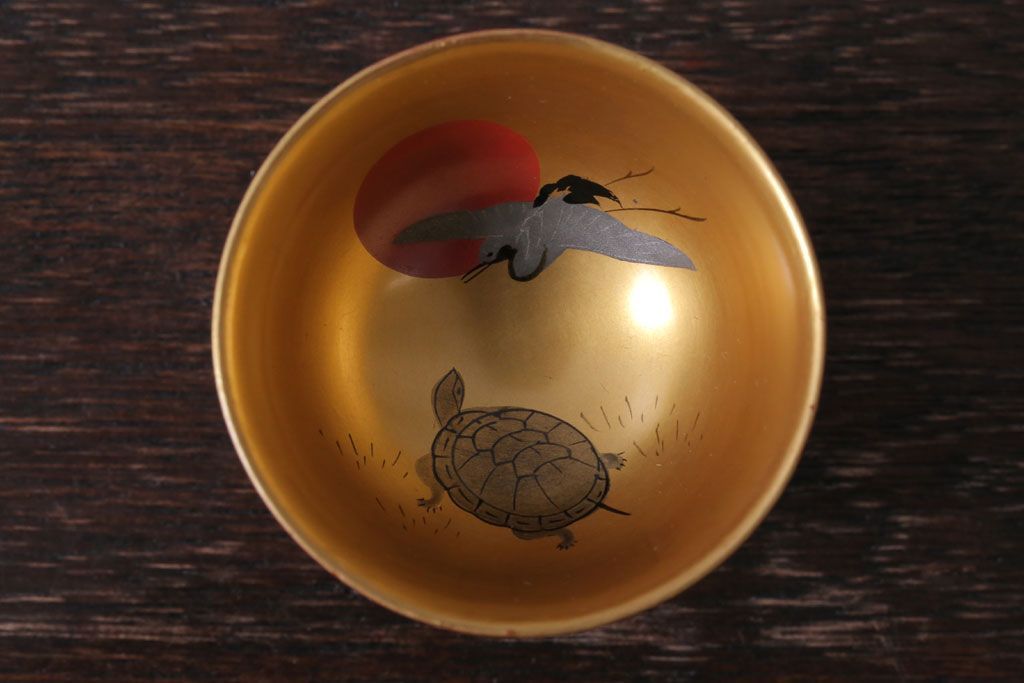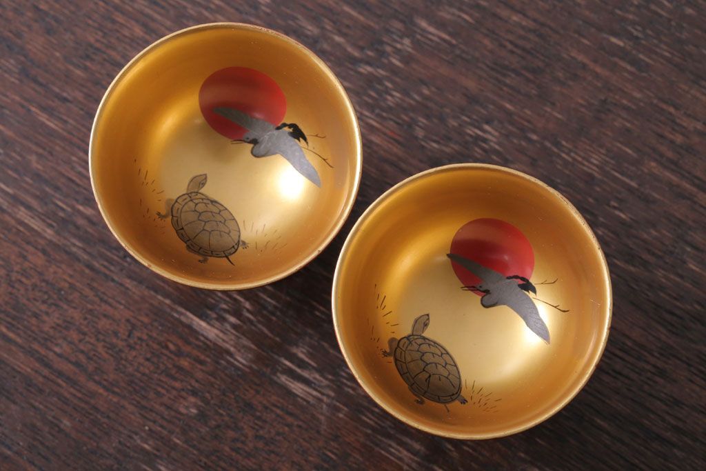 大正〜昭和初期 鶴亀の図 木製蒔絵盃2客(漆器・杯)(2)