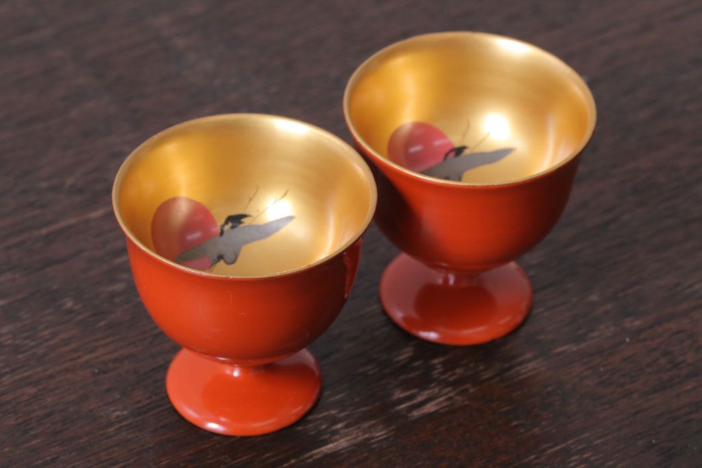 大正〜昭和初期 鶴亀の図 木製蒔絵盃2客(漆器・杯)(2)です。