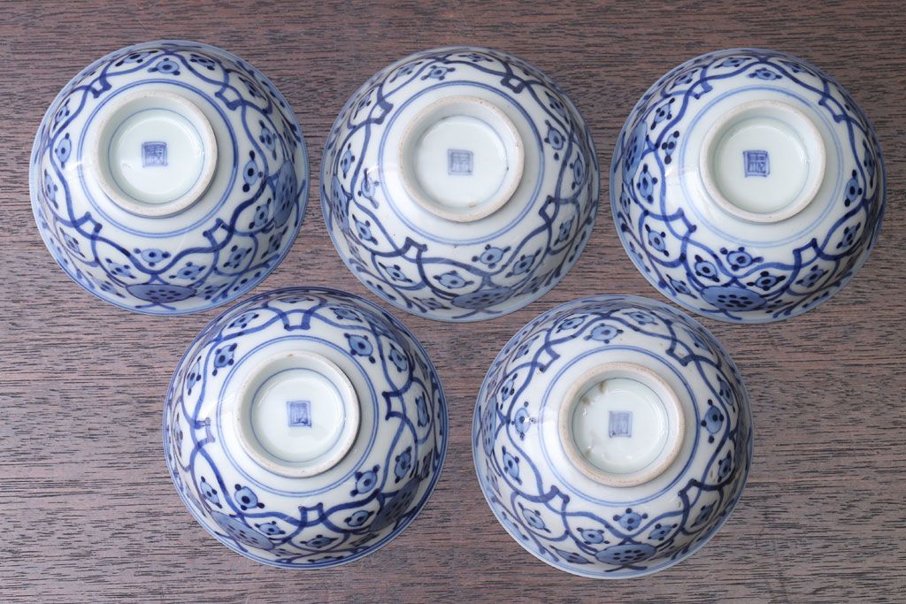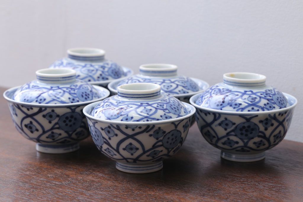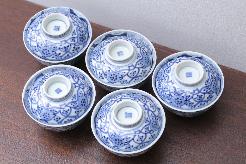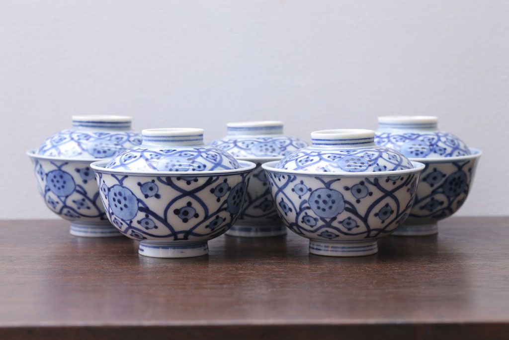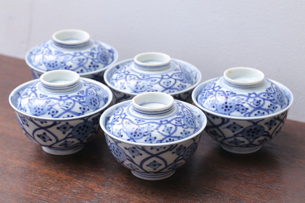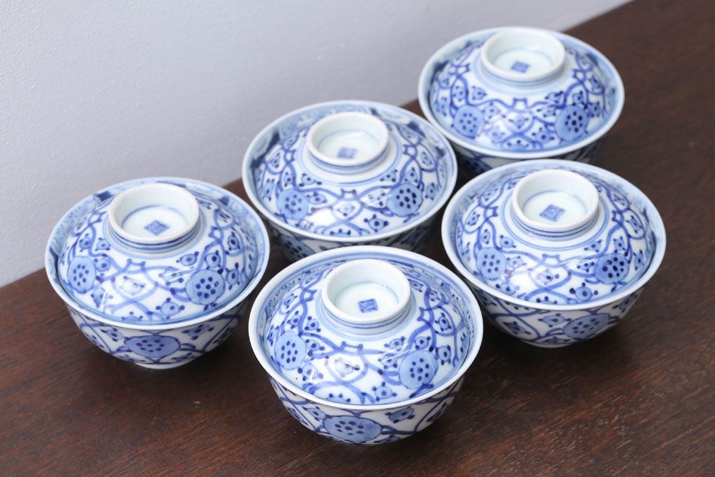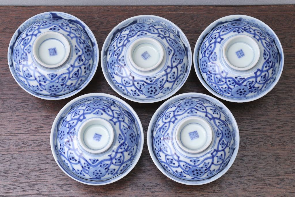 アンティーク雑貨 アンティーク 明治〜大正 染付蓋茶碗5客(1)