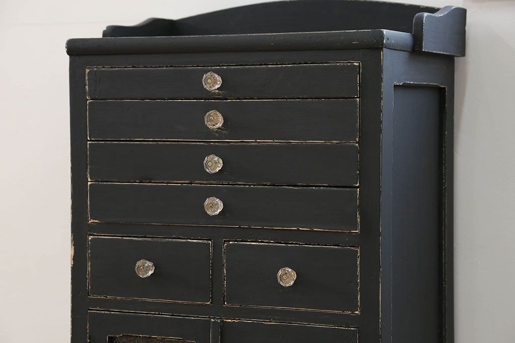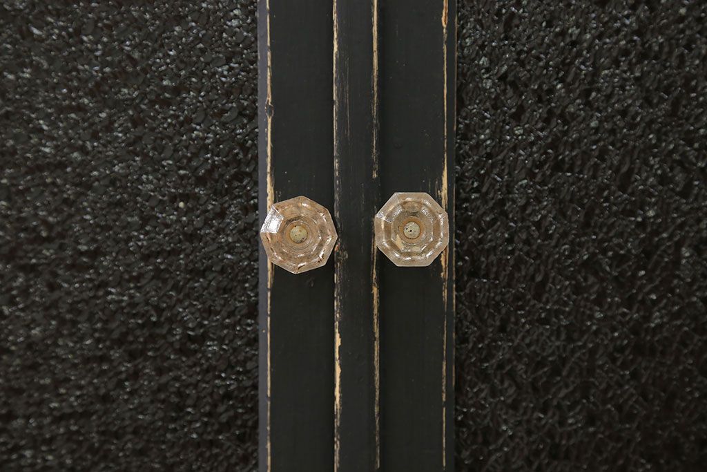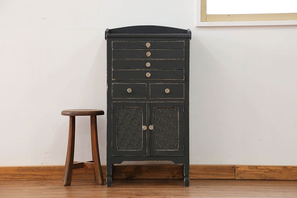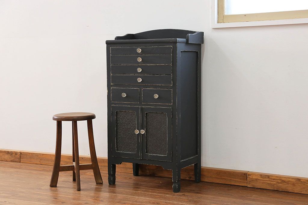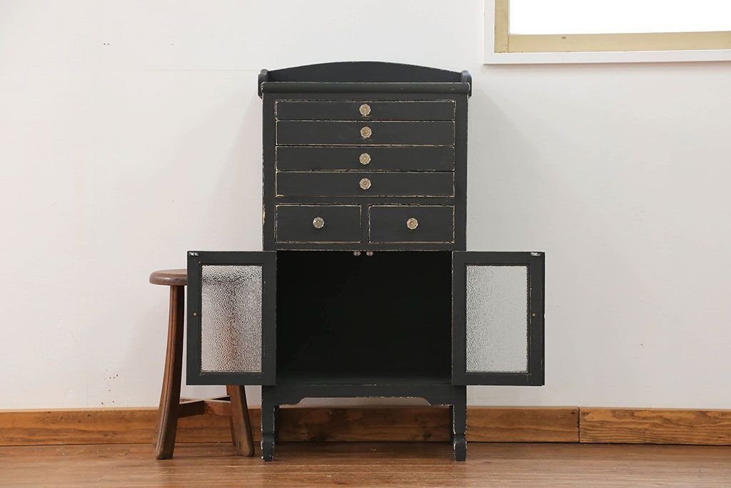 ラフジュ工房> キャビネット・戸棚> 医療用キャビネット・ケビント > アンティーク家具 アンティークペイント ガラスの取っ手付き ダイヤガラスデンタルキャビネット(3)(収納棚、ケビント)