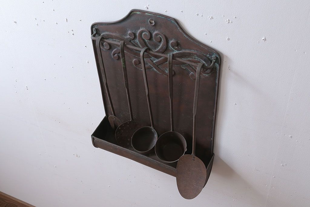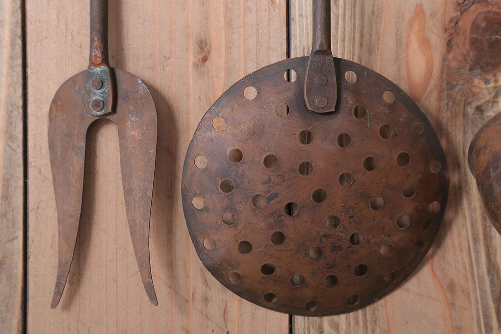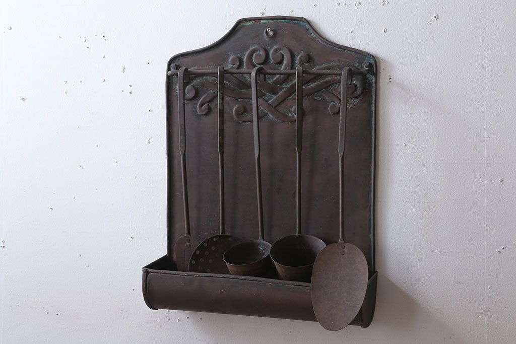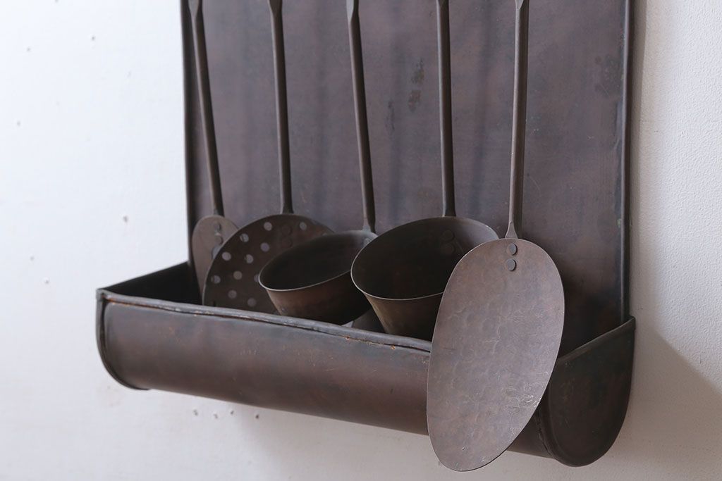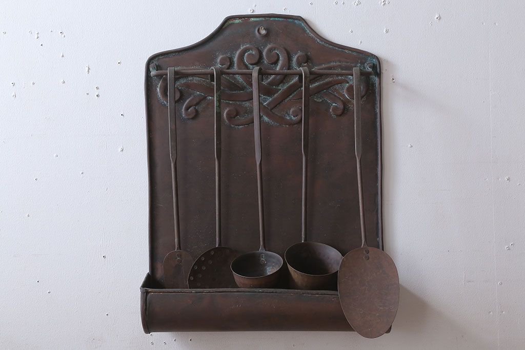 • アンティーク雑貨 イギリスアンティーク 銅のキッチンツールとハンギングラック(レードルラック)