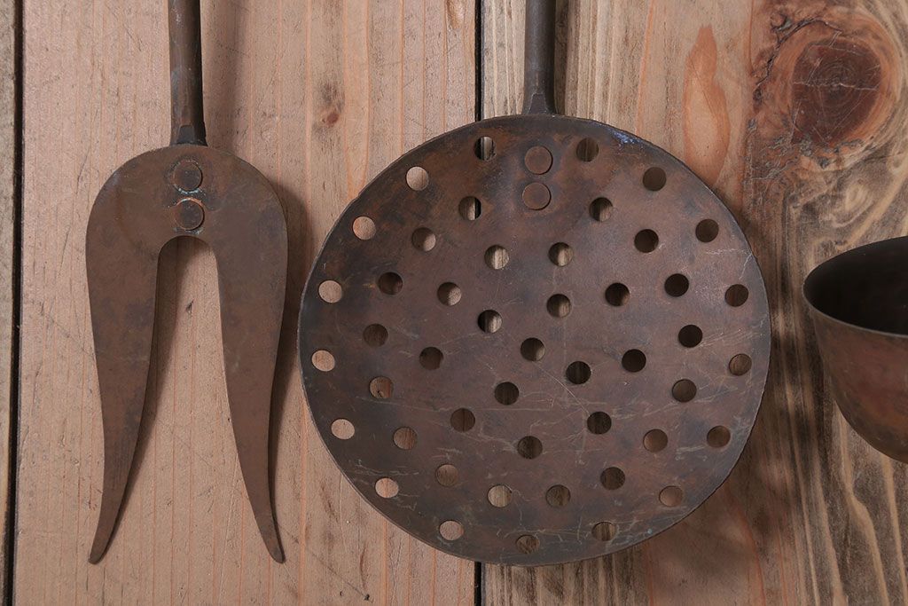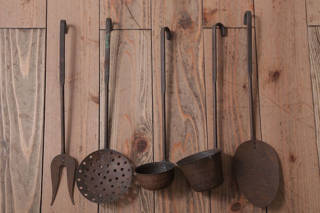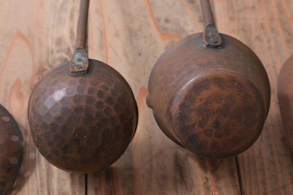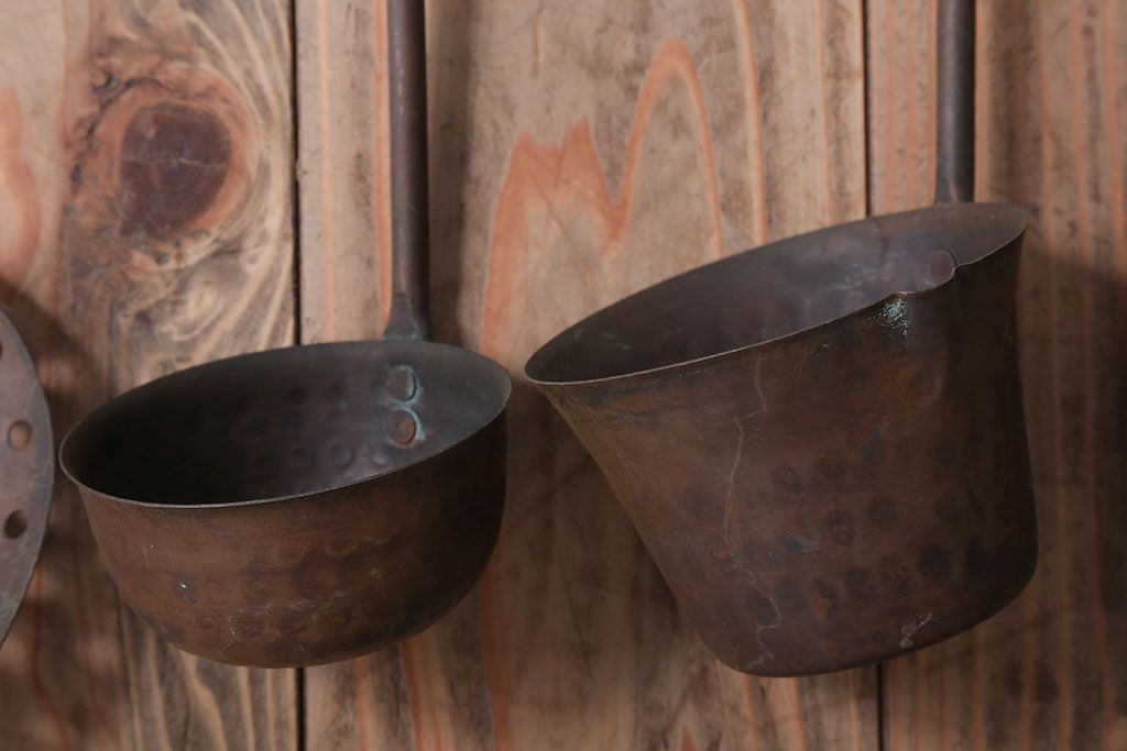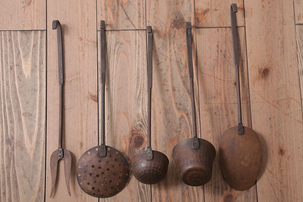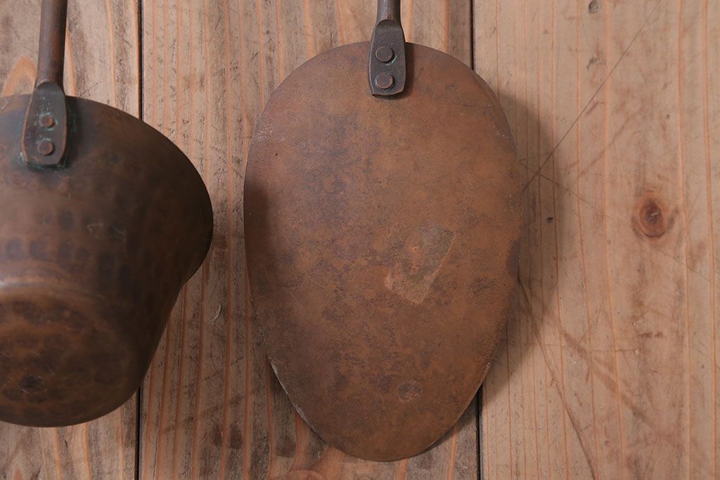 • アンティーク雑貨 イギリスアンティーク 銅のキッチンツールとハンギングラック(レードルラック)