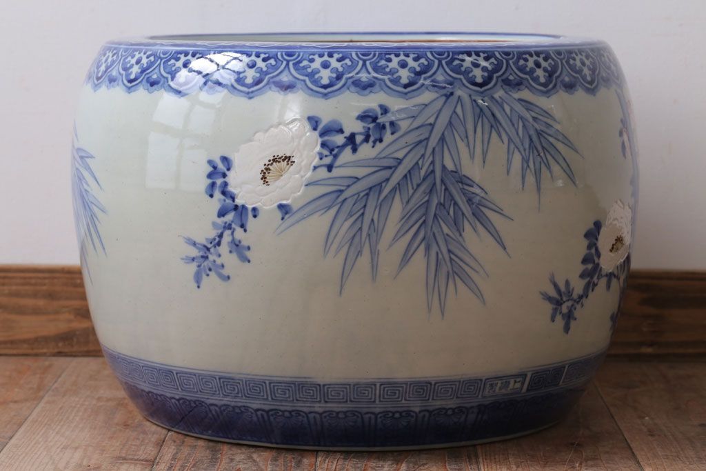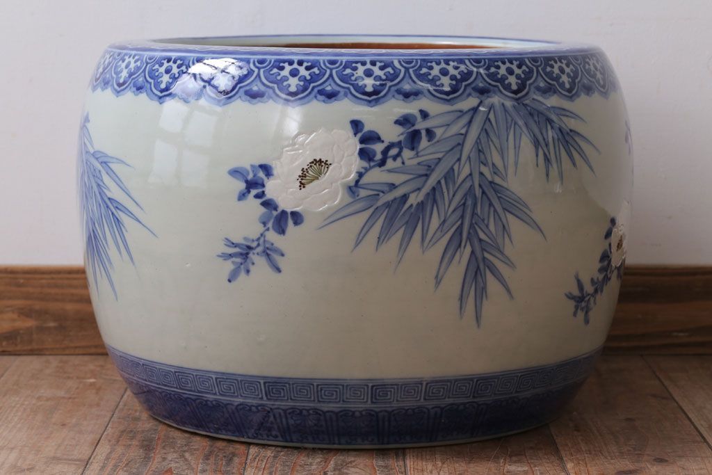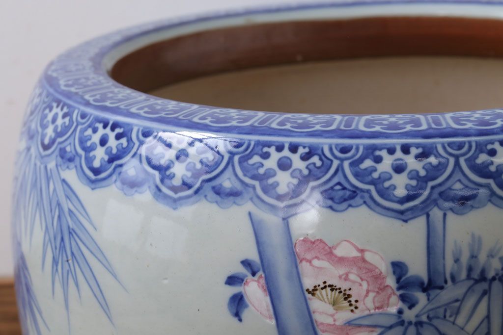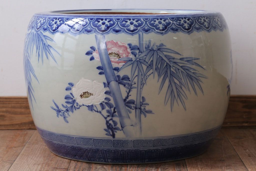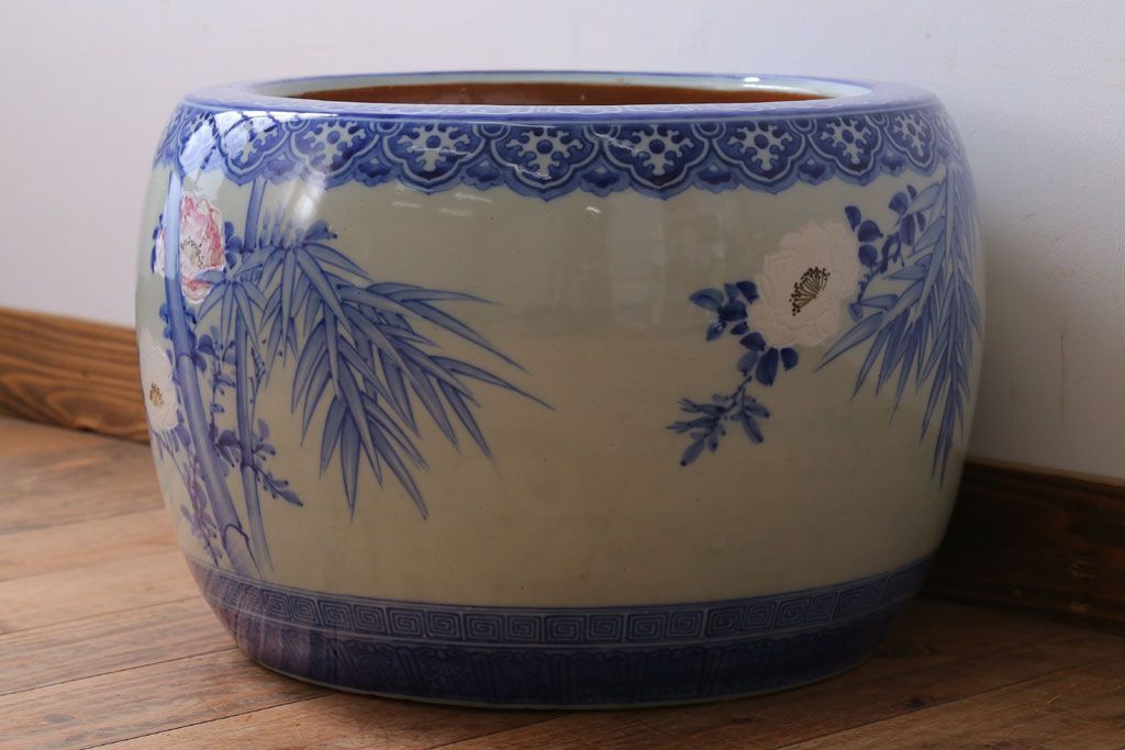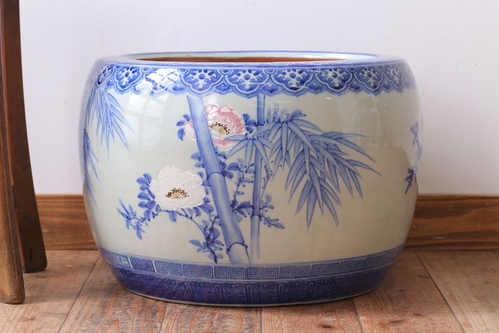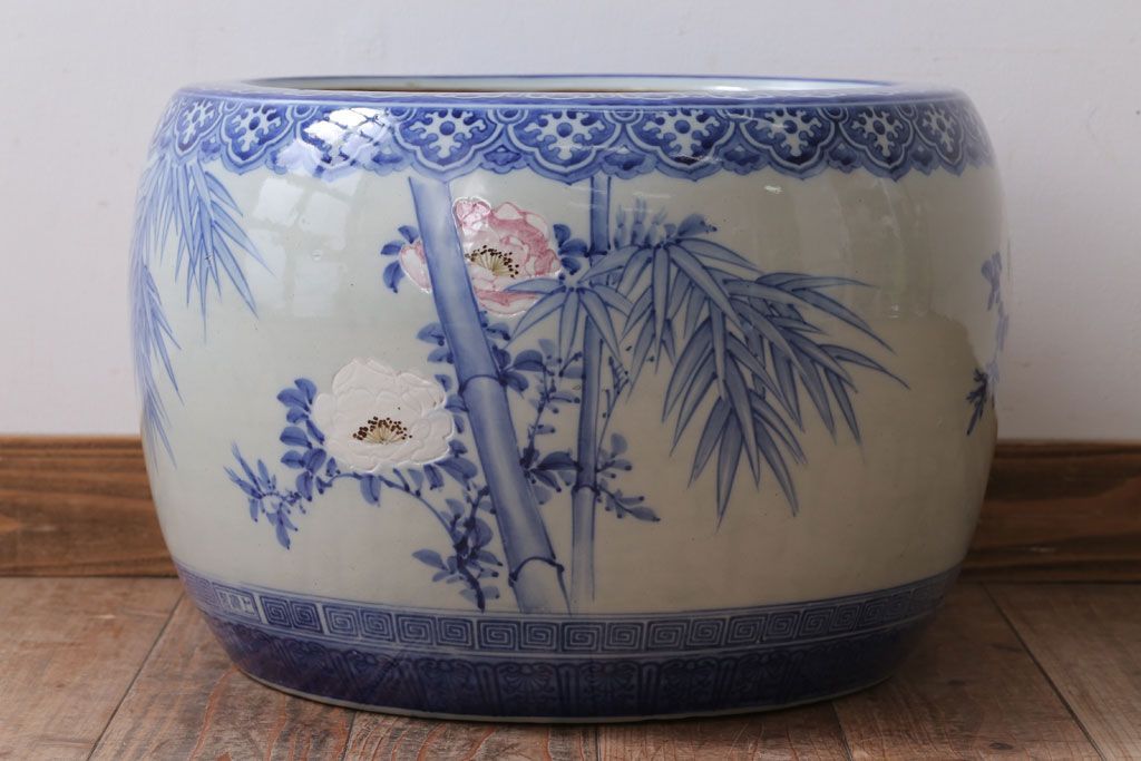 アンティーク雑貨 古民具・骨董 竹に椿の図 アンティーク瀬戸火鉢