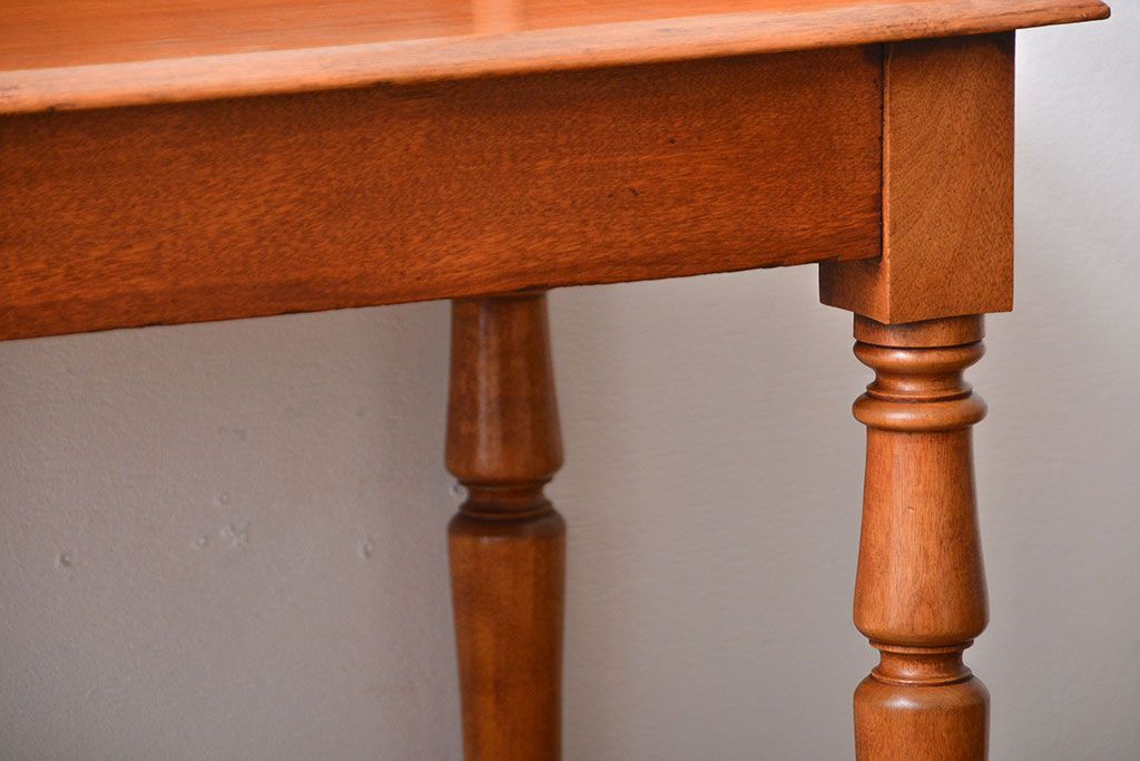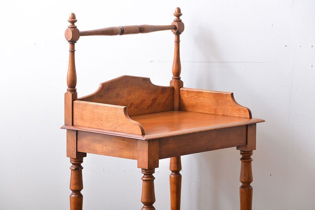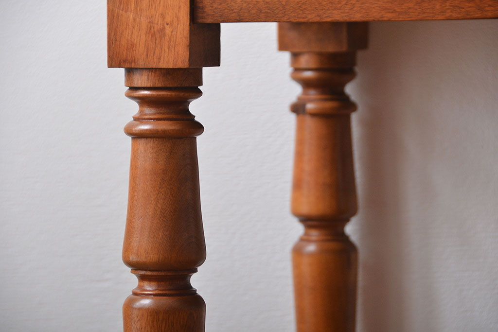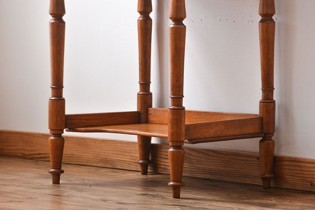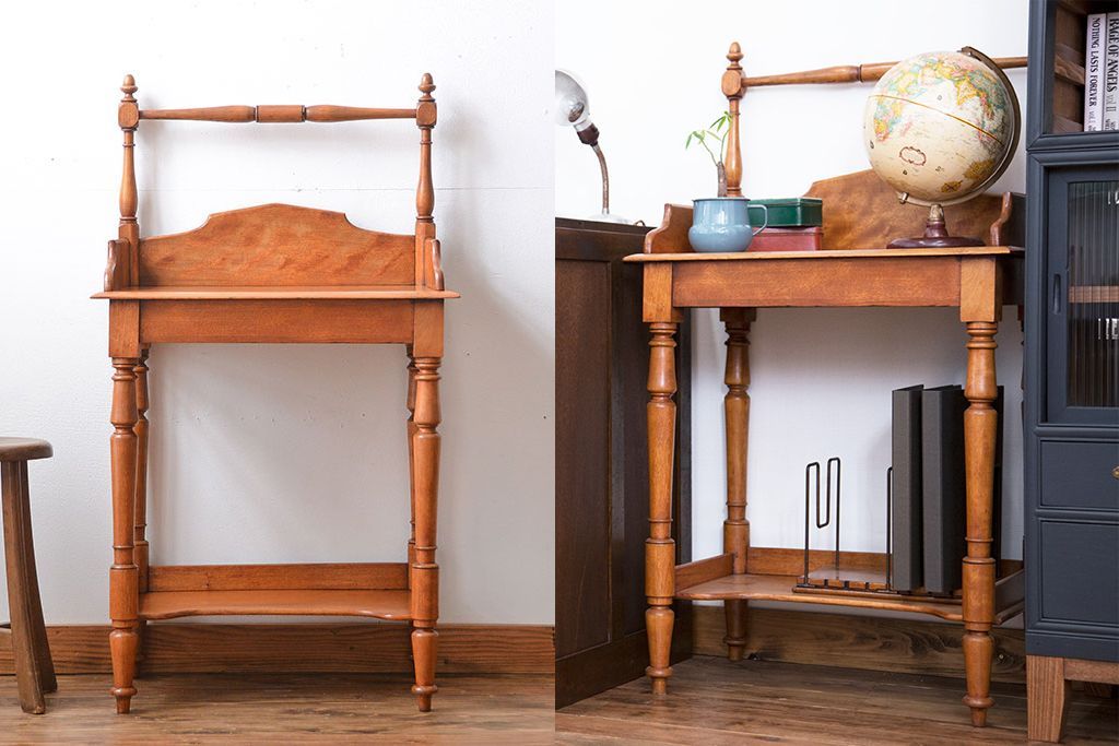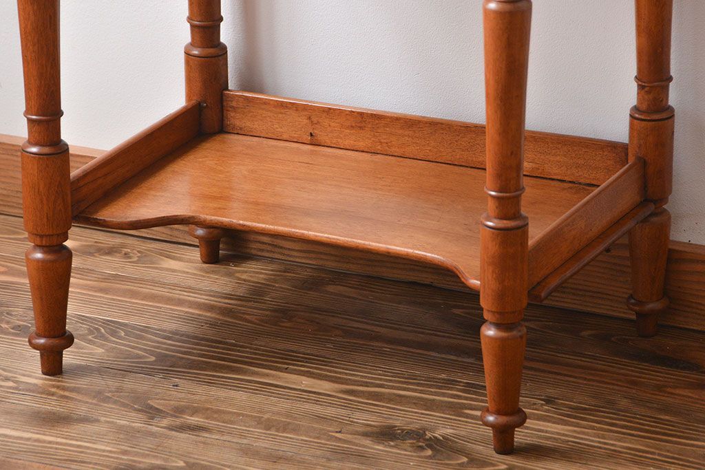 イギリスアンティークのサイドテーブルです。明るい色味の木材が温かな印象を与えます。4本の脚や、上部の天板を飾る柱の優美な装飾が目を引くお品です。挽き物加工の滑らかな木のラインが品の良さを醸し出しています。サイドテーブルではありますが、ディスプレイ台や花台としてインテリアを楽しんだり、デスクとして使用したりと、様々な用途でお使いいただける使い勝手のよいお品です。お部屋に上品さを添えてくれるので、クラシカルなお部屋やブリティッシュカントリーのお部屋に取り入れてみてはいかがでしょうか。
