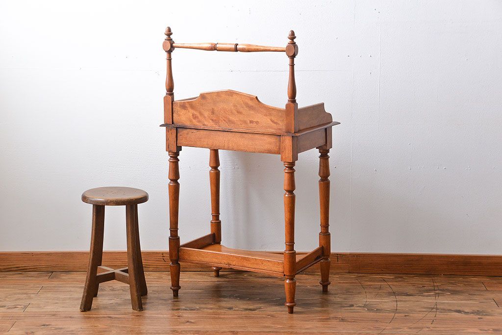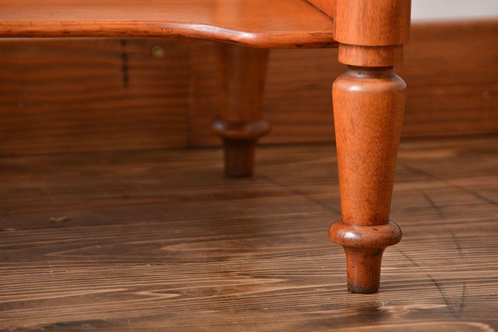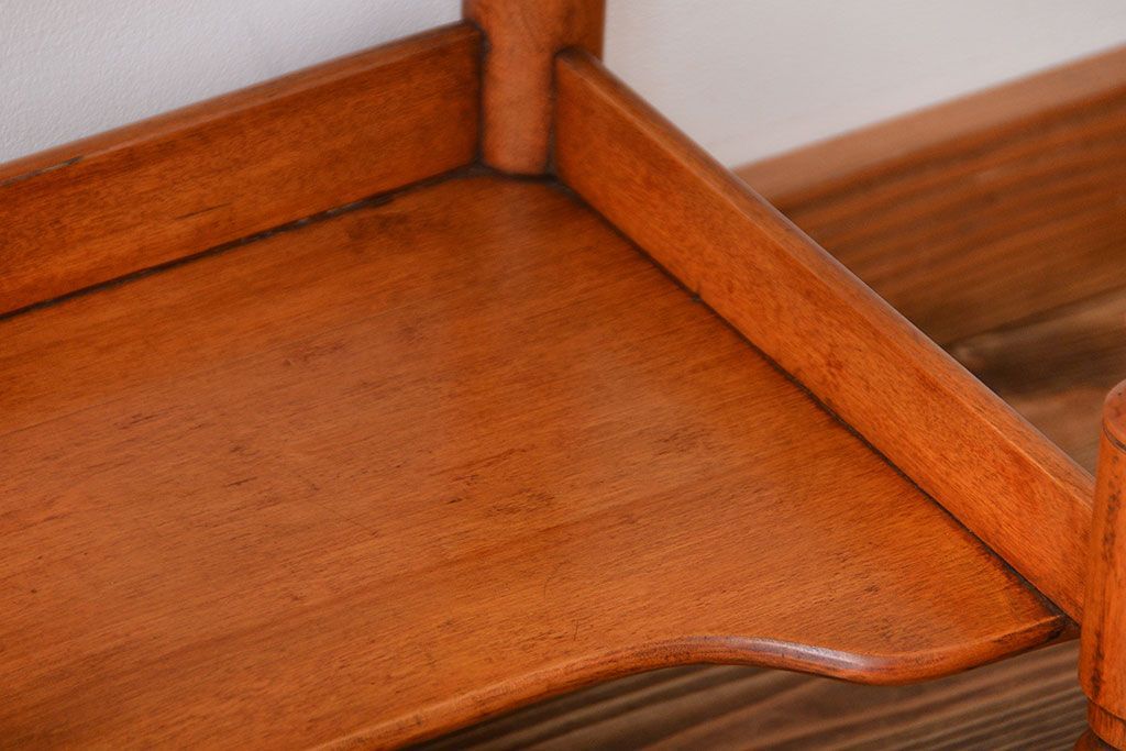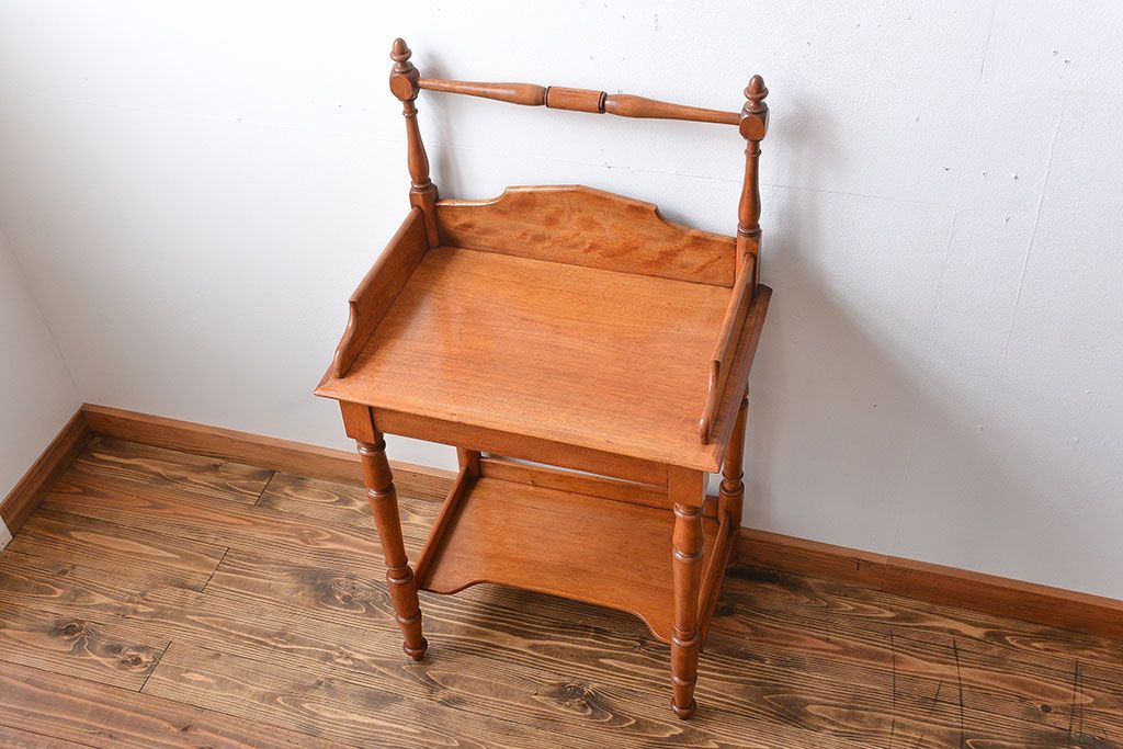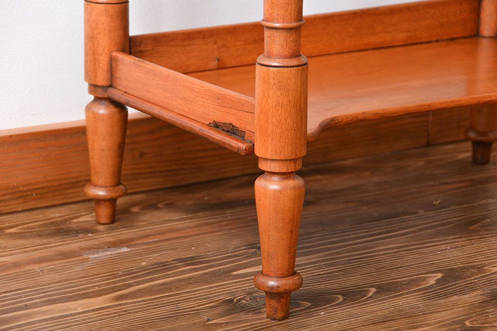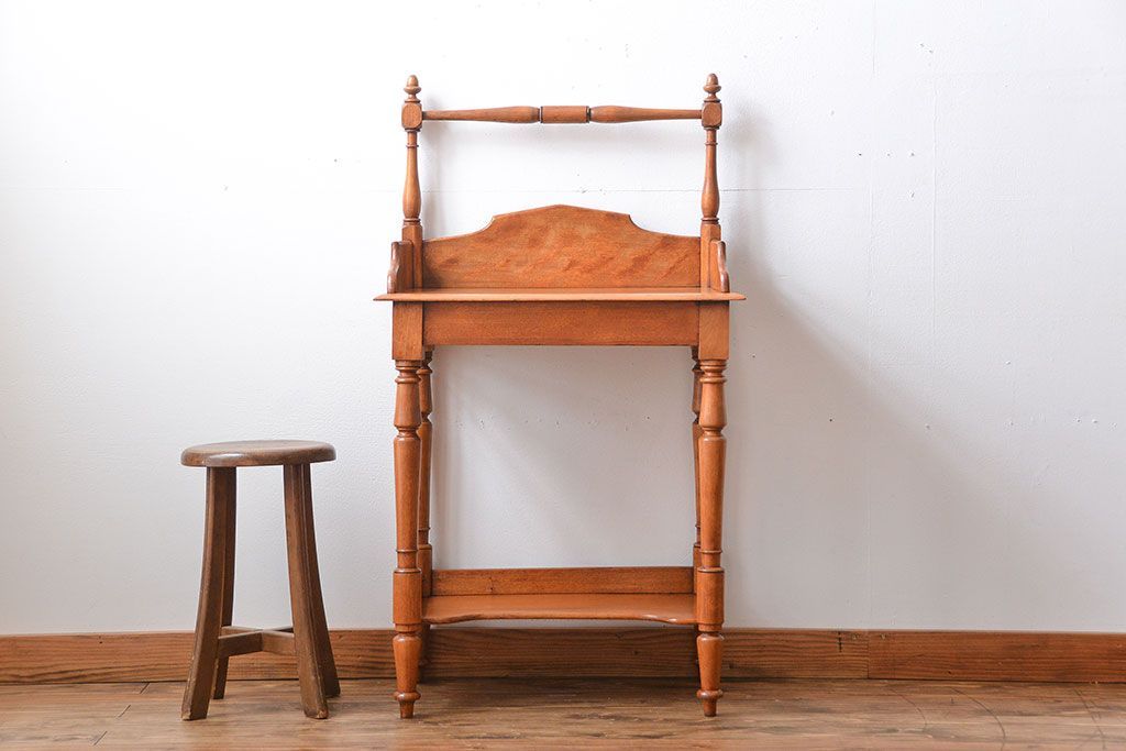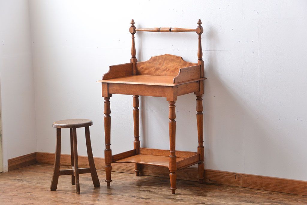 イギリスアンティークのサイドテーブルです。明るい色味の木材が温かな印象を与えます。4本の脚や、上部の天板を飾る柱の優美な装飾が目を引くお品です。挽き物加工の滑らかな木のラインが品の良さを醸し出しています。サイドテーブルではありますが、ディスプレイ台や花台としてインテリアを楽しんだり、デスクとして使用したりと、様々な用途でお使いいただける使い勝手のよいお品です。お部屋に上品さを添えてくれるので、クラシカルなお部屋やブリティッシュカントリーのお部屋に取り入れてみてはいかがでしょうか。