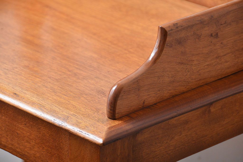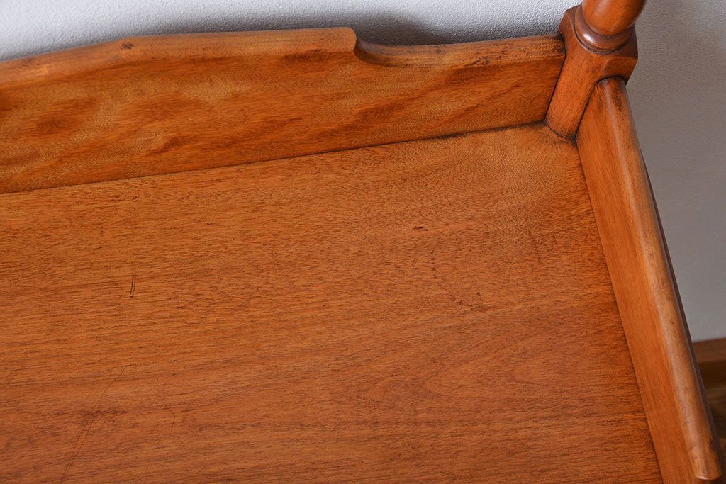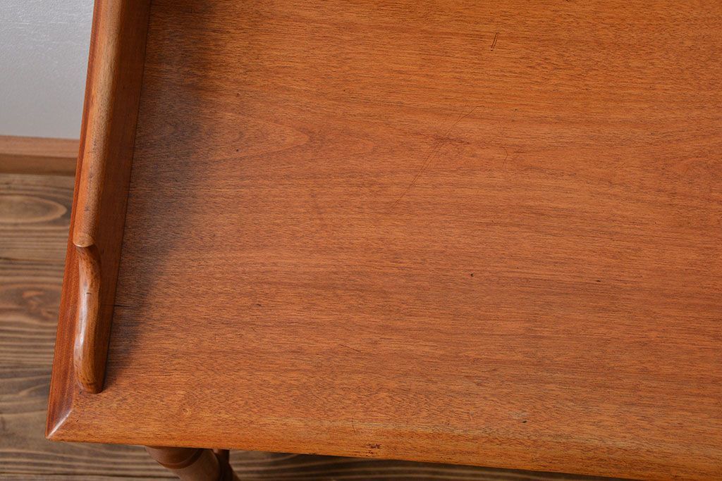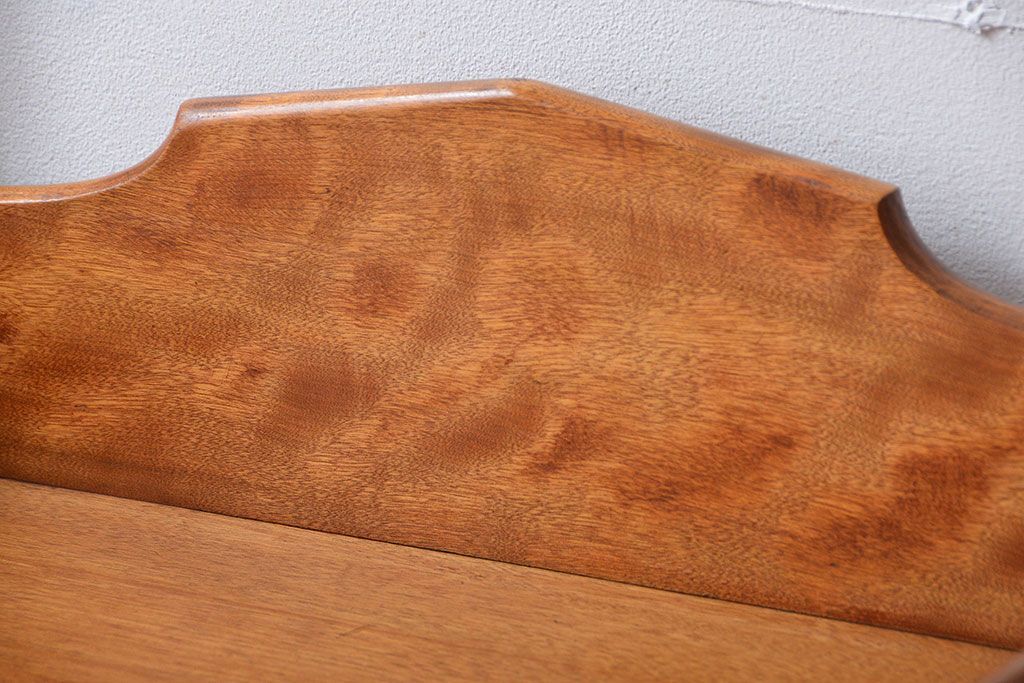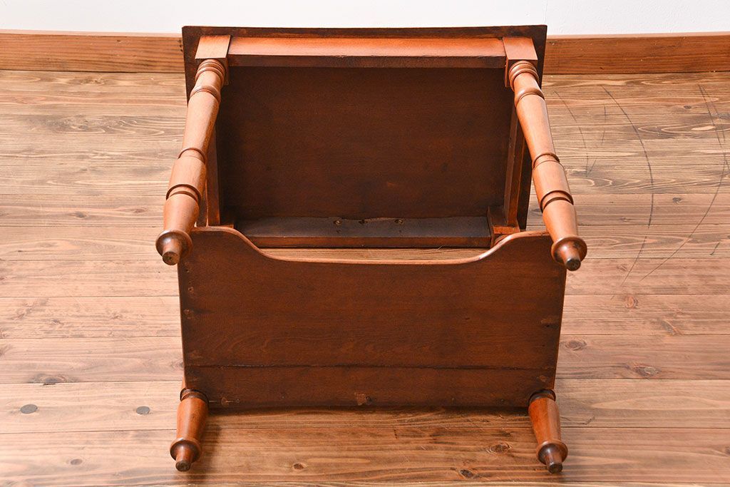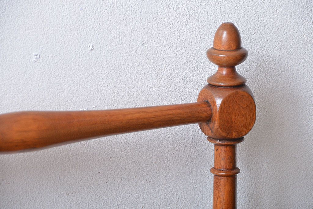 イギリスアンティークのサイドテーブルです。明るい色味の木材が温かな印象を与えます。4本の脚や、上部の天板を飾る柱の優美な装飾が目を引くお品です。挽き物加工の滑らかな木のラインが品の良さを醸し出しています。サイドテーブルではありますが、ディスプレイ台や花台としてインテリアを楽しんだり、デスクとして使用したりと、様々な用途でお使いいただける使い勝手のよいお品です。お部屋に上品さを添えてくれるので、クラシカルなお部屋やブリティッシュカントリーのお部屋に取り入れてみてはいかがでしょうか。