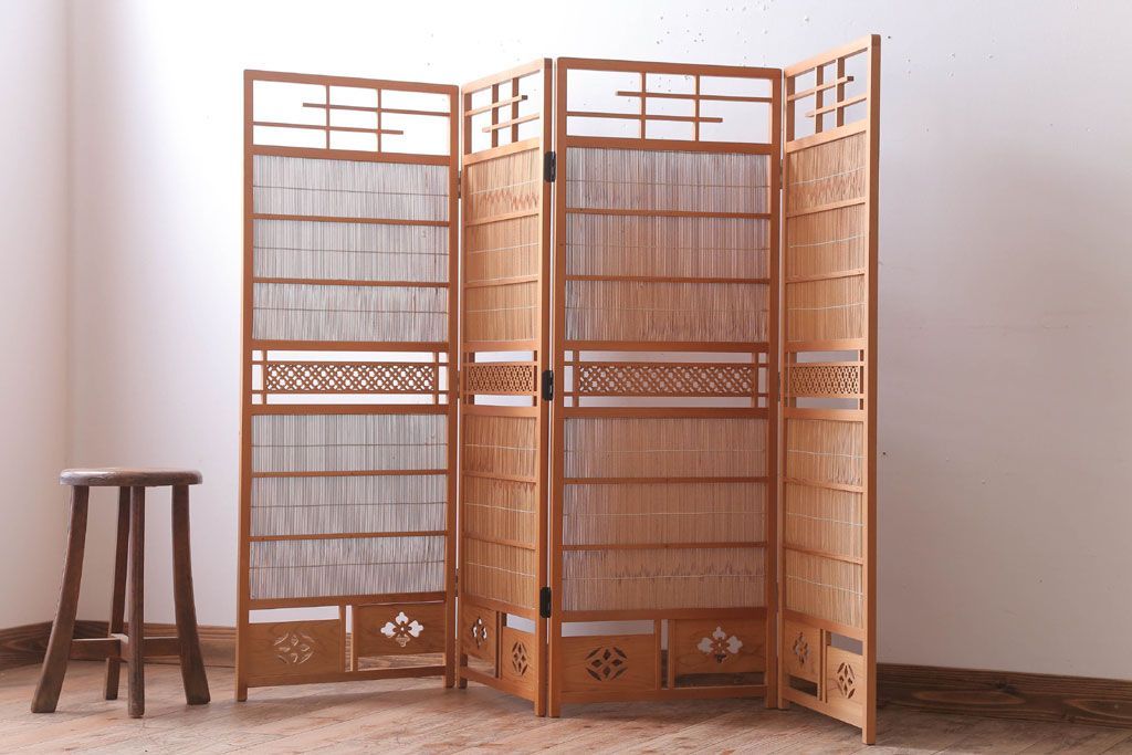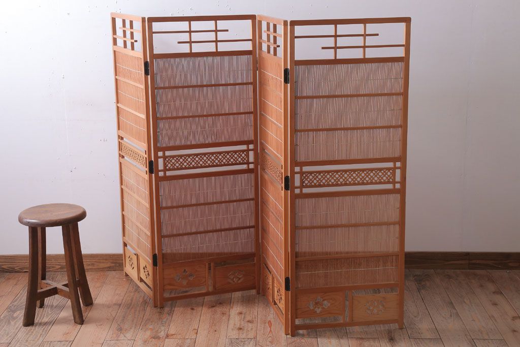 ラフジュ工房> 衝立・パーテーション> 折りたたみパーテーション > アンティーク雑貨 古民具・骨董 古い木味の四連屏風衝立て(パーテーション)(2)