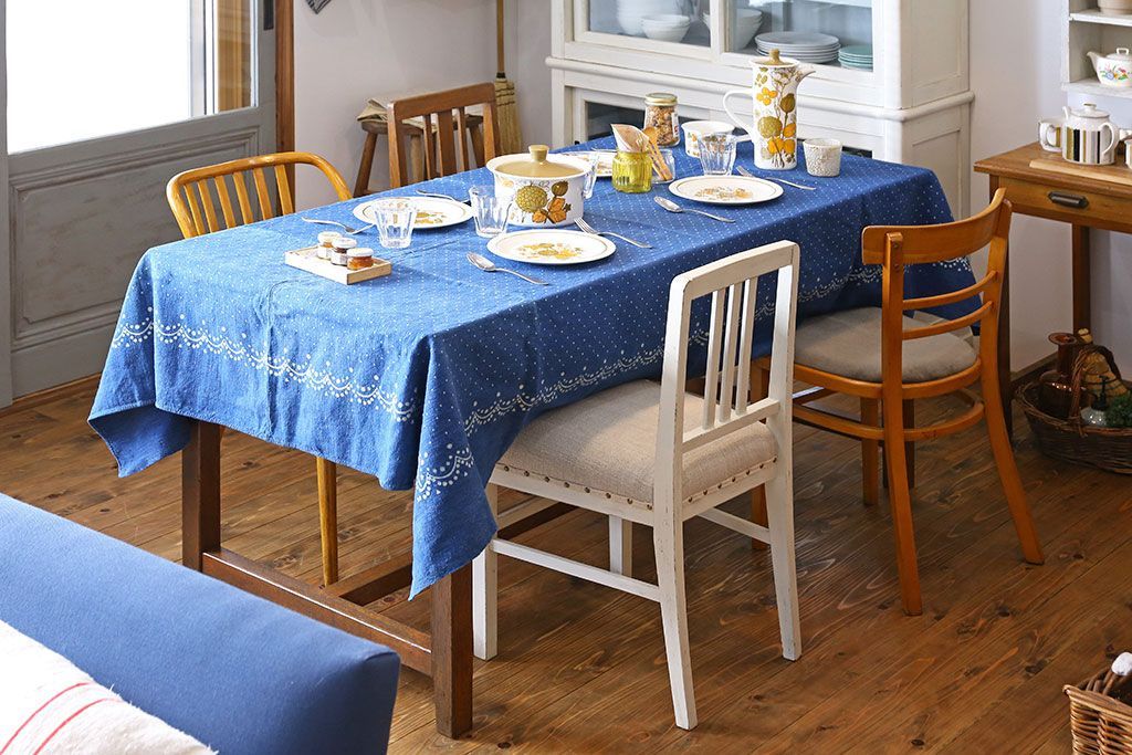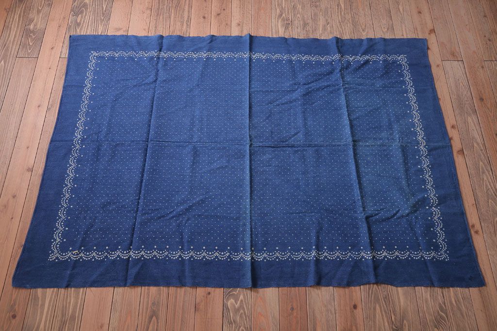 アンティーク雑貨 アンティーク インディゴ(藍)染めハンガリーリネンのテーブルクロス(ドット&レース柄)