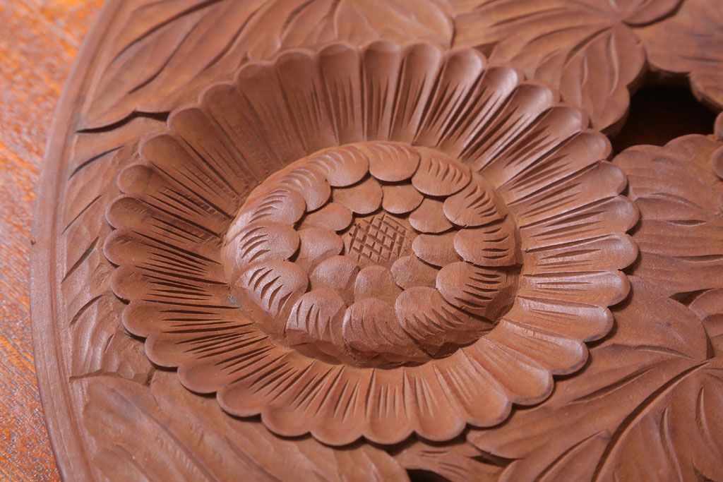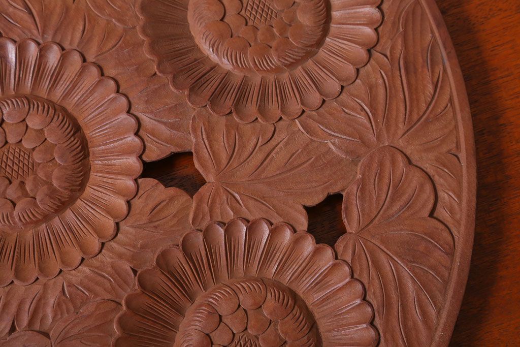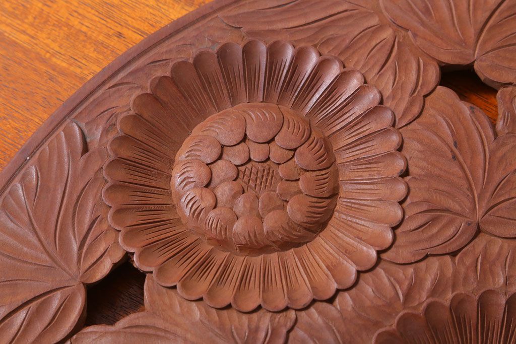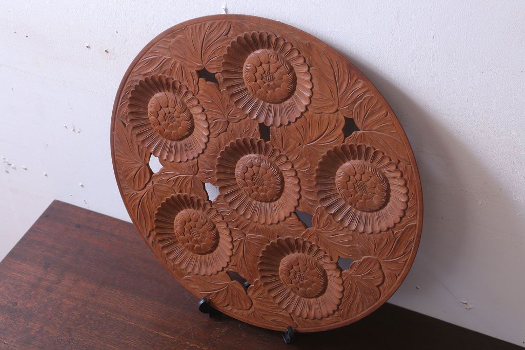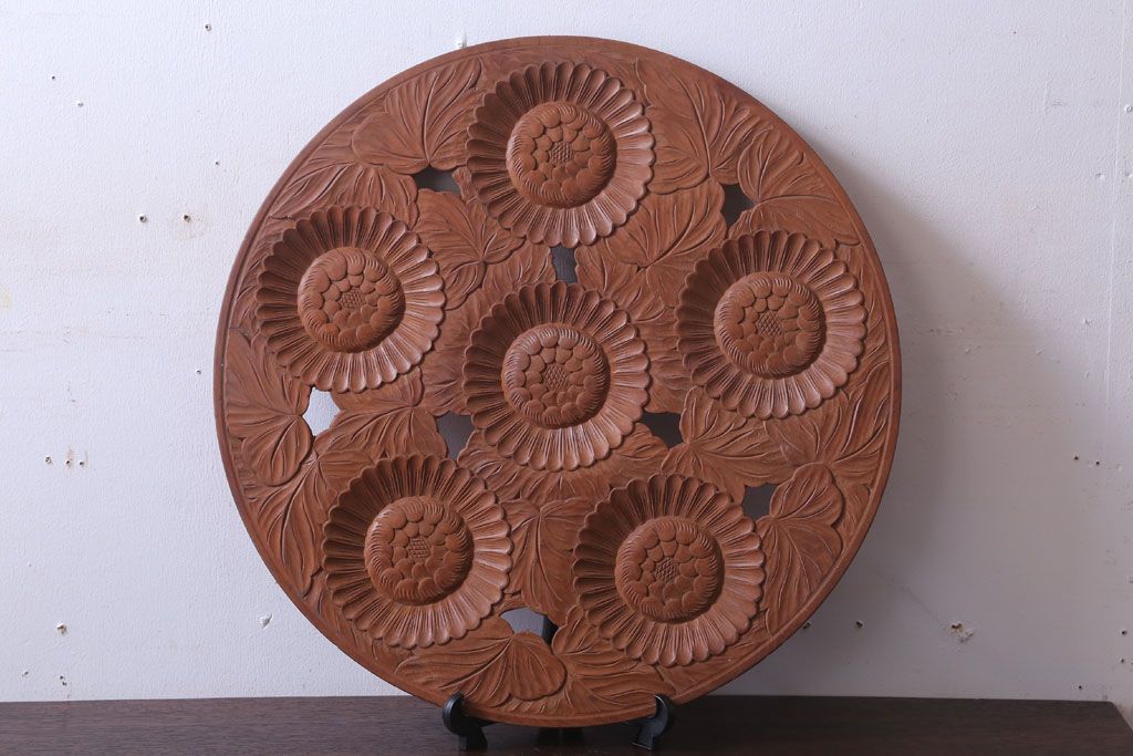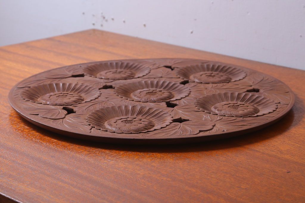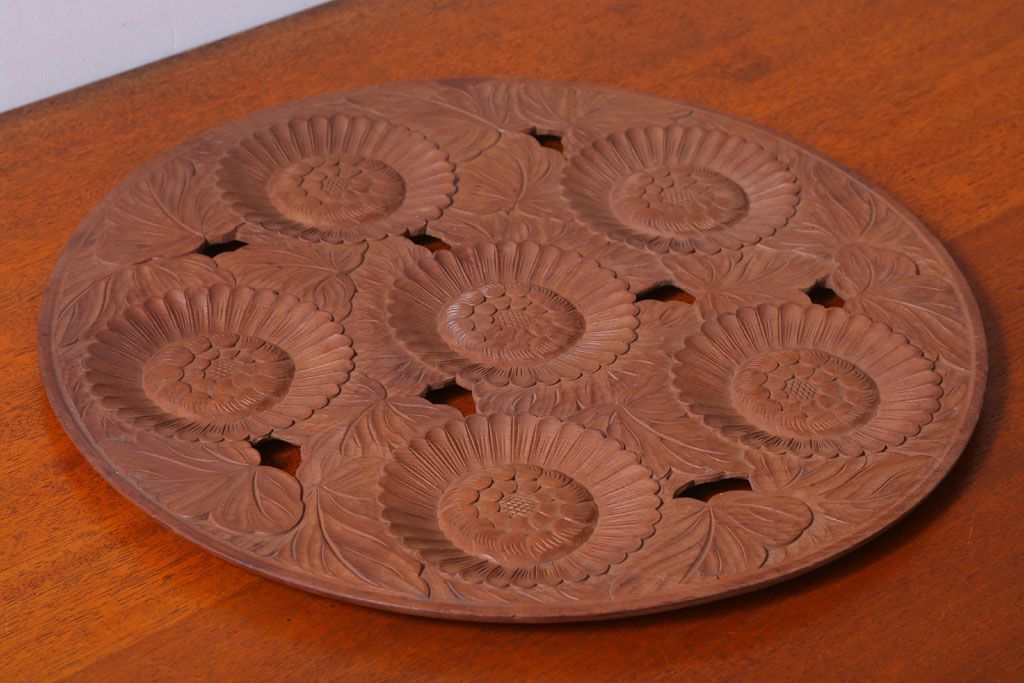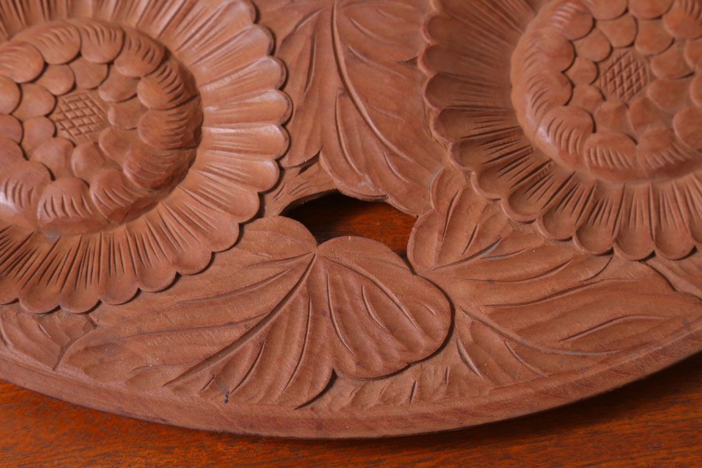 ラフジュ工房> 民芸家具 > アンティーク雑貨 和製アンティーク ひまわり柄の古い木彫りプレート(盆)(軽井沢彫・日光彫)