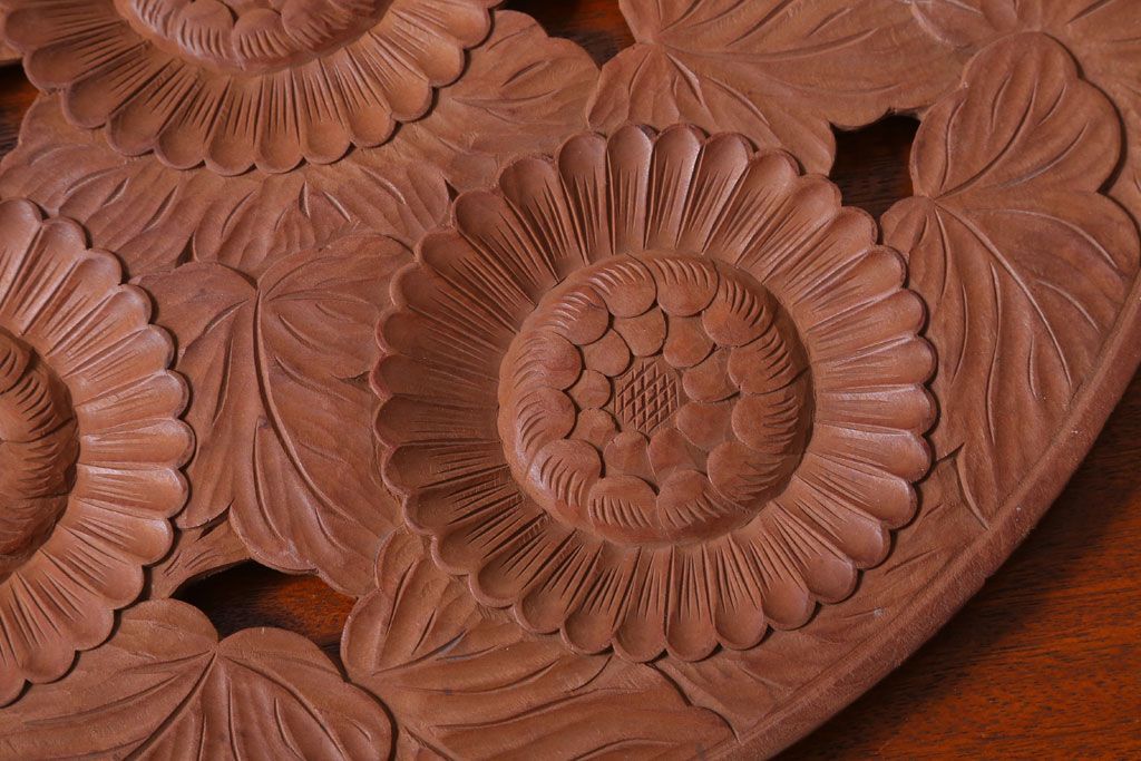ラフジュ工房> 雑貨> オブジェ > アンティーク雑貨 和製アンティーク ひまわり柄の古い木彫りプレート(盆)(軽井沢彫・日光彫)