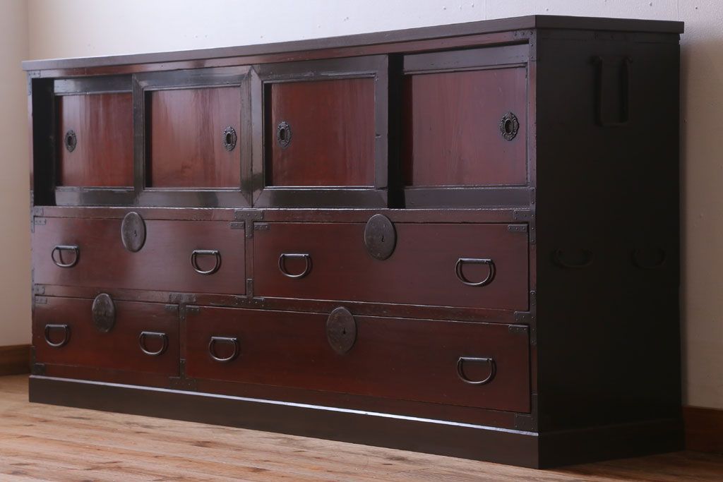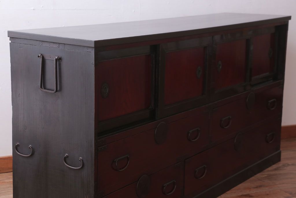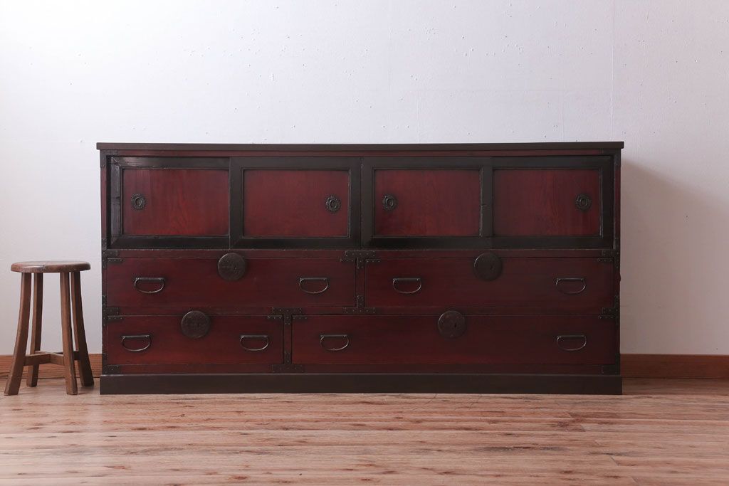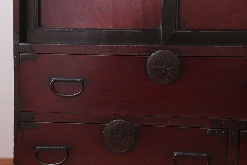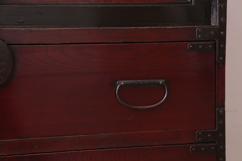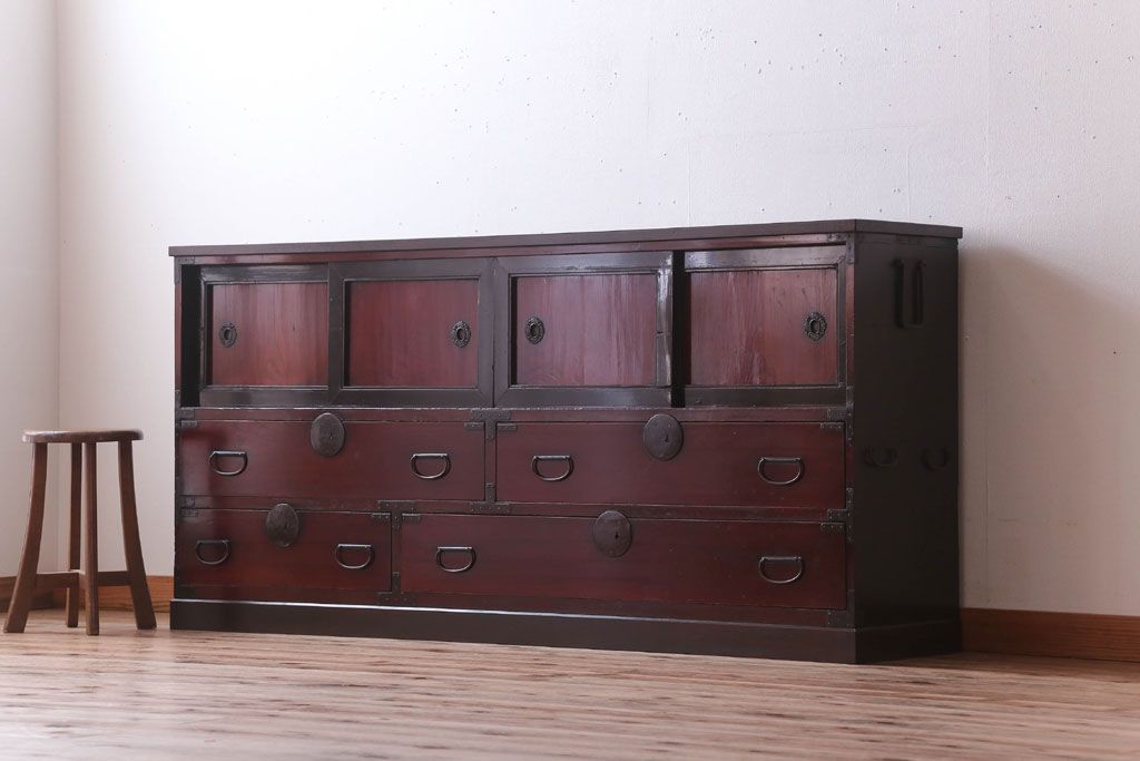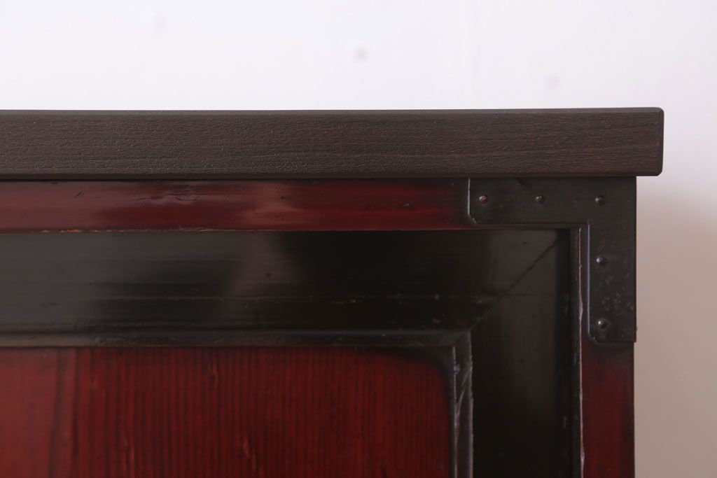 アンティーク家具 古民具・骨董 明治〜大正 前面欅材の漆塗り大川箪笥(水屋箪笥)