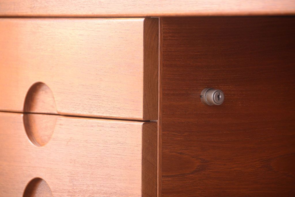 引き出し1段目専用の鍵が付属します。鍵をかける際は、鍵穴を押しながら回してください。スムーズに動きます。