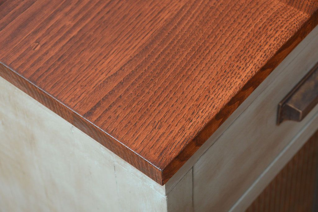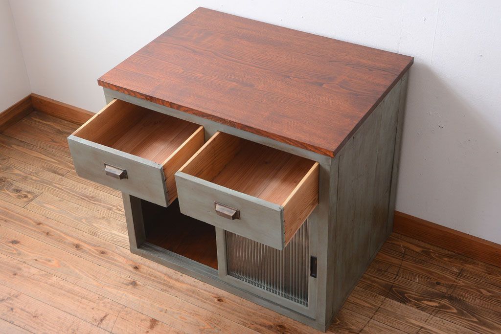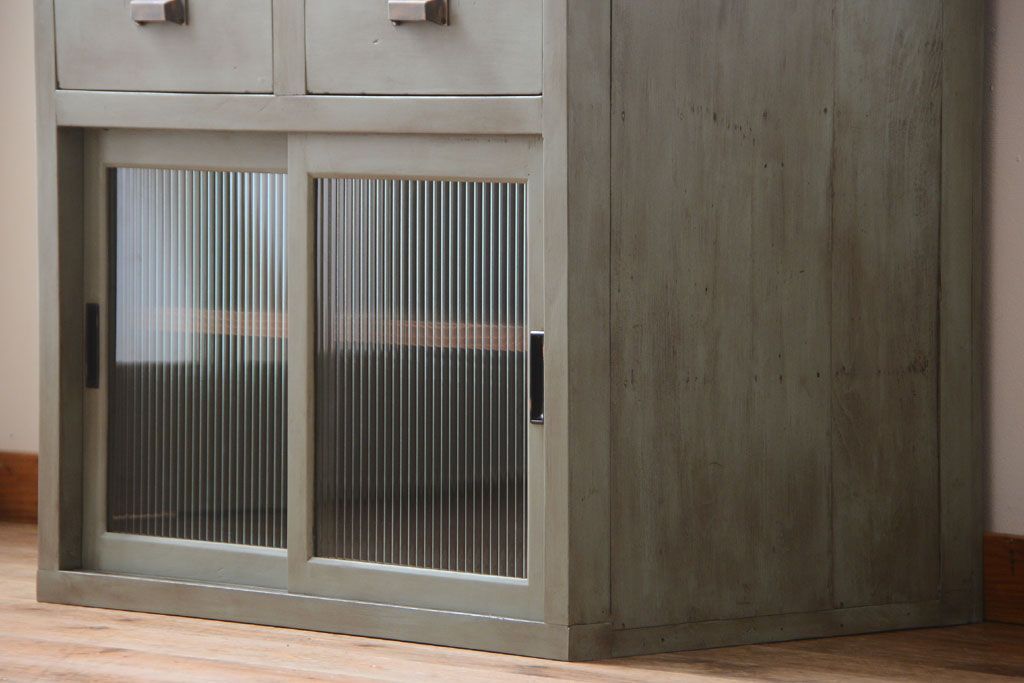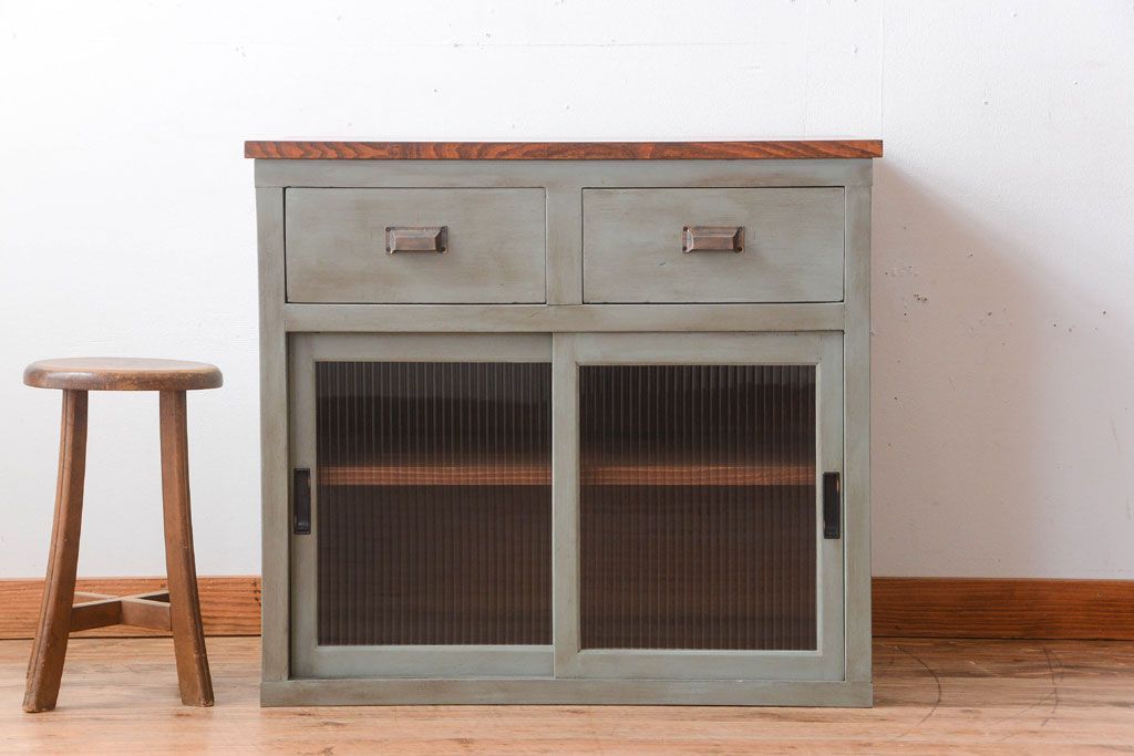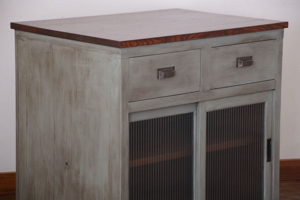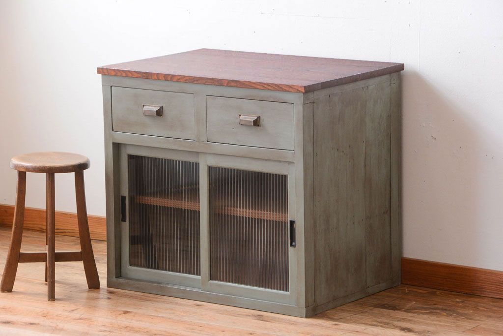 ラフジュ工房> キャビネット・戸棚> 食器棚・カップボード > アンティーク家具 アンティークペイント モールガラス入り!天板オーク材の収納棚(カウンターテーブル)