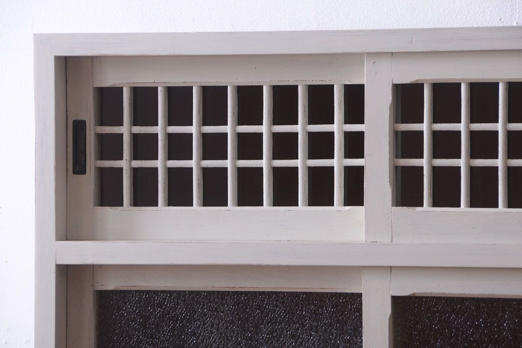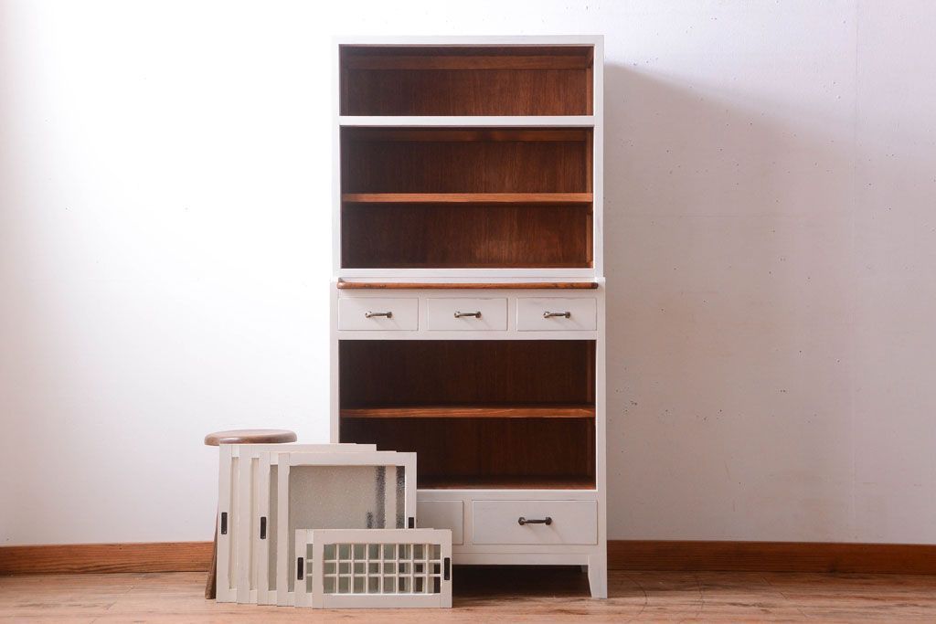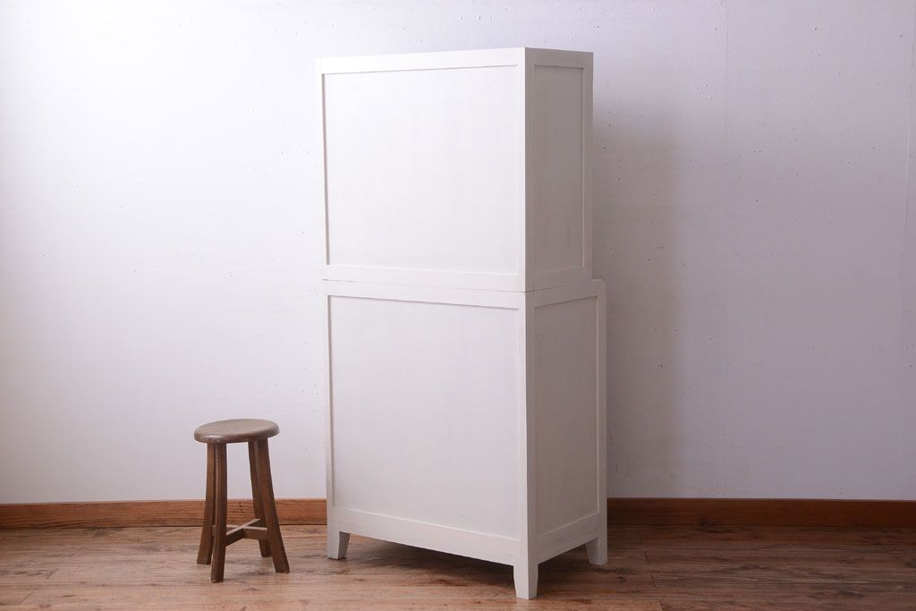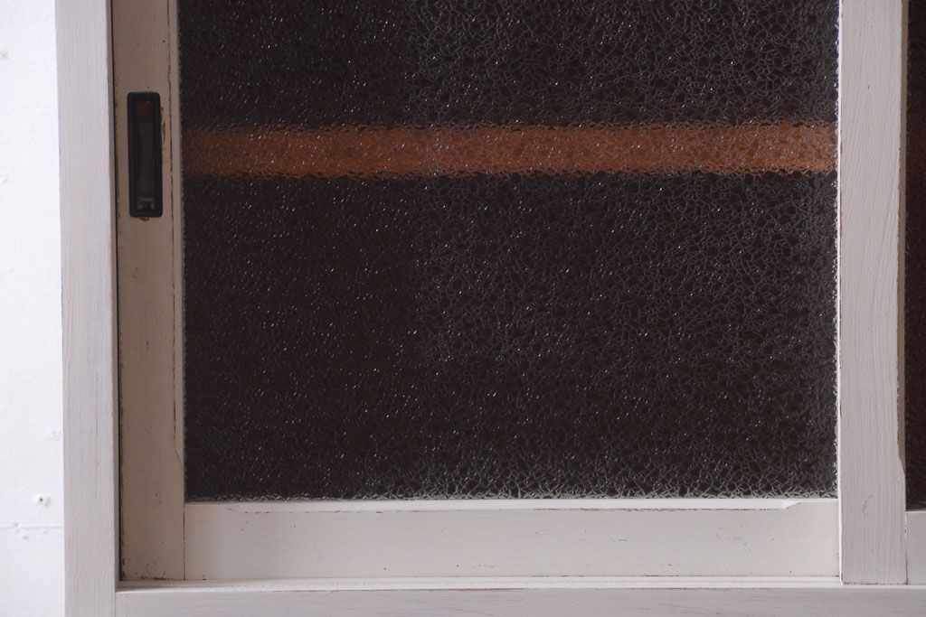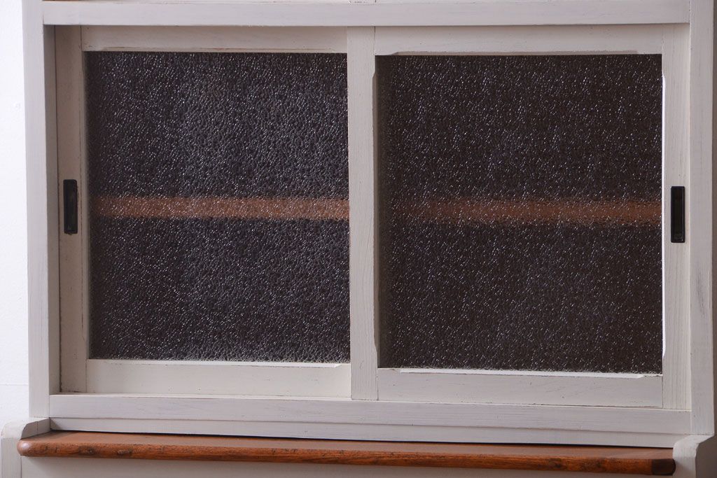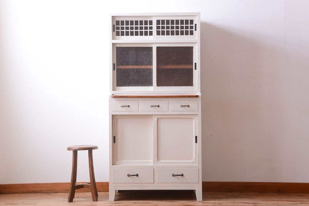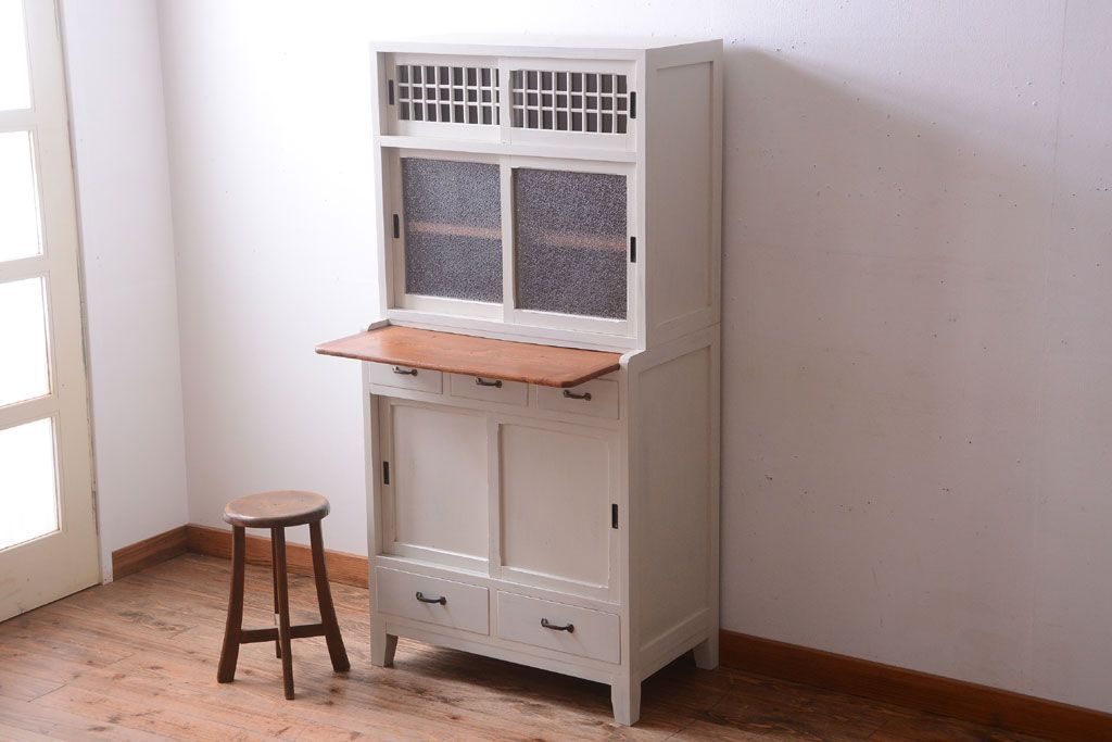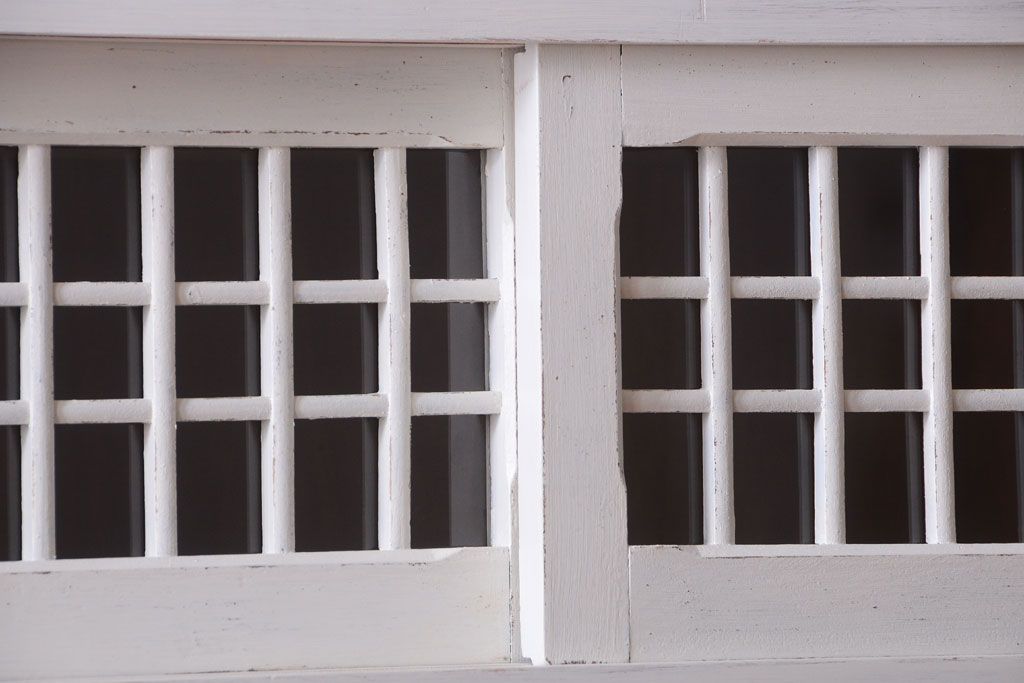 アンティーク家具 アンティークペイント ダイヤガラス入り!脚付き重ね食器棚