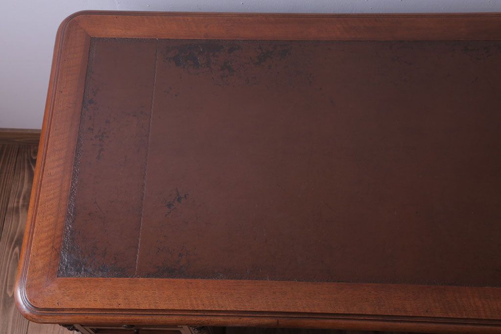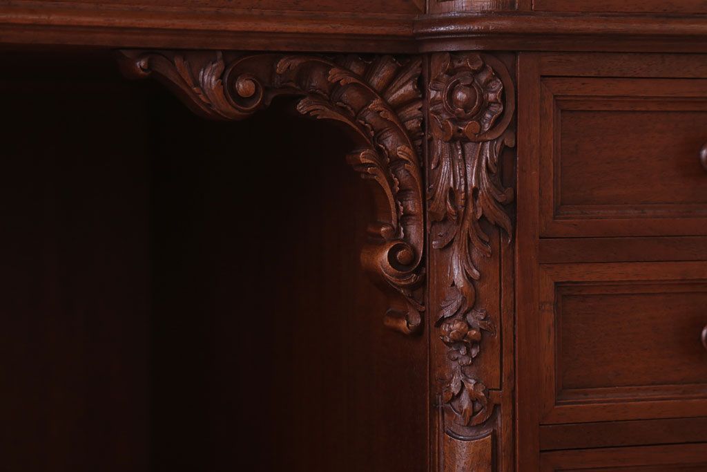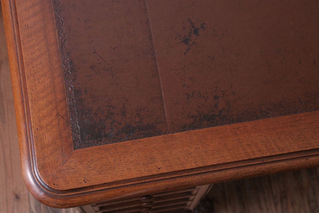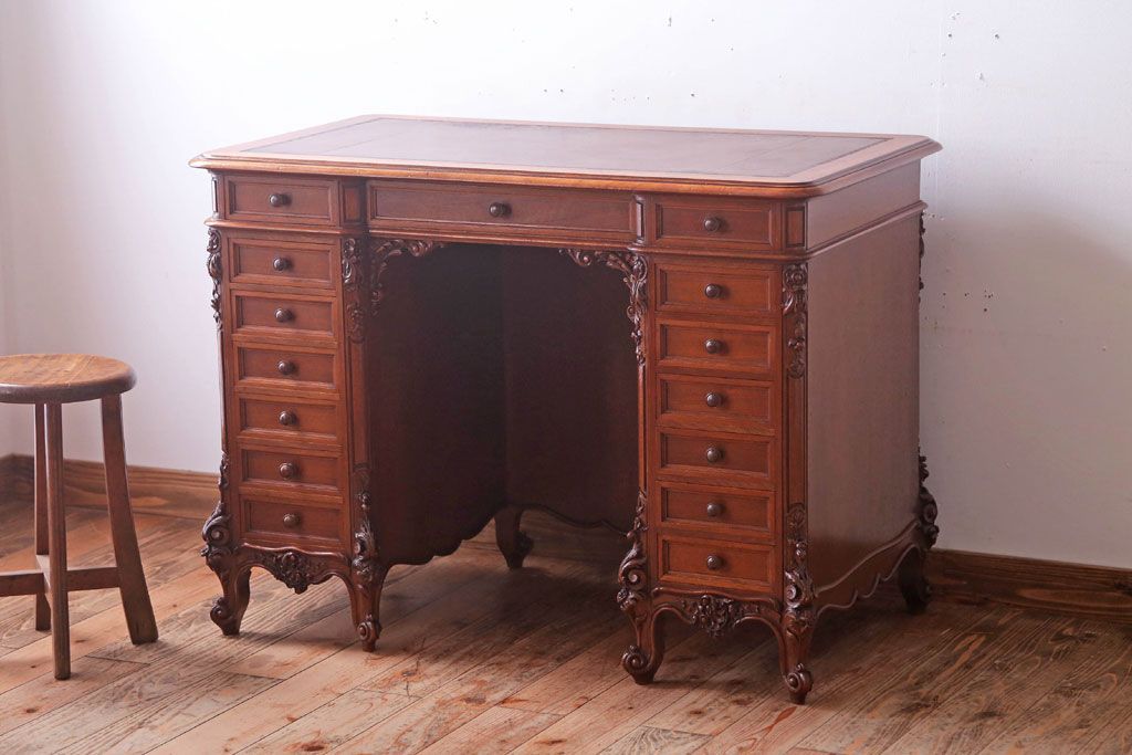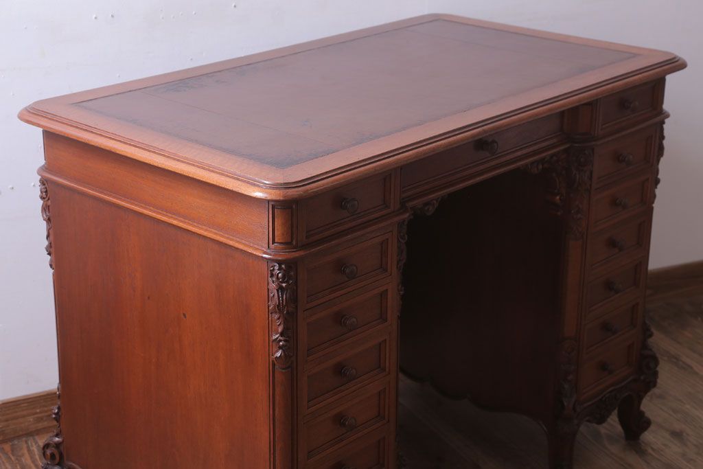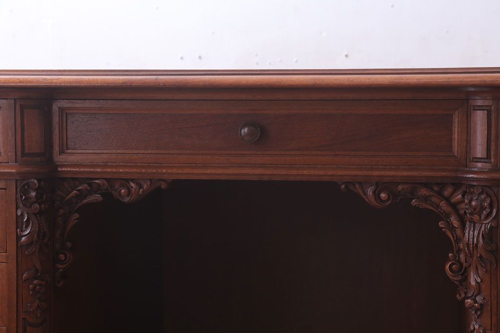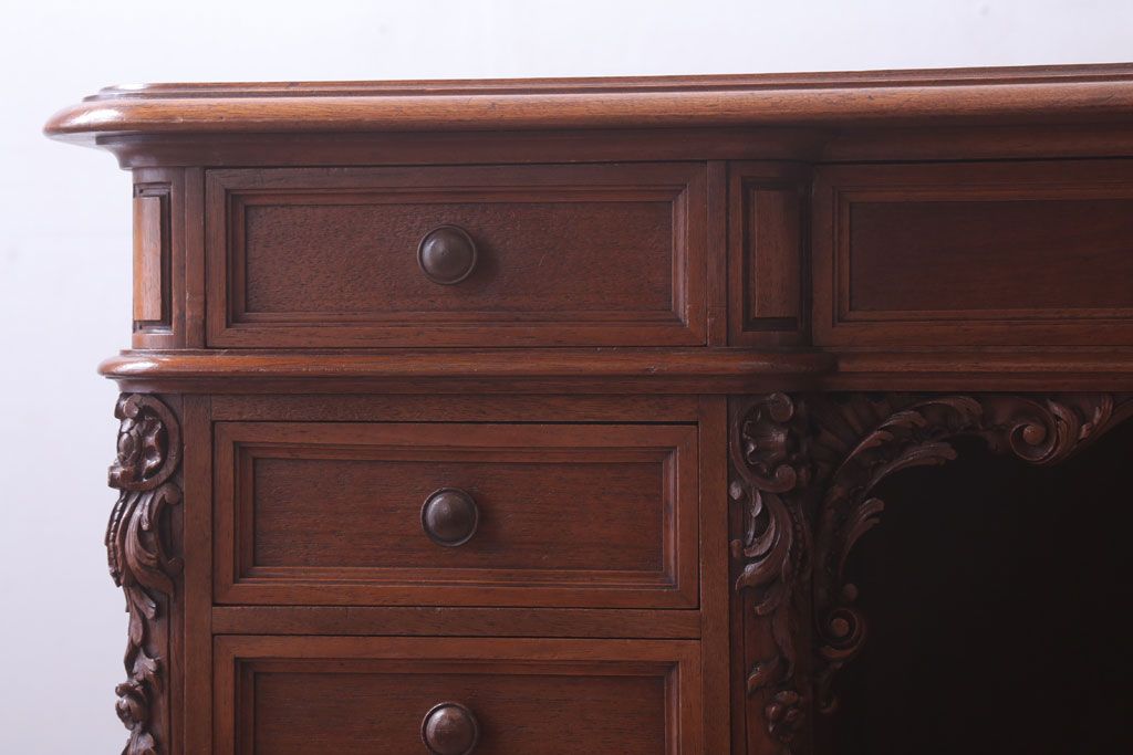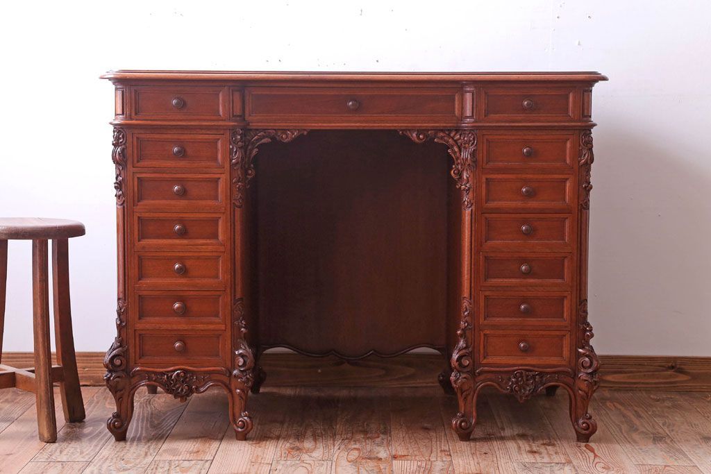 アンティーク家具 イギリスアンティーク マホガニー・オーク材製 上品な彫刻の最高級両袖デスク(両袖机)