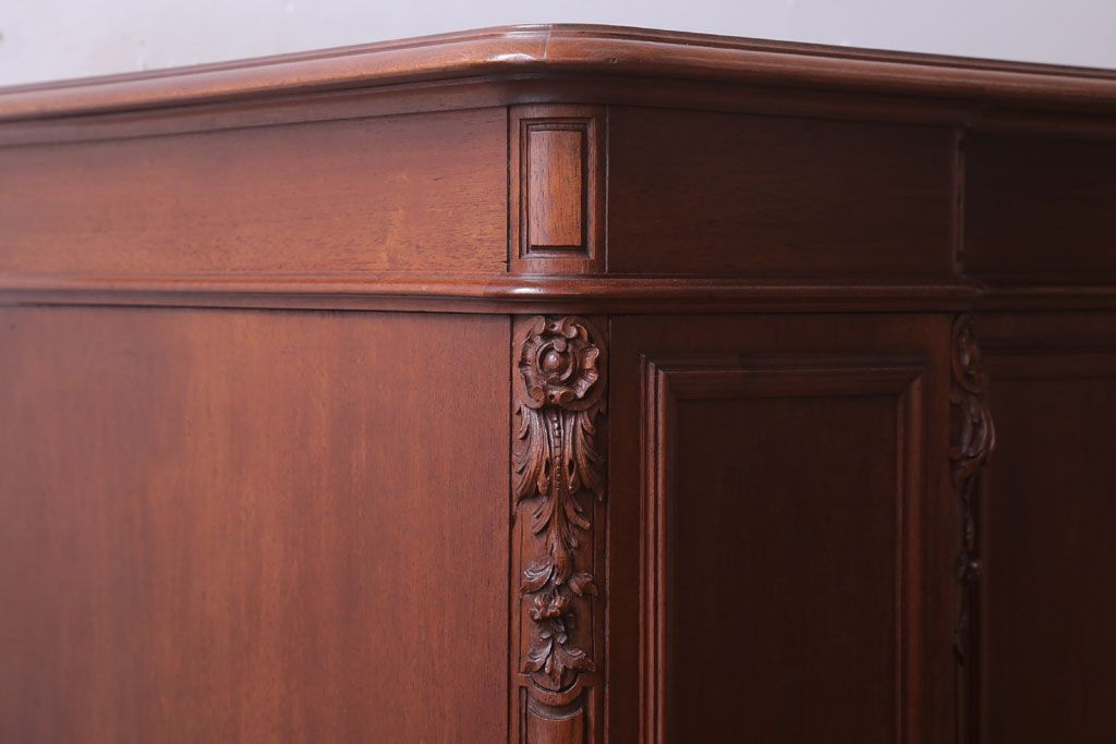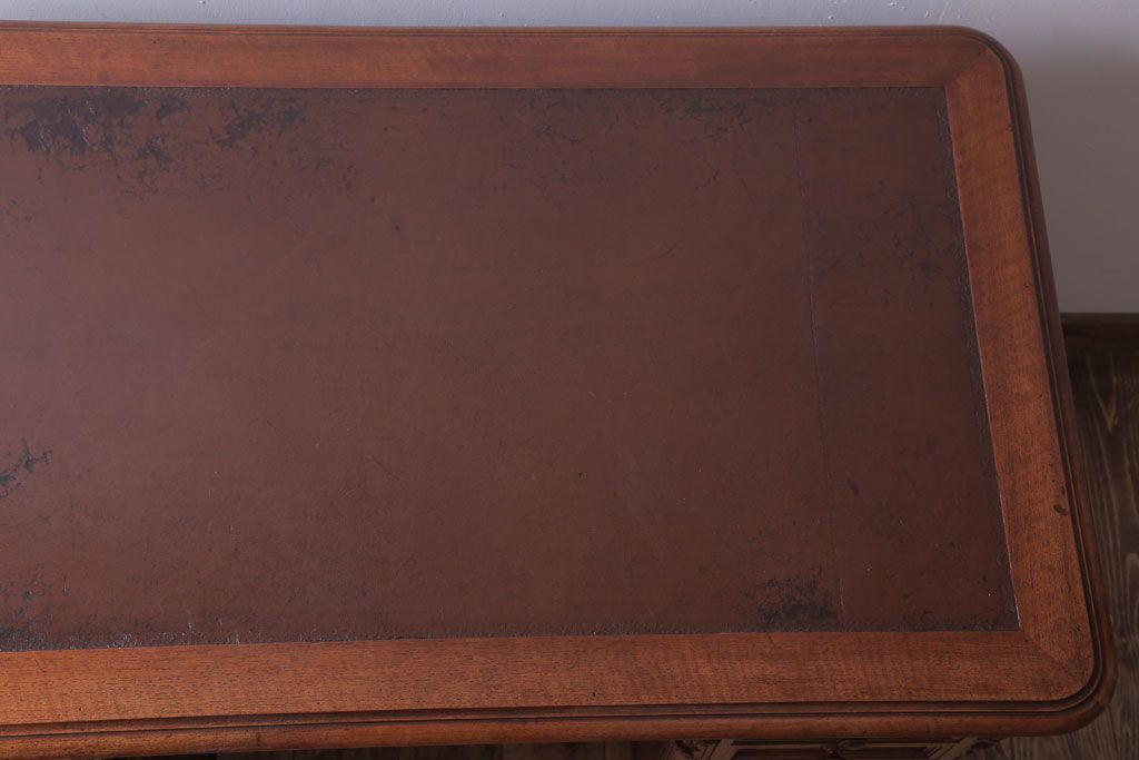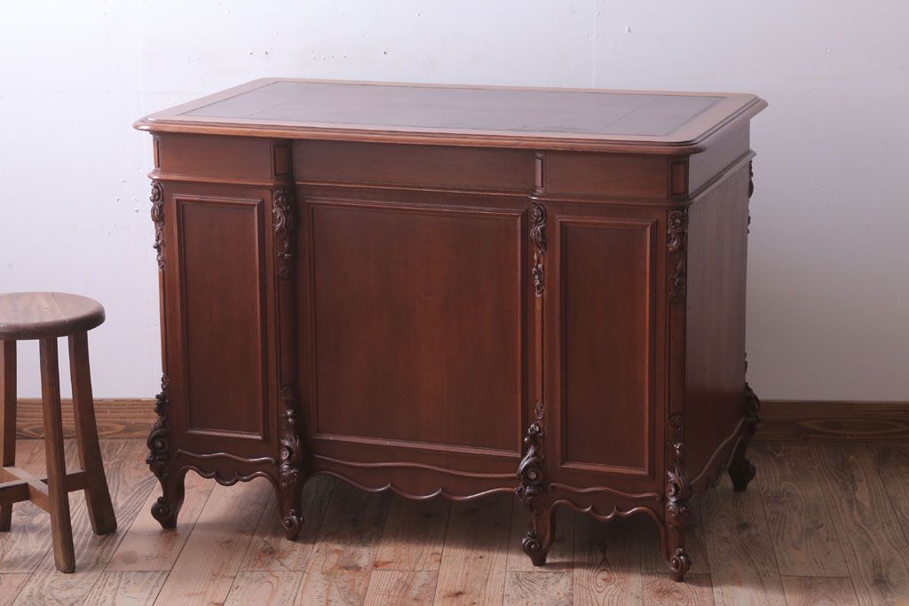 イギリスアンティーク マホガニー・オーク材製 上品な彫刻の最高級両袖デスク(両袖机)です。