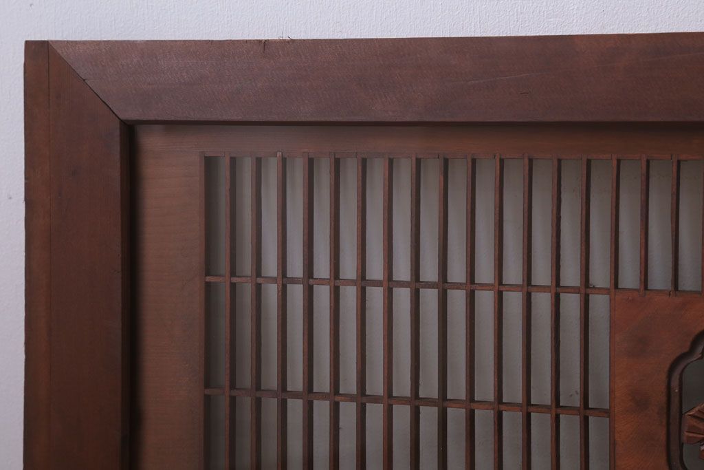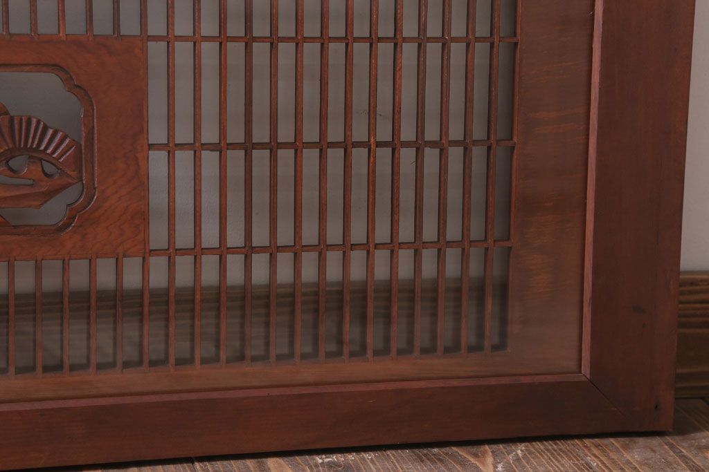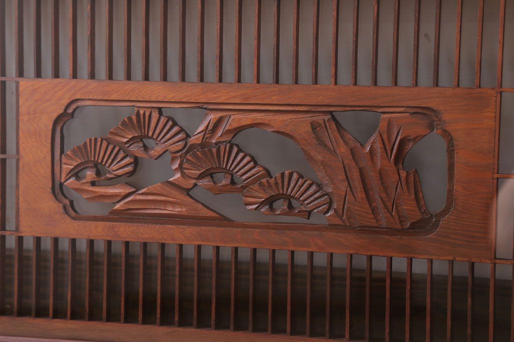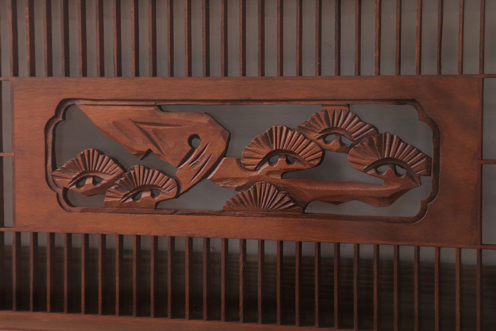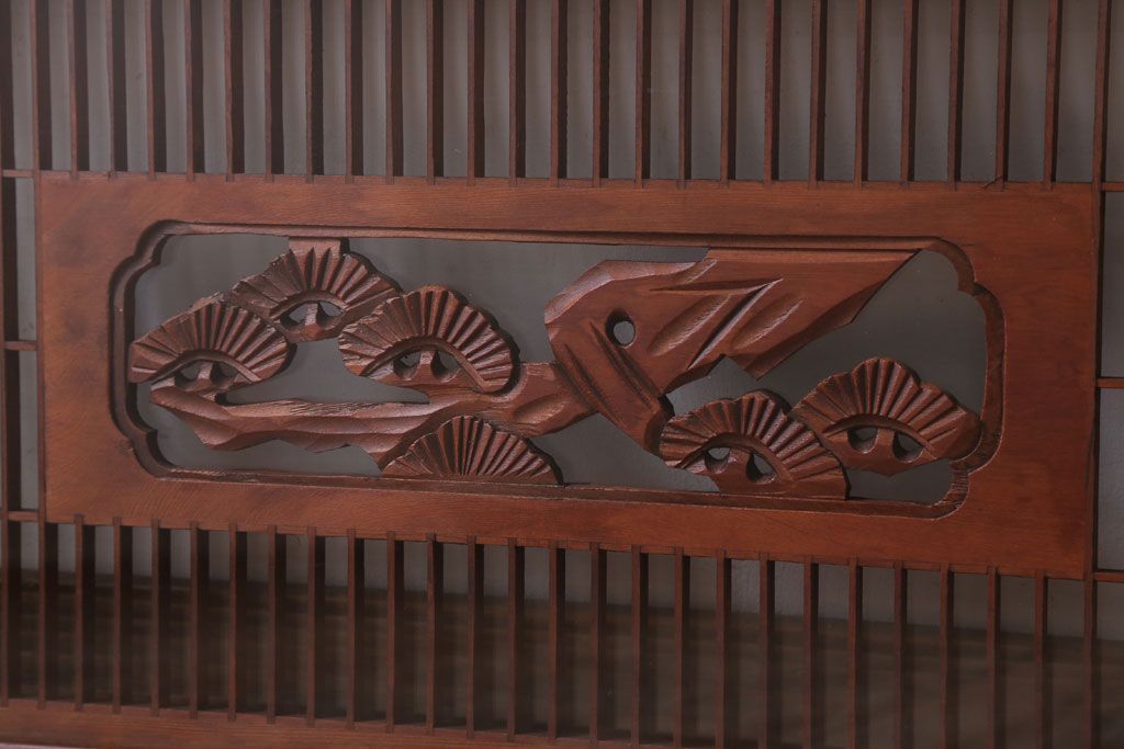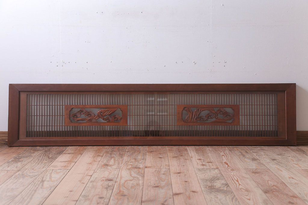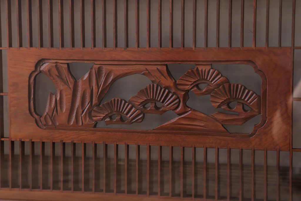 ----※ご注意ください※-------------------------------------- こちらの商品は、玄関先でのお渡しとなります。 また、お届けの際のお日にち指定・お時間指定・代金引換(コレクト)にも対応しておりません。 予めご了承ください。 ----------------------------------------------------------- 古民具・骨董 古い木の松模様ガラス書院欄間(明かり取り)です。 上品な松の透かし彫りが特徴の、 和製アンティーク書院欄間です。 両面にクリアガラスが使われています。 壁掛けのディスプレイとしてもおすすめです。 使用上問題のあるダメージはありません。 ■重量 約10kg ■框サイズ 上45mm/左60mm/右60mm/下35mm