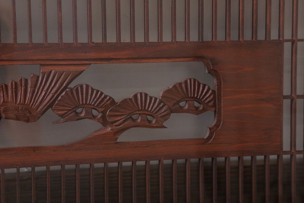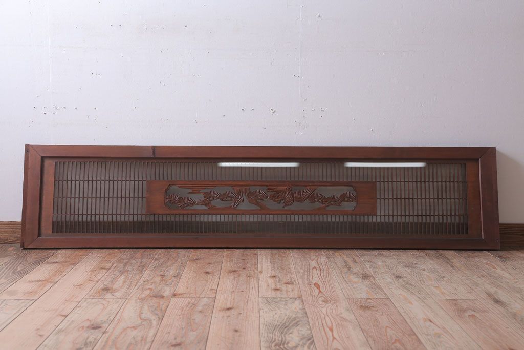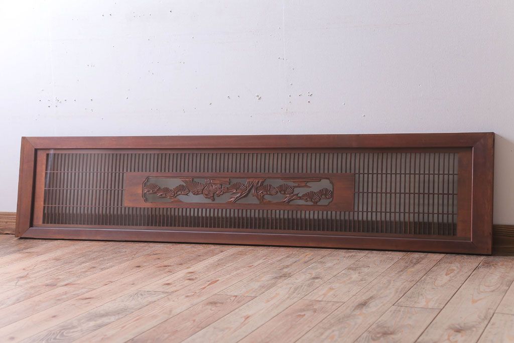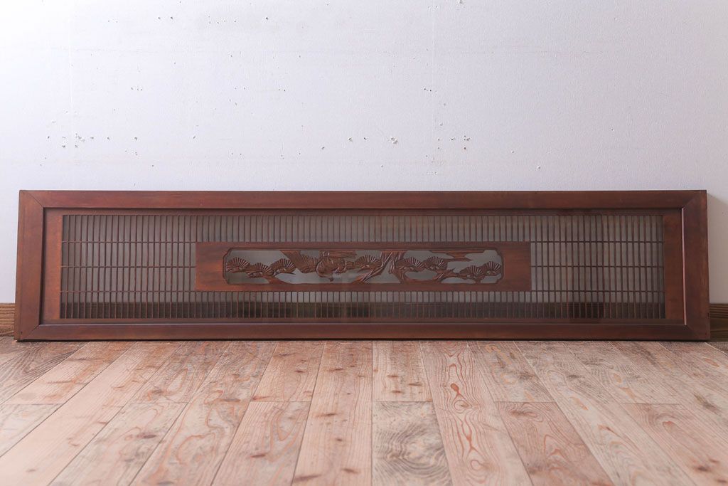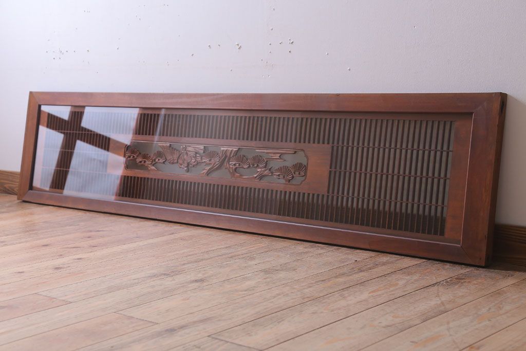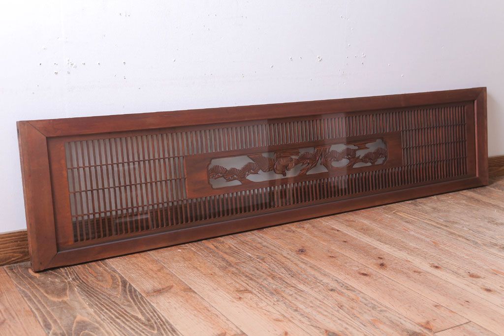 ----※ご注意ください※-------------------------------------- こちらの商品は、玄関先でのお渡しとなります。 また、お届けの際のお日にち指定・お時間指定・代金引換(コレクト)にも対応しておりません。 予めご了承ください。 ----------------------------------------------------------- 古民具・骨董 松に鷹 古い木のガラス書院欄間(明かり取り)です。 上品な松に鷹の透かし彫りが特徴の、 和製アンティーク書院欄間です。 両面にクリアガラスが使われています。 壁掛けのディスプレイとしてもおすすめです。 使用上問題のあるダメージはありません。 ■重量 約10kg ■框サイズ 上45mm/左40mm/右60mm/下40mm