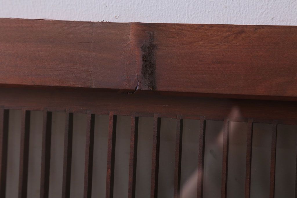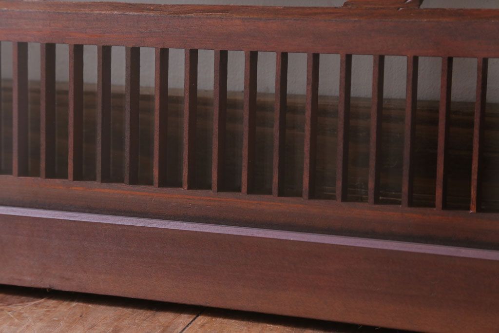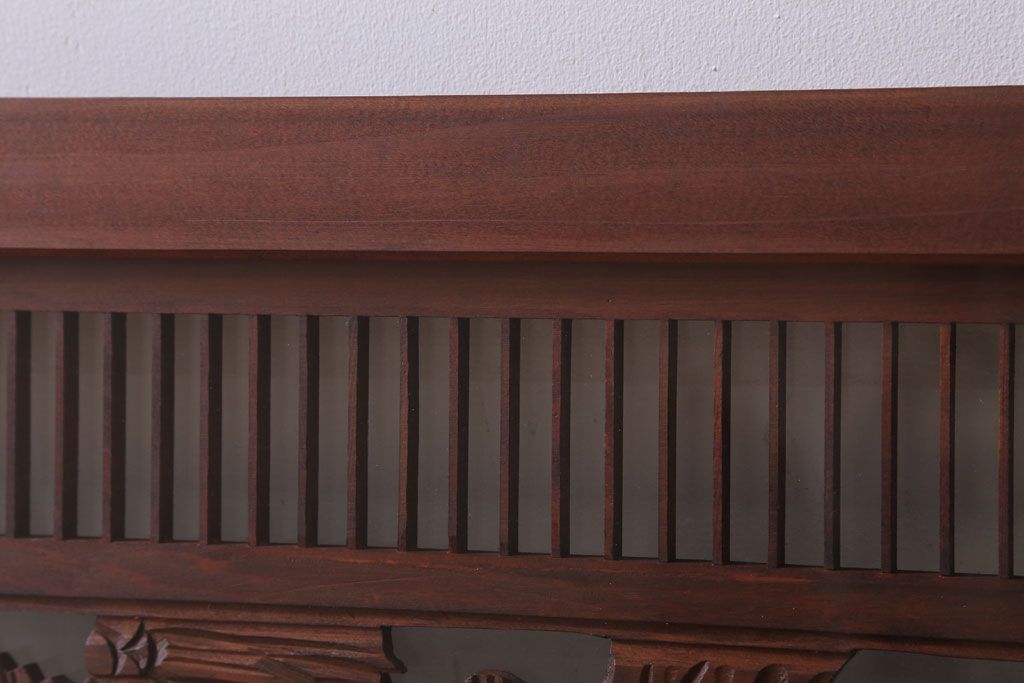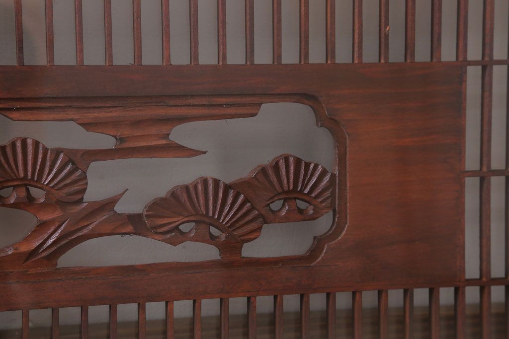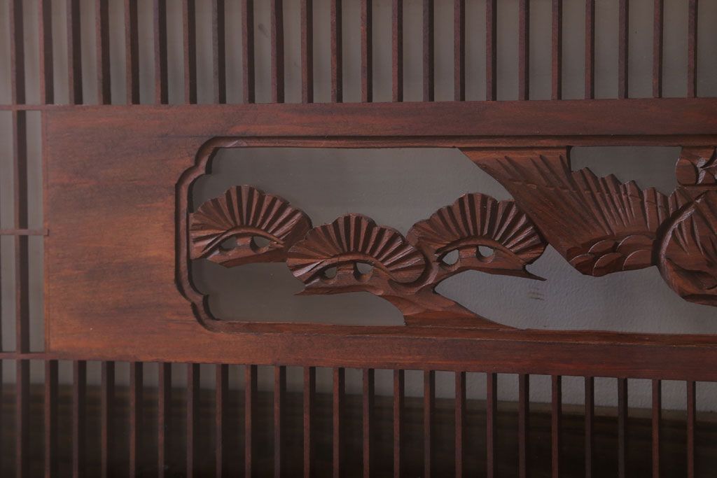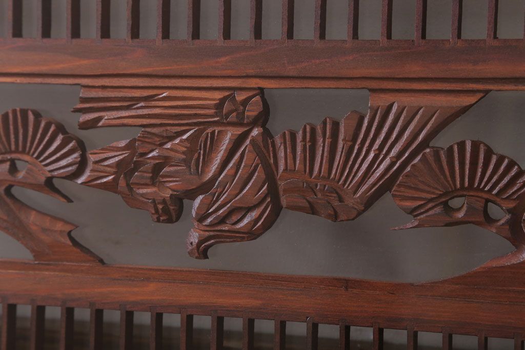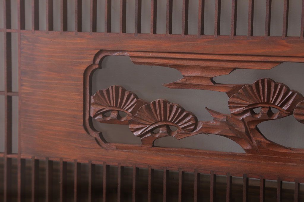 ----※ご注意ください※-------------------------------------- こちらの商品は、玄関先でのお渡しとなります。 また、お届けの際のお日にち指定・お時間指定・代金引換(コレクト)にも対応しておりません。 予めご了承ください。 ----------------------------------------------------------- 古民具・骨董 松に鷹 古い木のガラス書院欄間(明かり取り)です。 上品な松に鷹の透かし彫りが特徴の、 和製アンティーク書院欄間です。 両面にクリアガラスが使われています。 壁掛けのディスプレイとしてもおすすめです。 使用上問題のあるダメージはありません。 ■重量 約10kg ■框サイズ 上45mm/左40mm/右60mm/下40mm