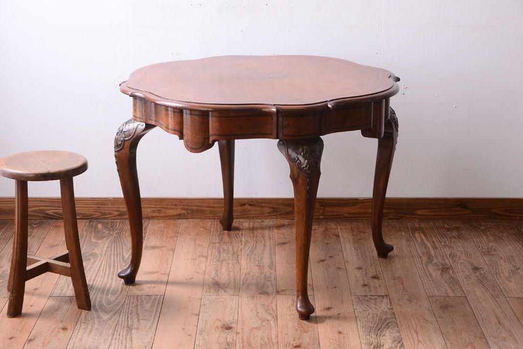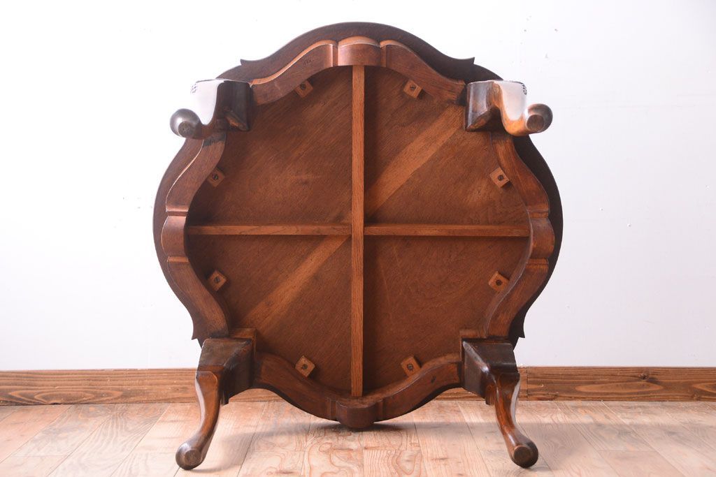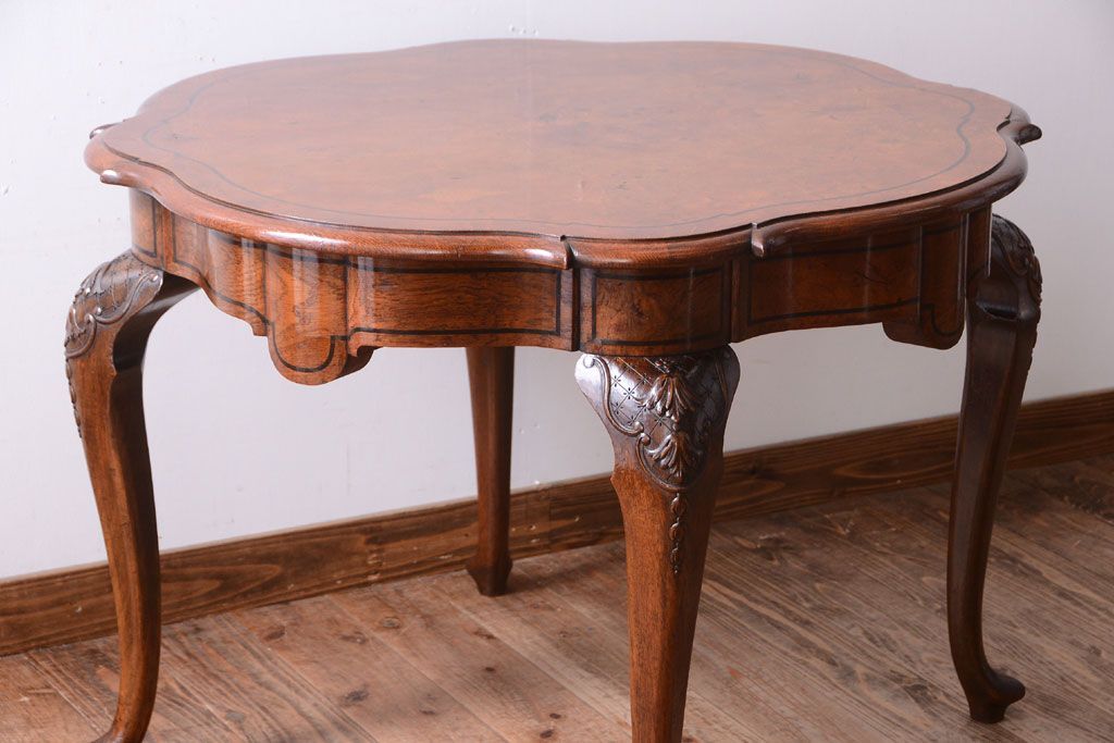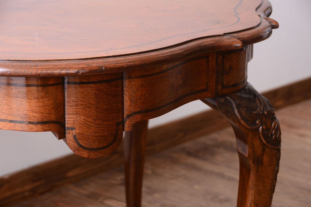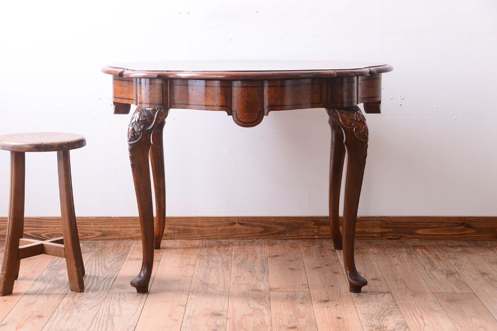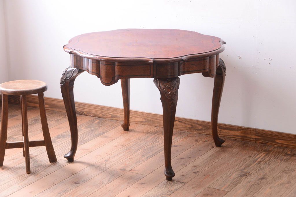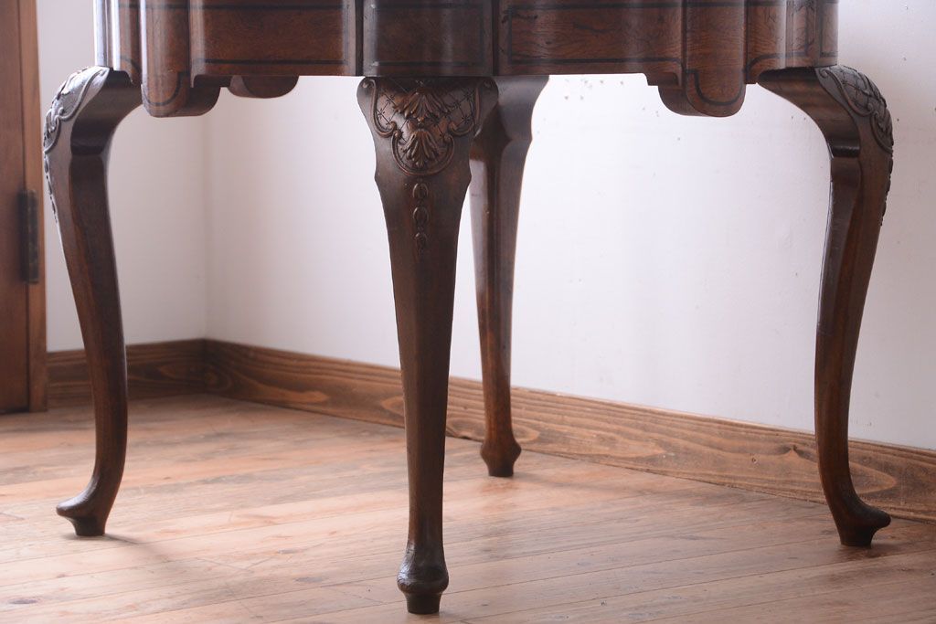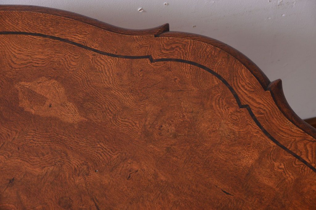 イギリスアンティーク ウォールナット・オーク材の彫刻・象嵌入り最高級ダイニングテーブルです。
