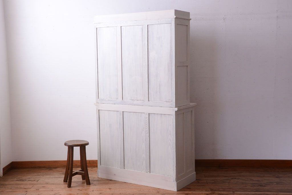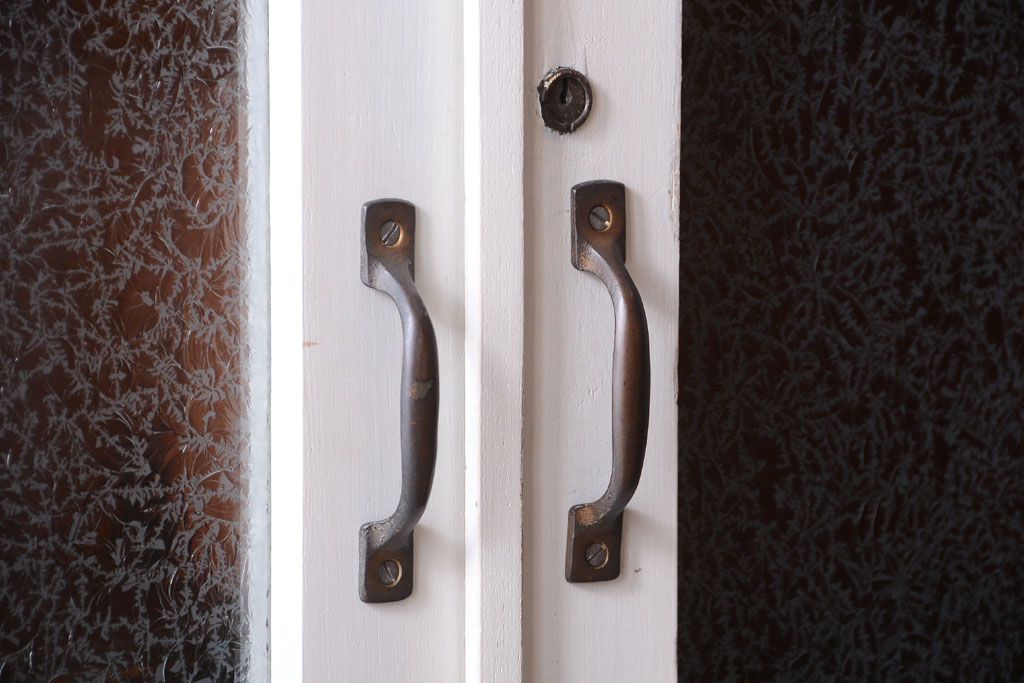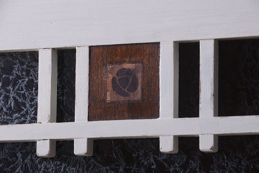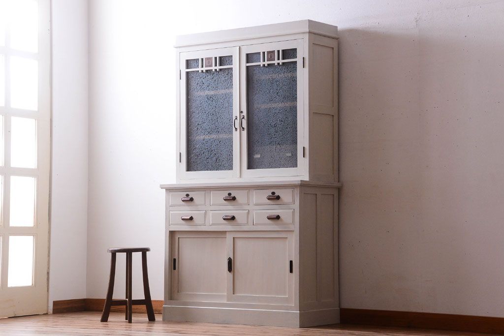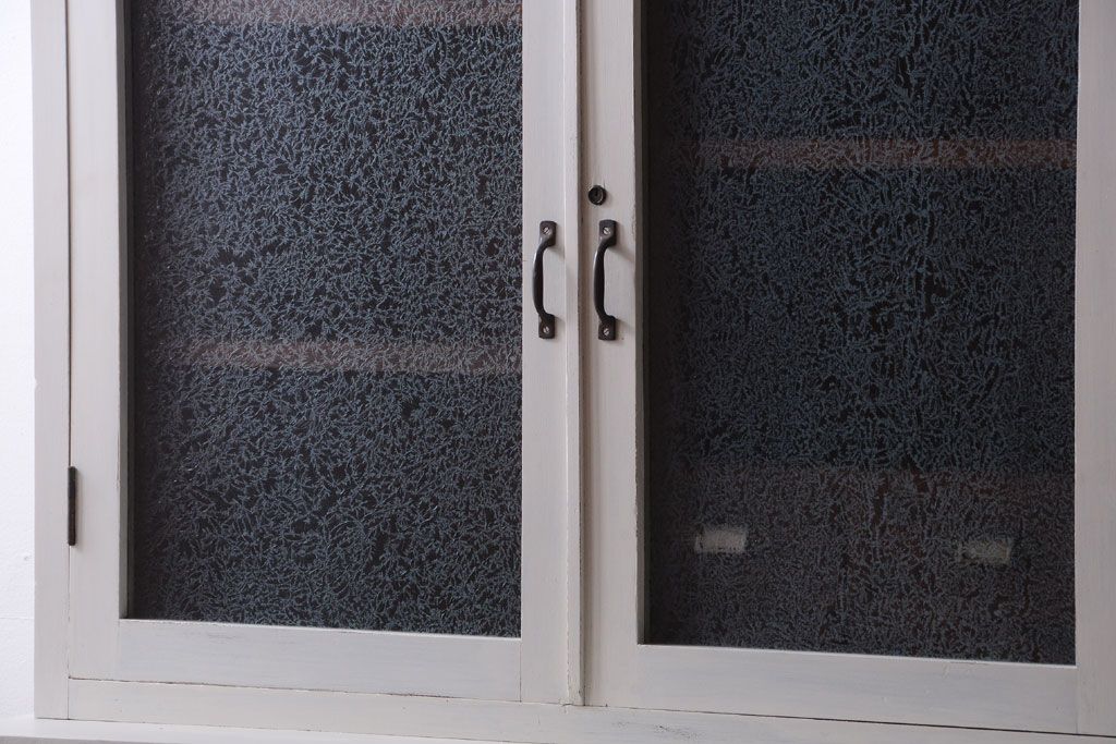 アンティーク家具 アンティークペイント 象嵌入り!結霜ガラス扉の古い食器棚(カップボード)