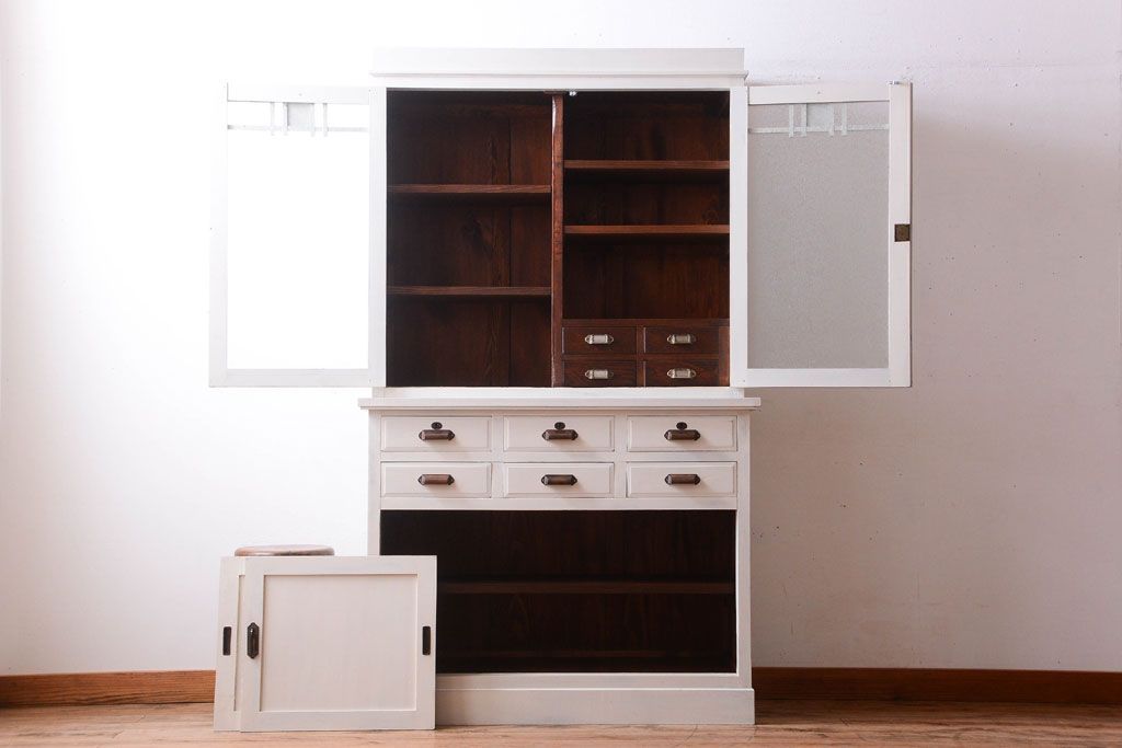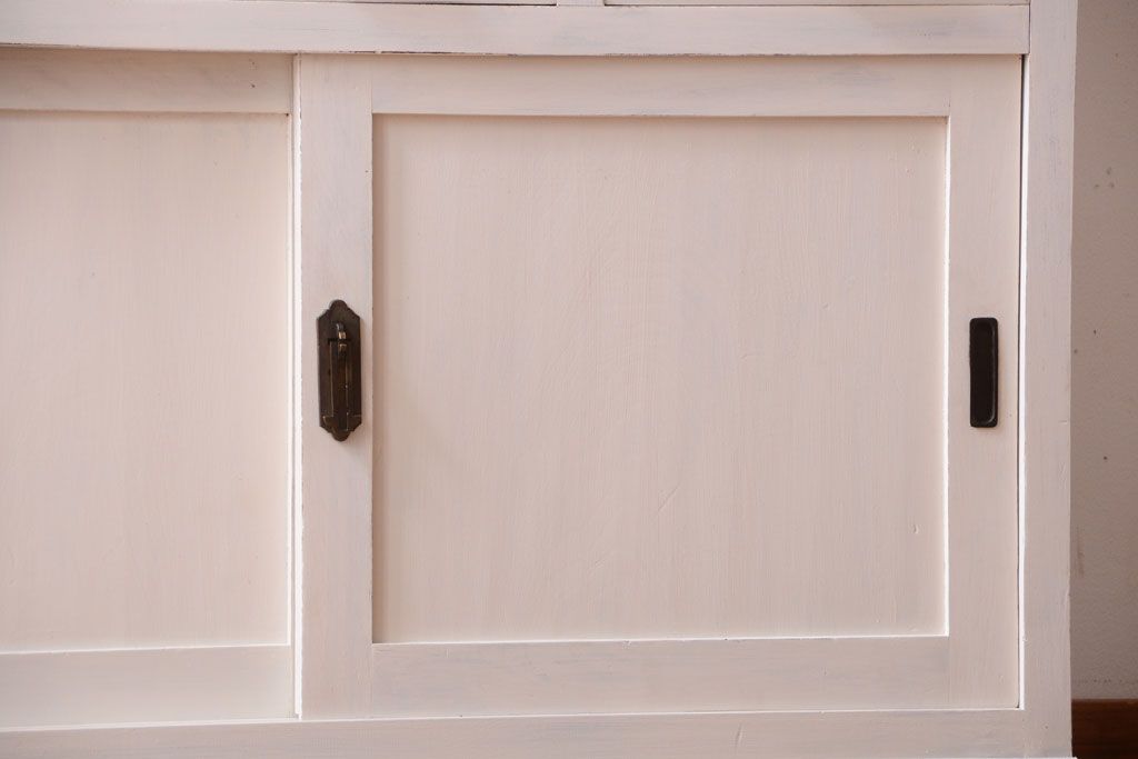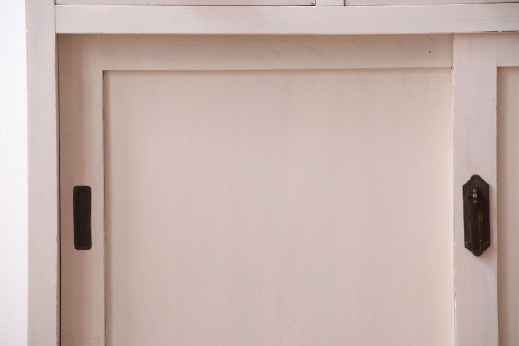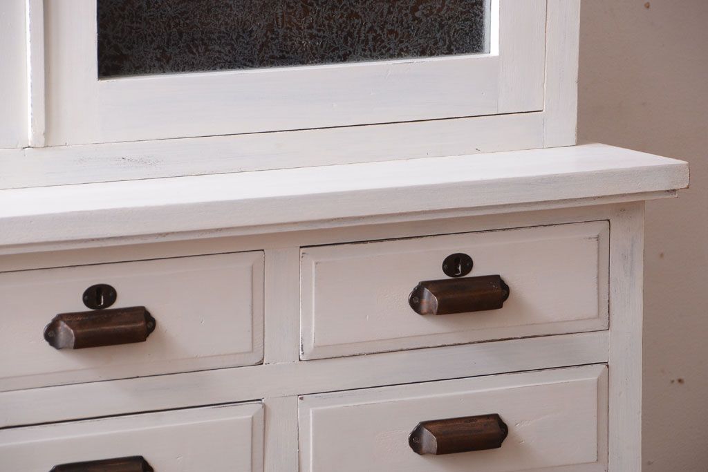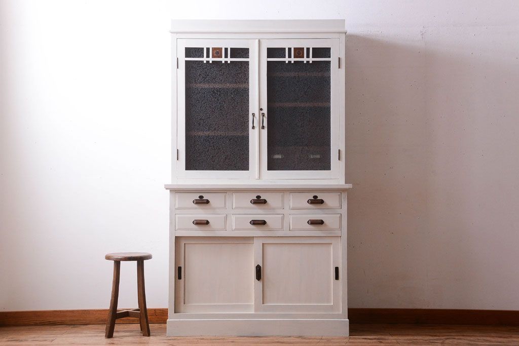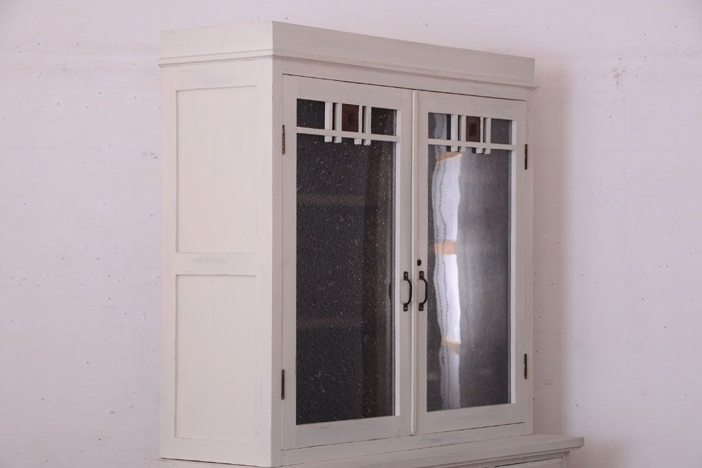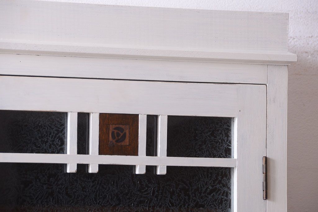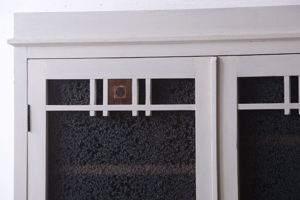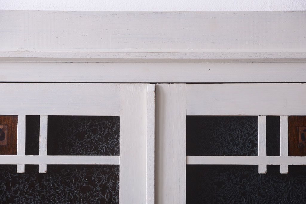 ラフジュ工房> キャビネット・戸棚> 食器棚・カップボード > アンティーク家具 アンティークペイント 象嵌入り!結霜ガラス扉の古い食器棚(カップボード)