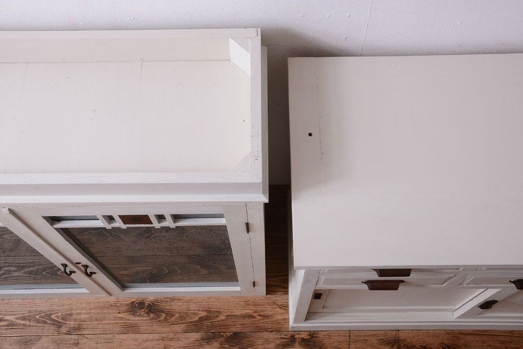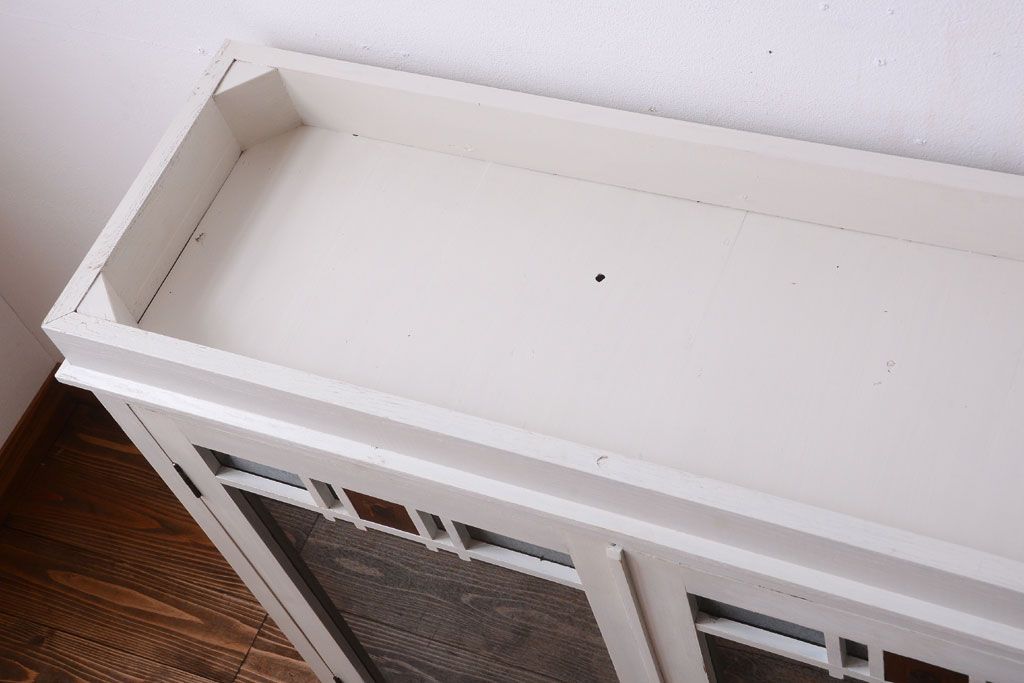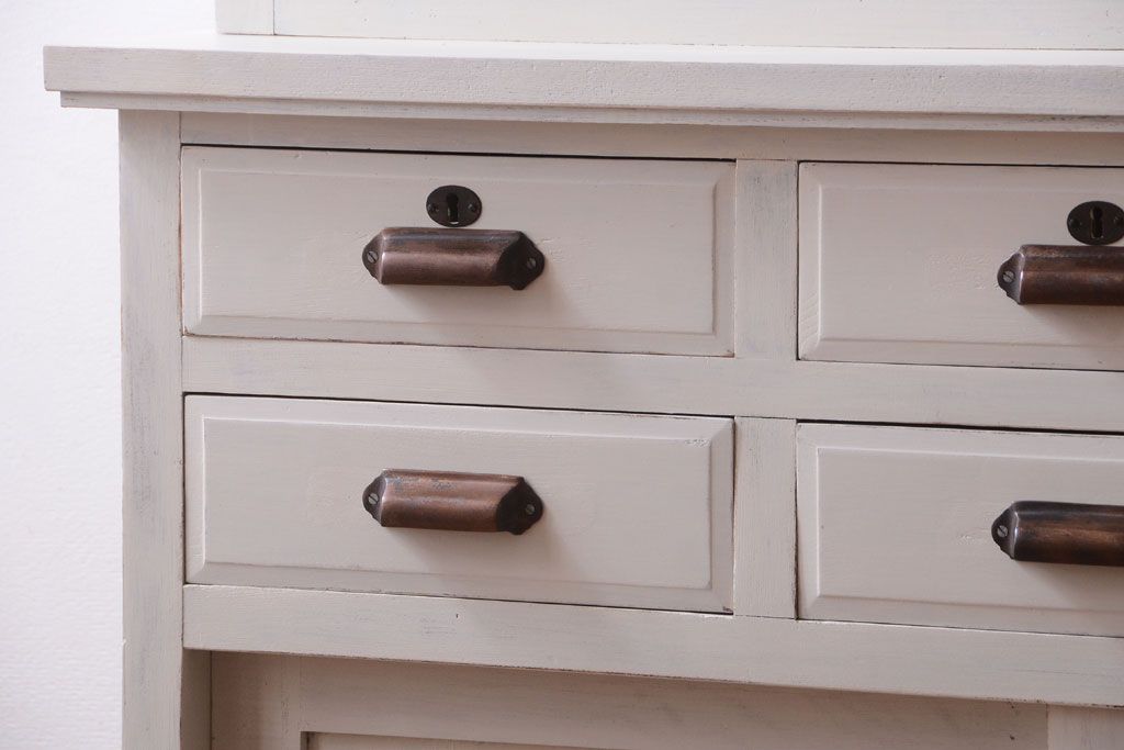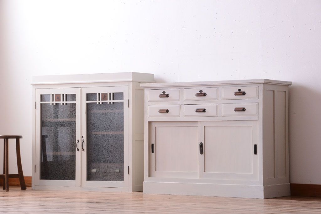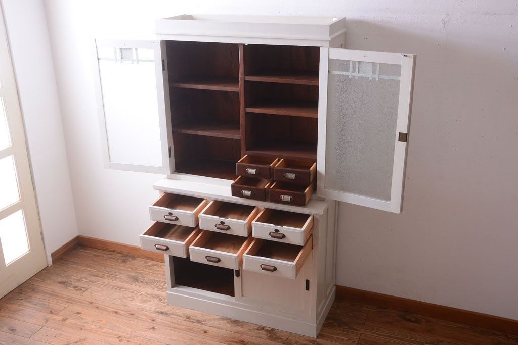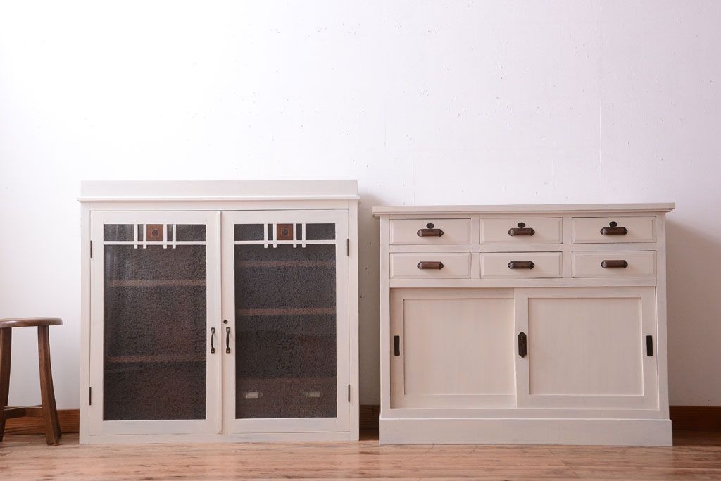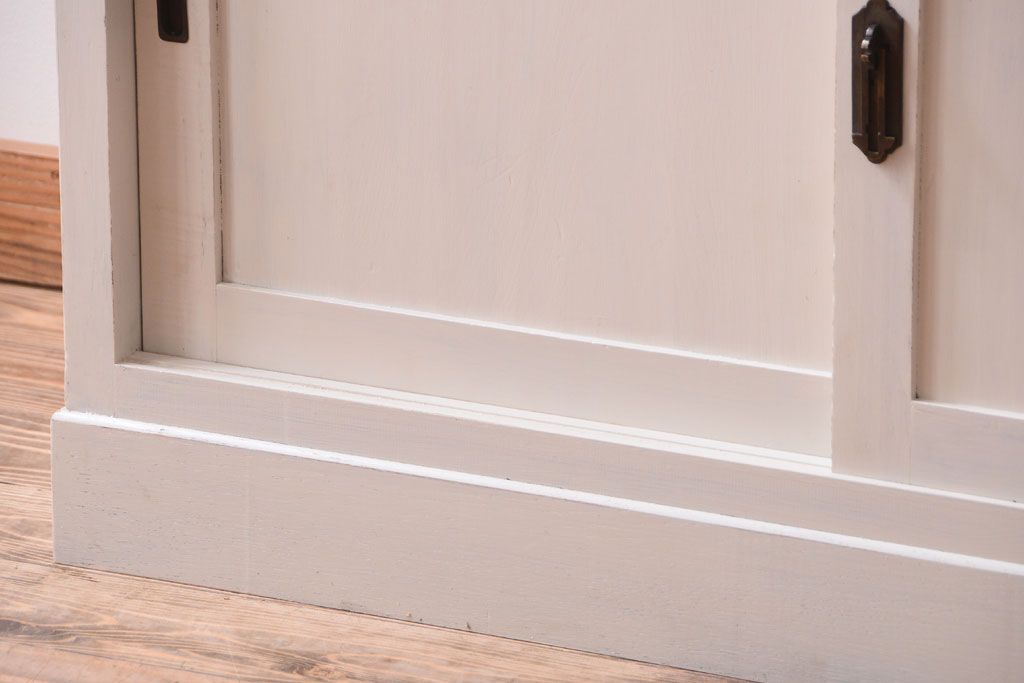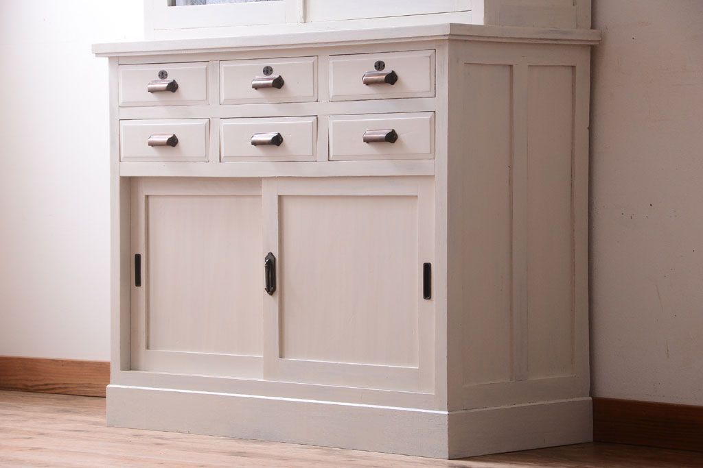 ラフジュ工房> キャビネット・戸棚> 食器棚・カップボード > アンティーク家具 アンティークペイント 象嵌入り!結霜ガラス扉の古い食器棚(カップボード)