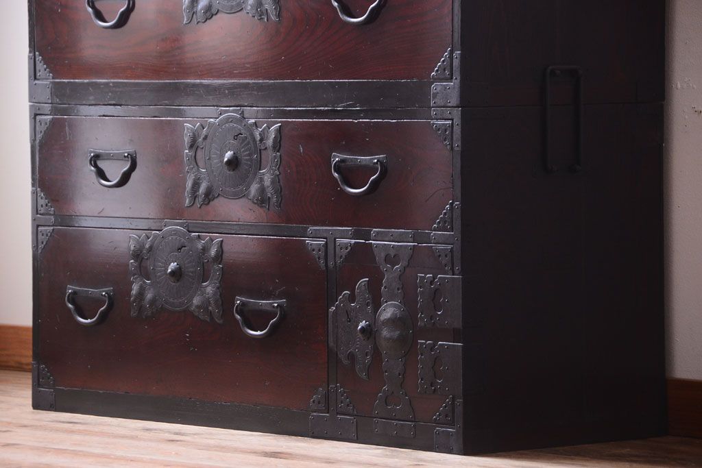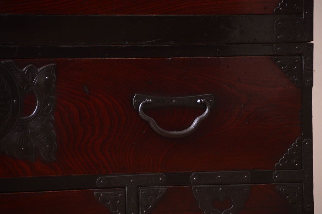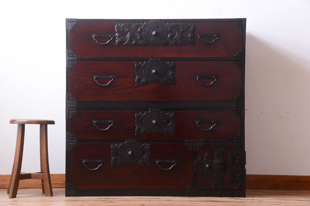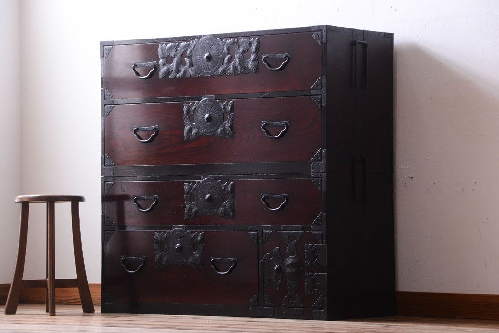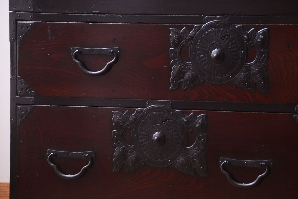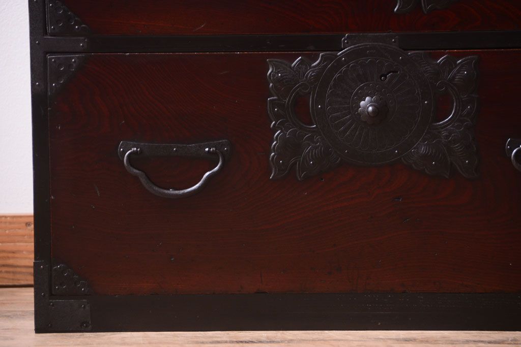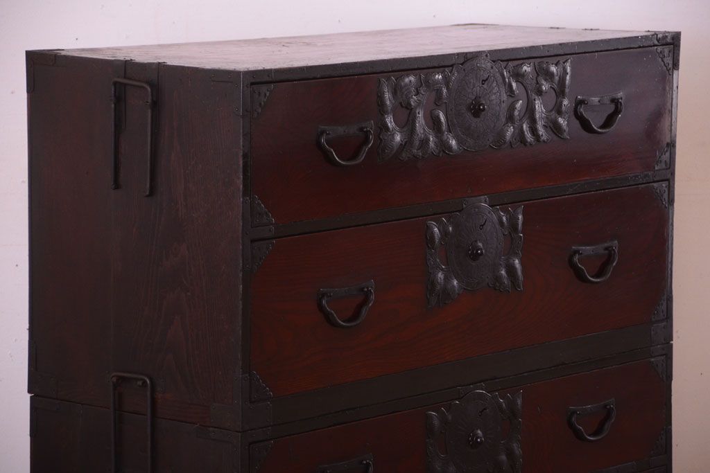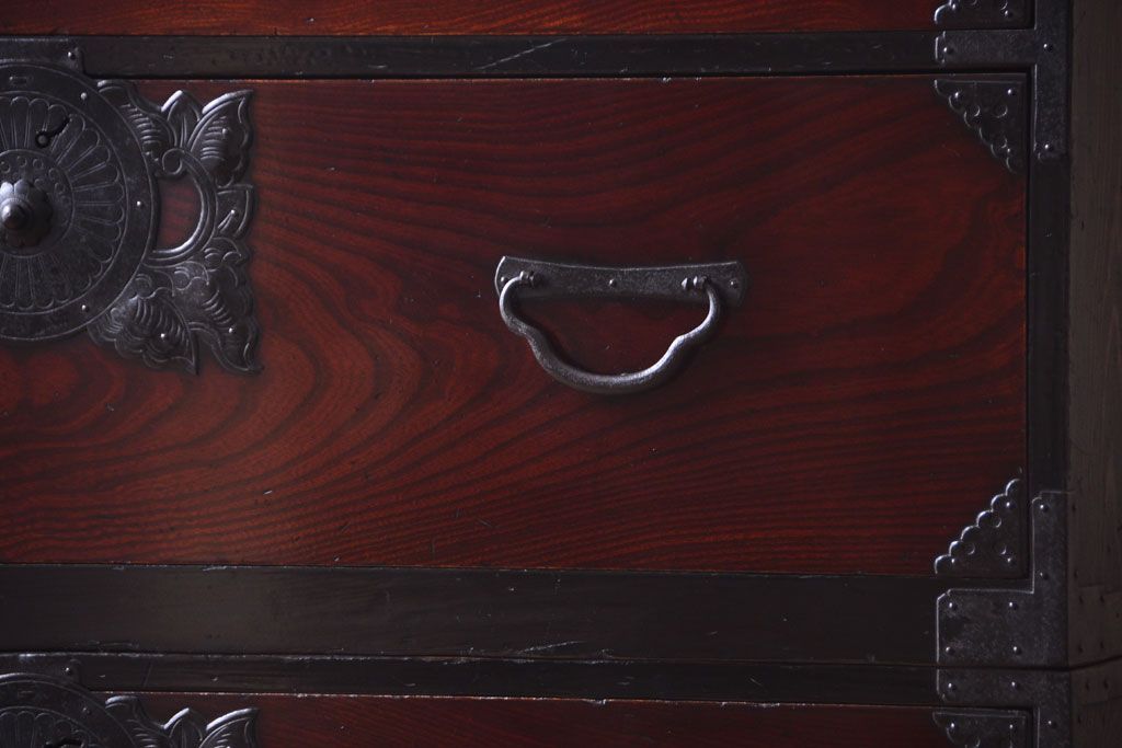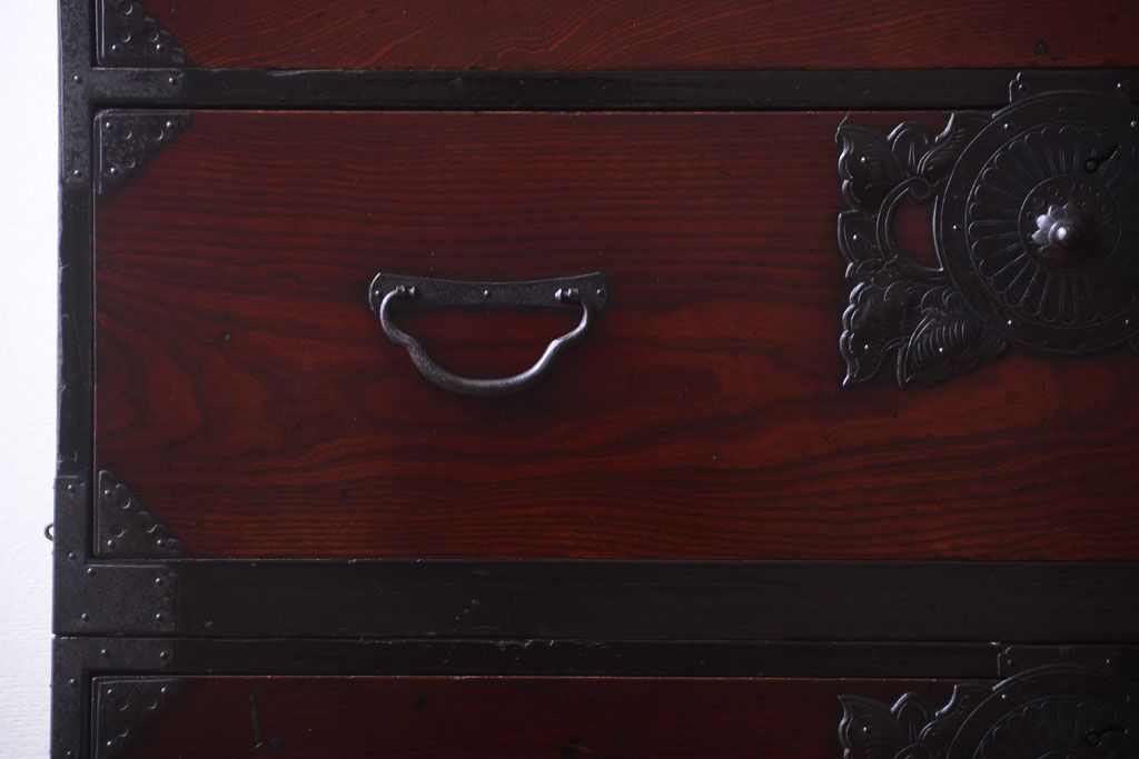 和箪笥> 衣装箪笥 > アンティーク家具 古民具・骨董 明治期 前面欅材!美しい漆塗りのアンティーク重ね仙台箪笥