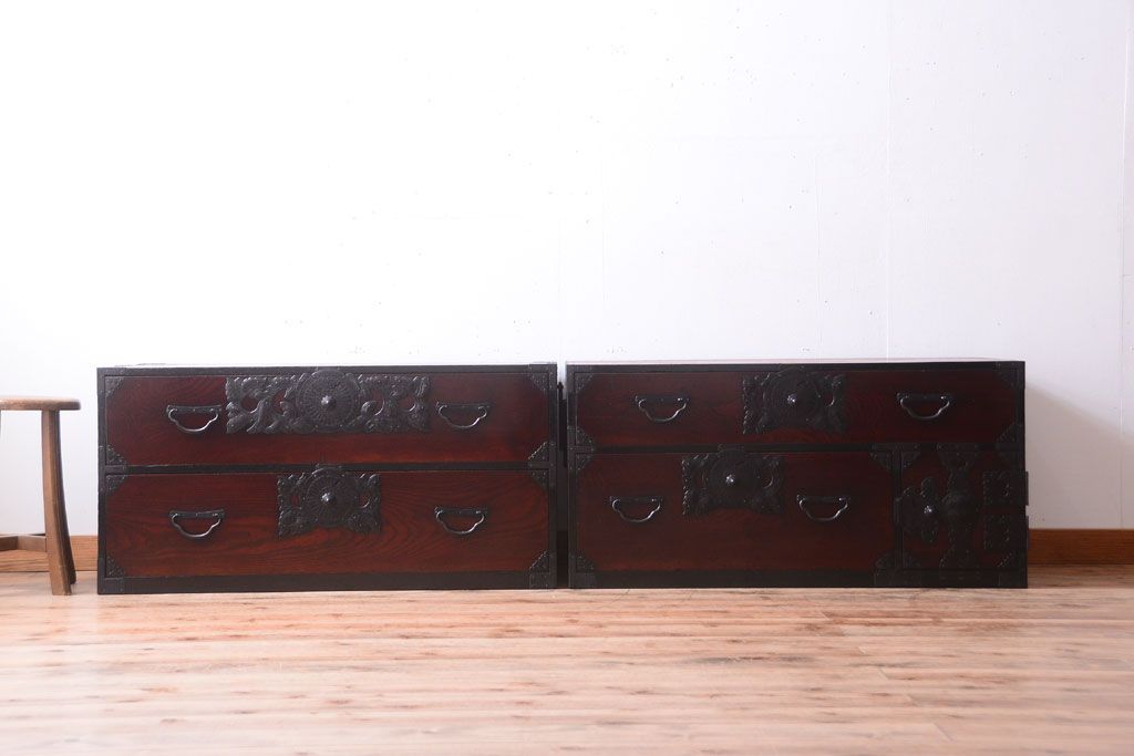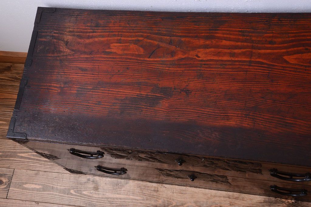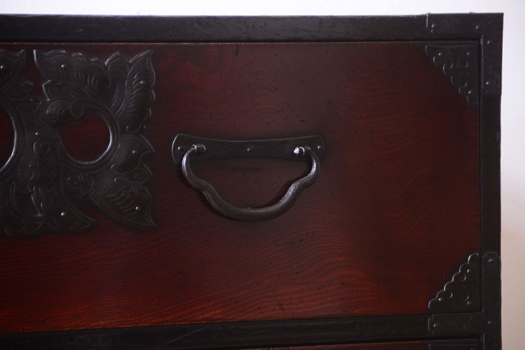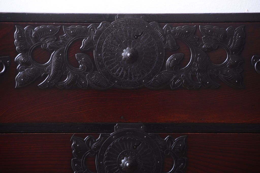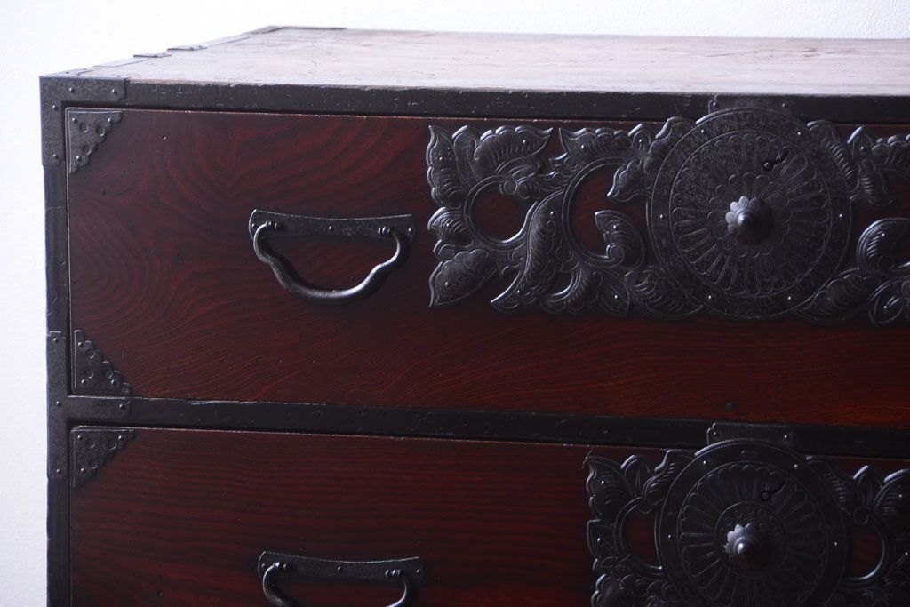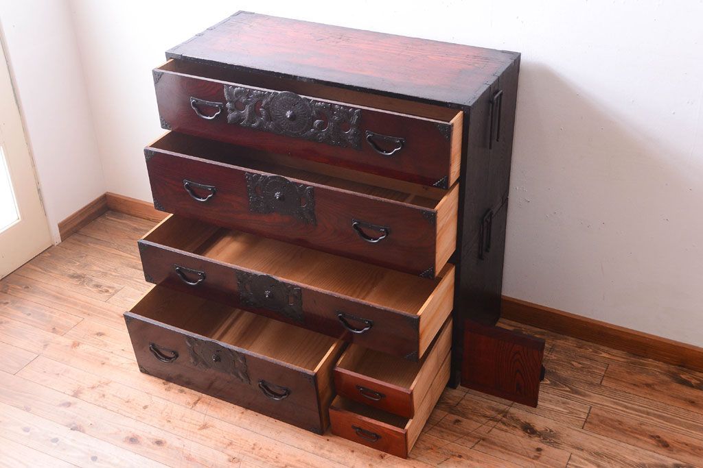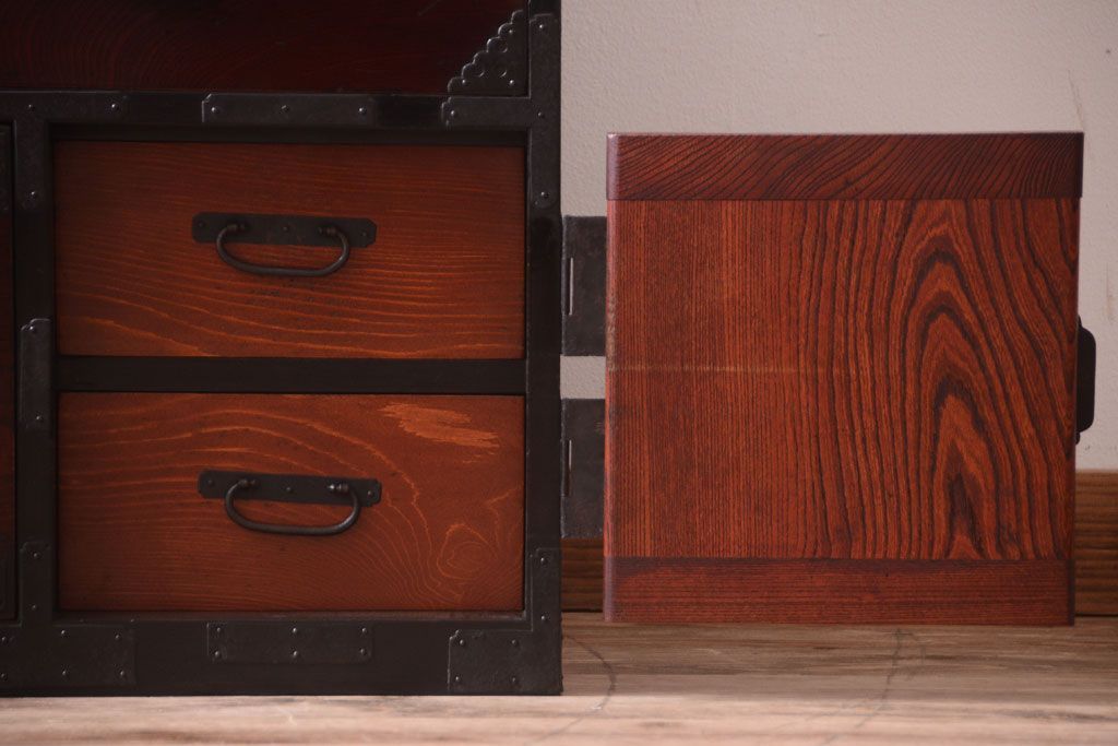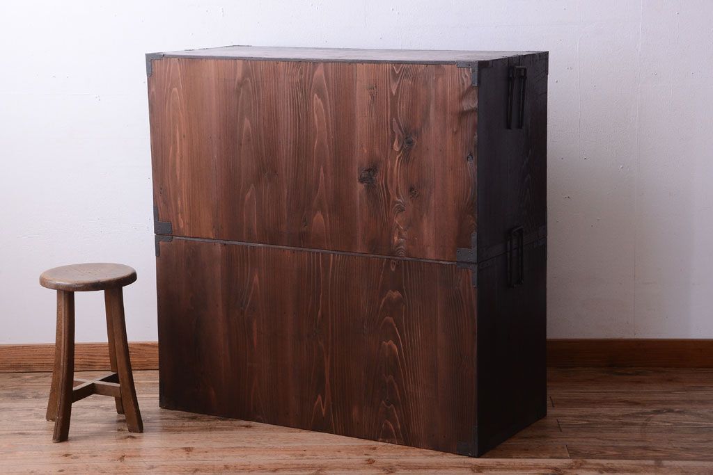 和箪笥> 衣装箪笥 > アンティーク家具 古民具・骨董 明治期 前面欅材!美しい漆塗りのアンティーク重ね仙台箪笥