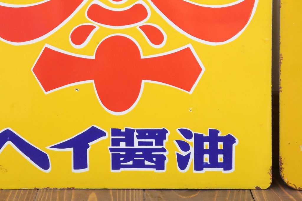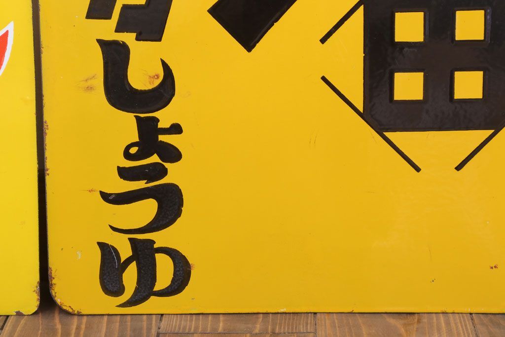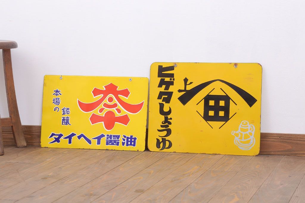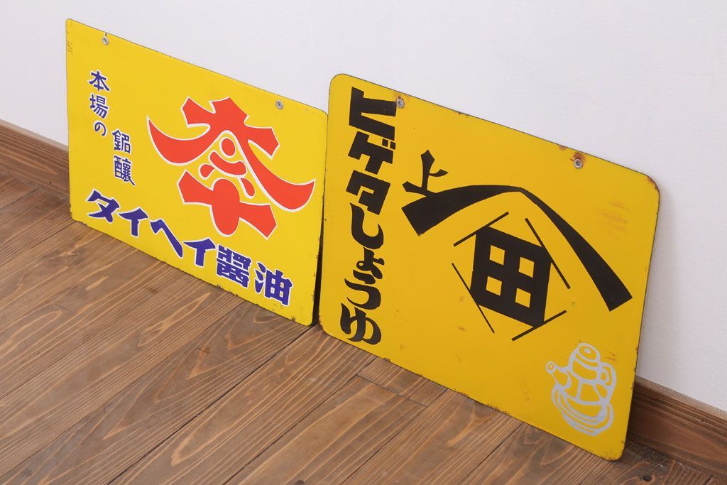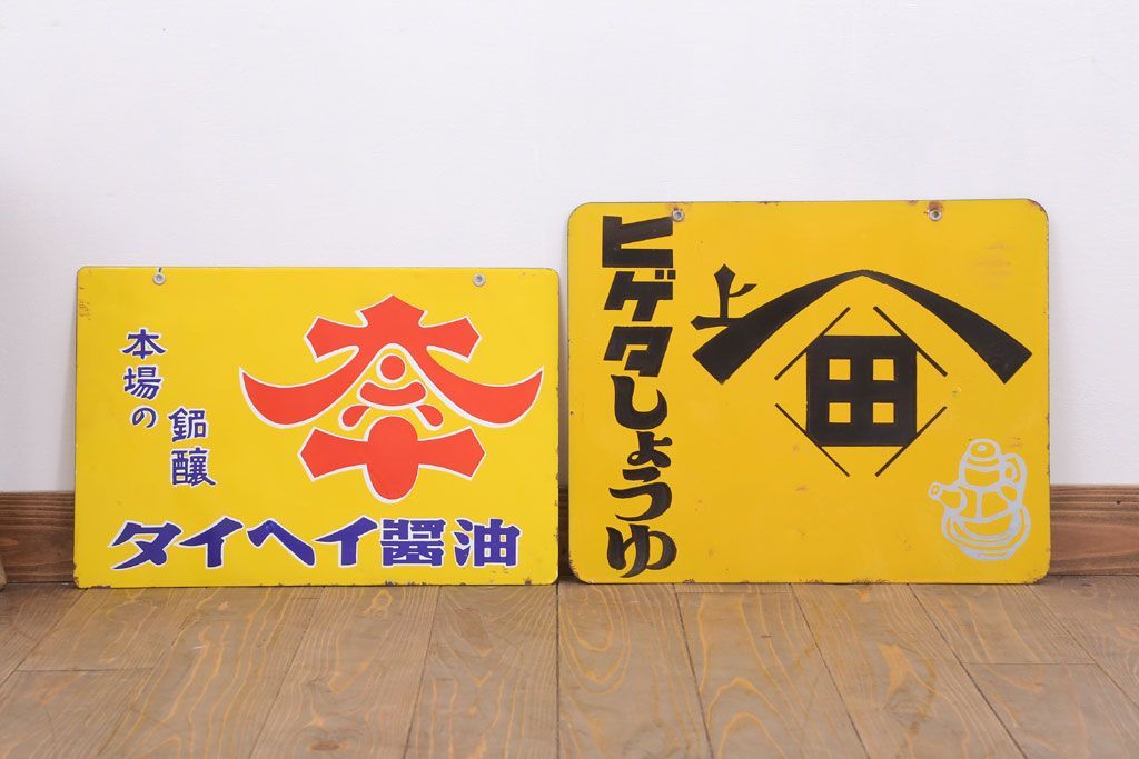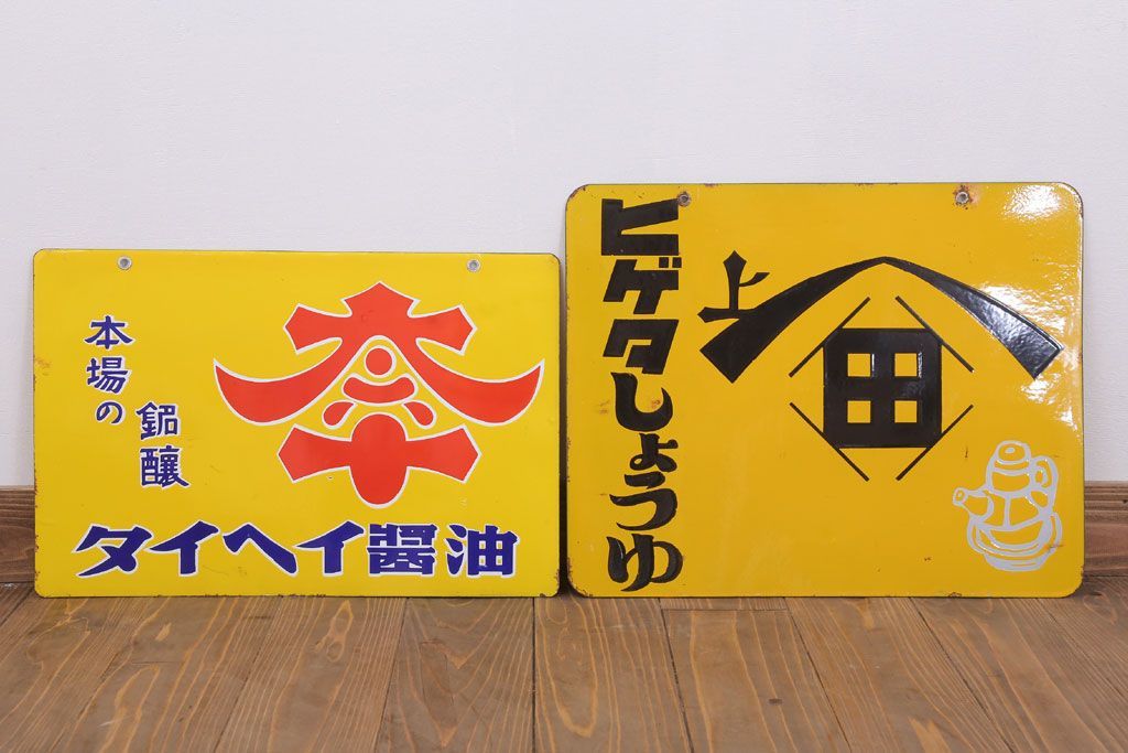 アンティーク雑貨 昭和レトロ デッドストック タイヘイ醤油・ヒゲタしょうゆ ホーロー看板2枚セット(企業看板)