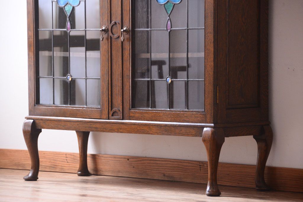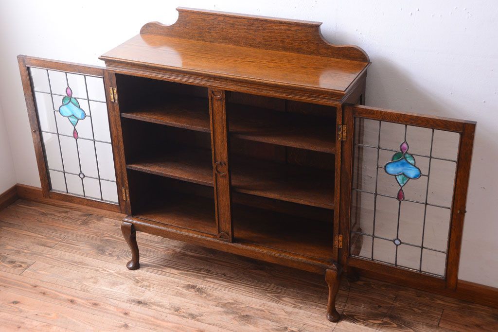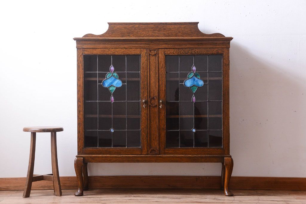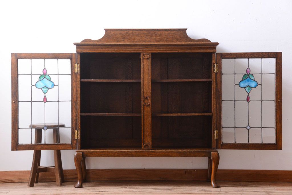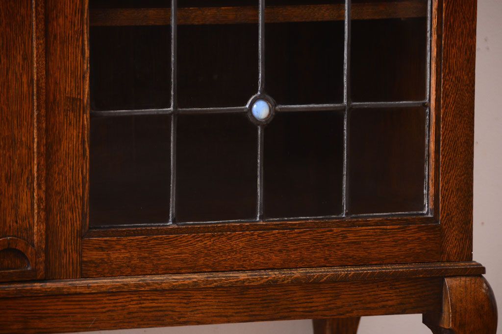 アンティーク家具 イギリスアンティーク ステンドグラス入り!オーク材製の上品で小ぶりなキャビネット(収納棚)