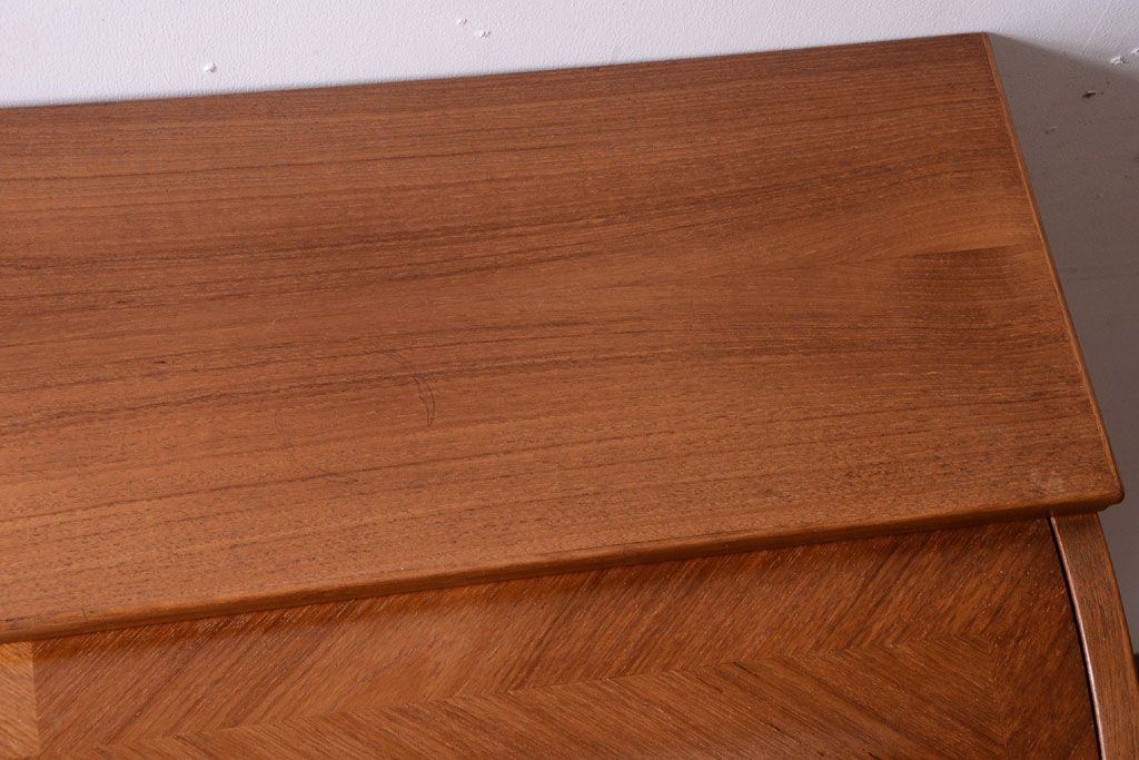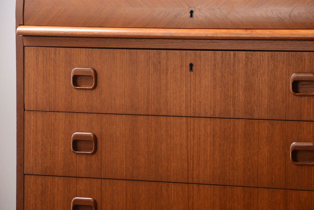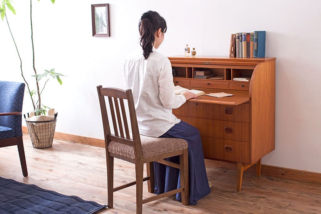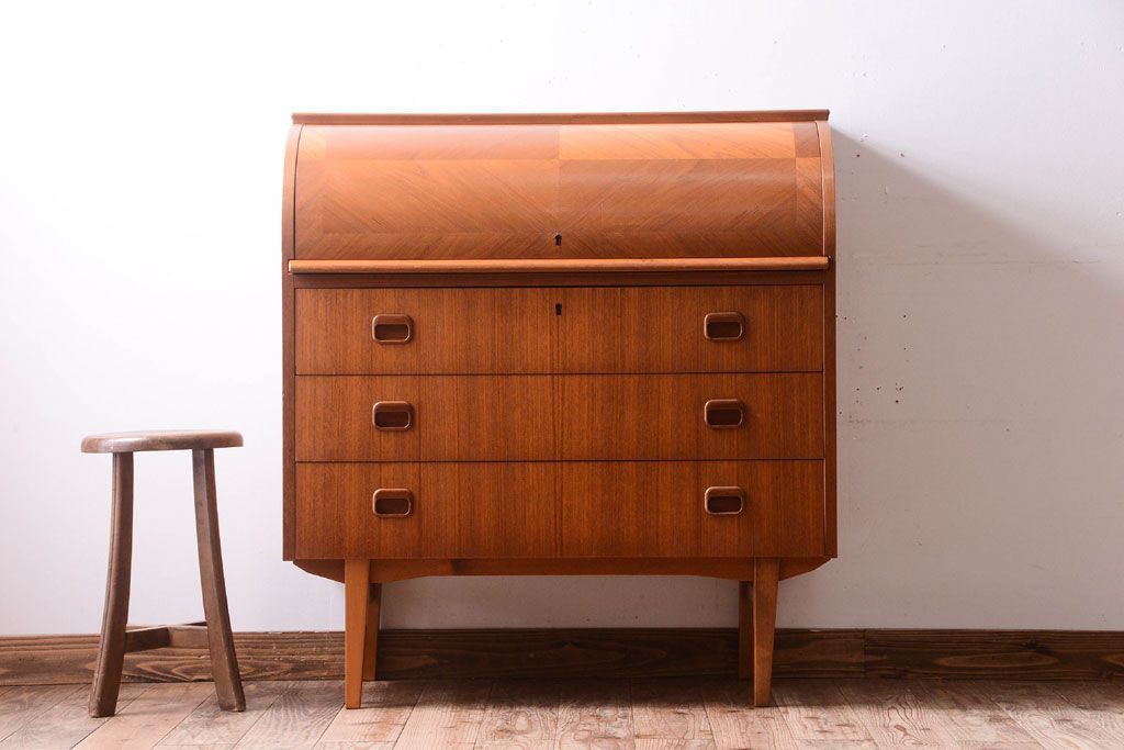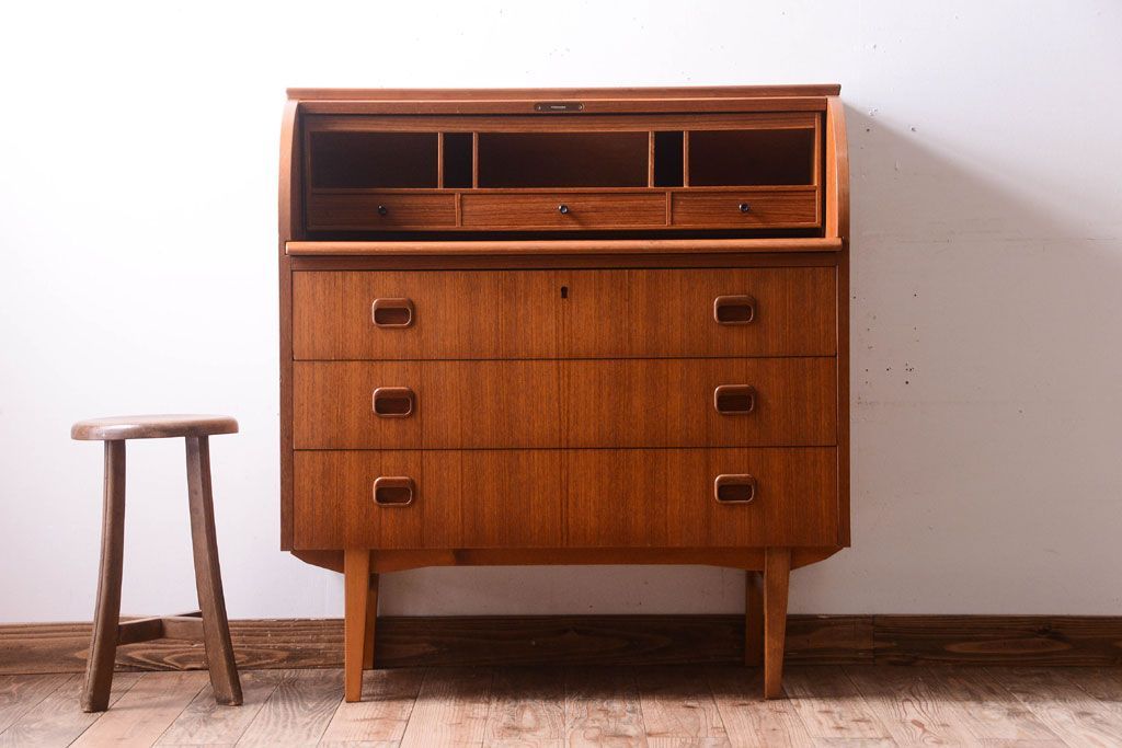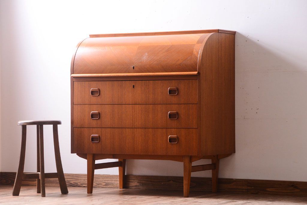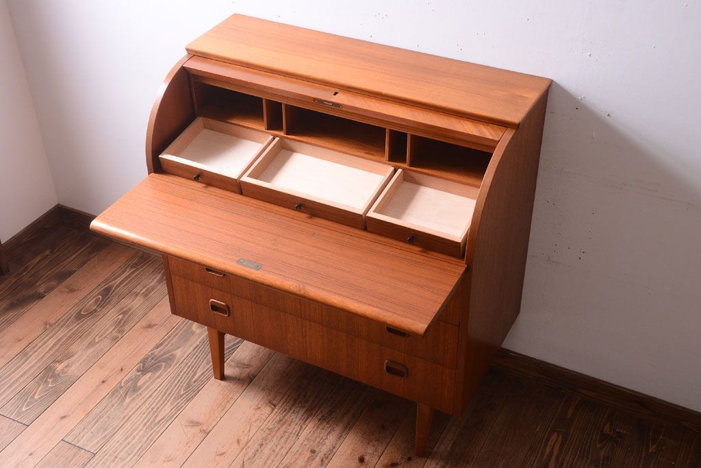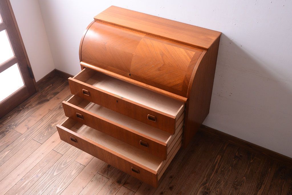 ラフジュ工房> デスク> ライティングビューロー・簿記机 > ヴィンテージ家具 北欧ビンテージ 高級品 珍しいチーク材製シリンダートップデスク