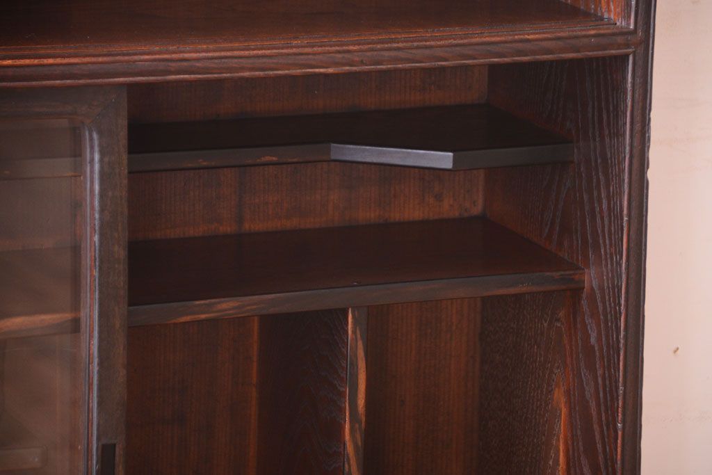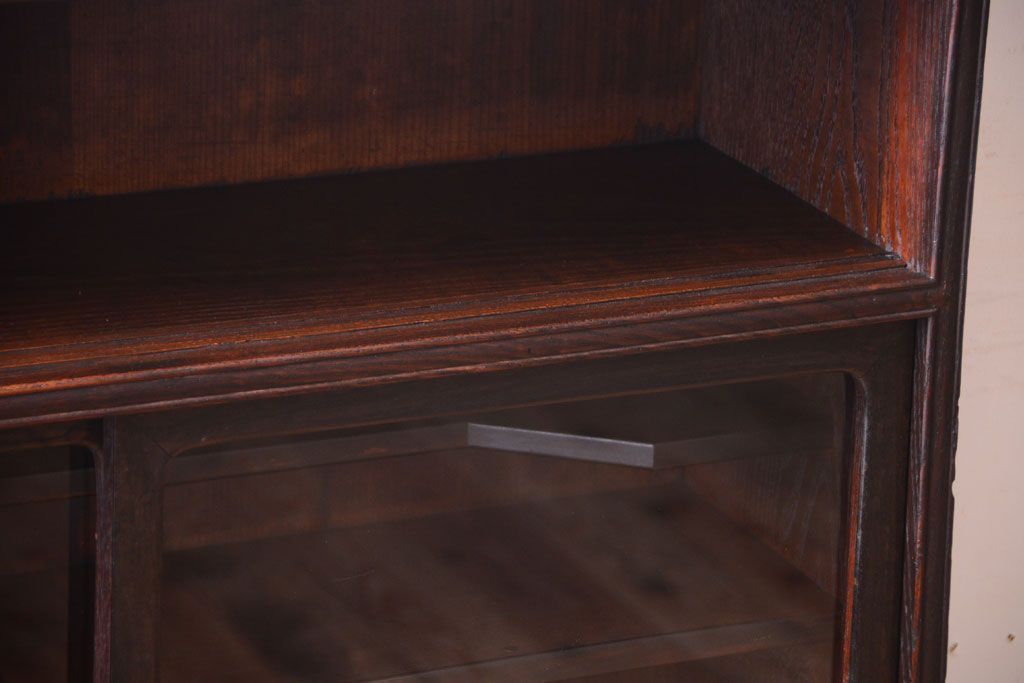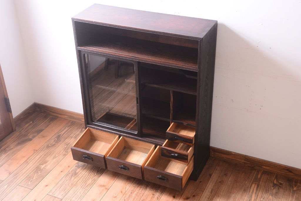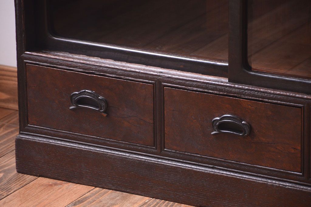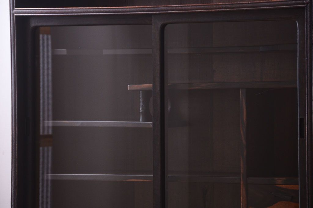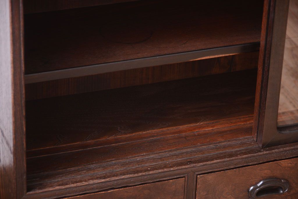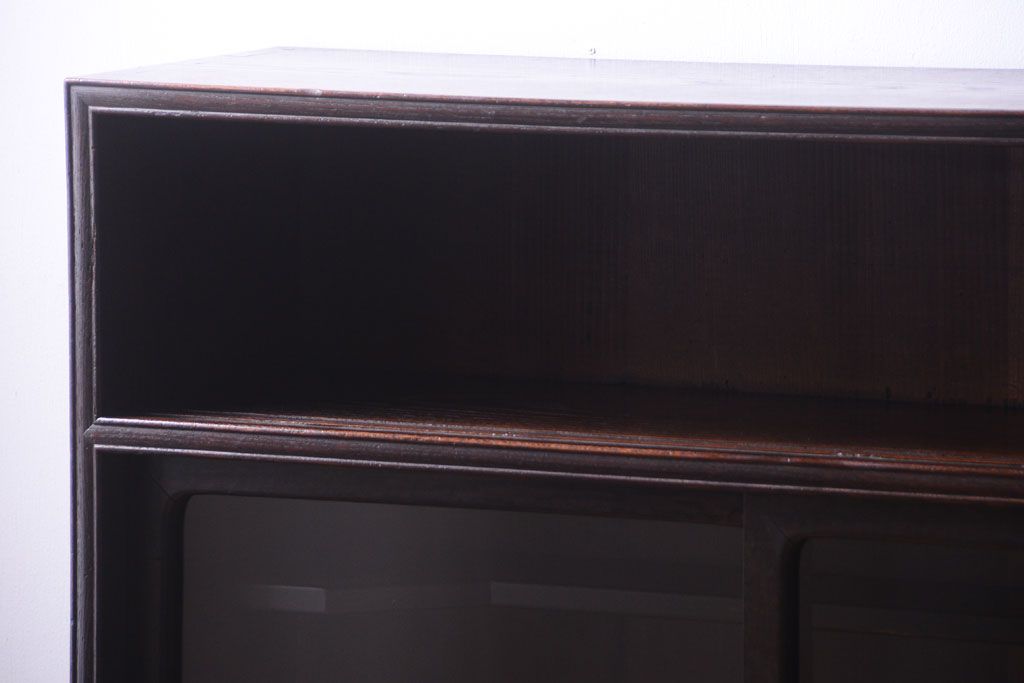 本体上部とガラス戸内下部に付いていた、引き戸・倹飩(けんどん)扉が欠損しています。ご理解の上お買い求めください。