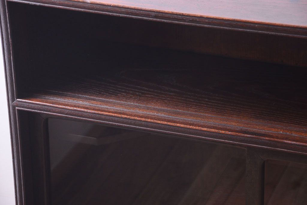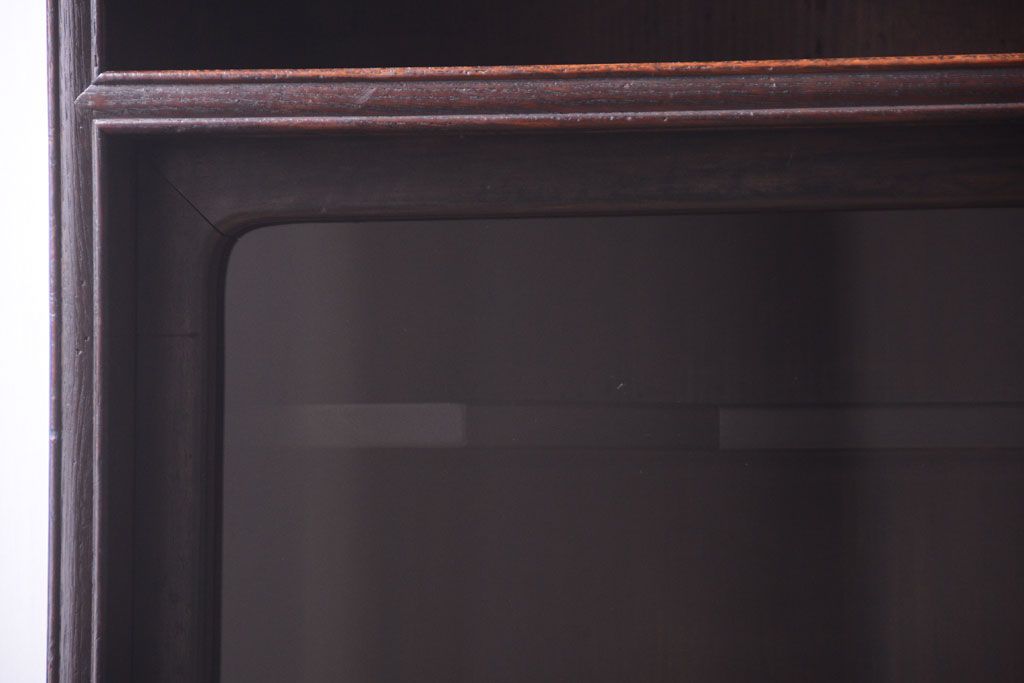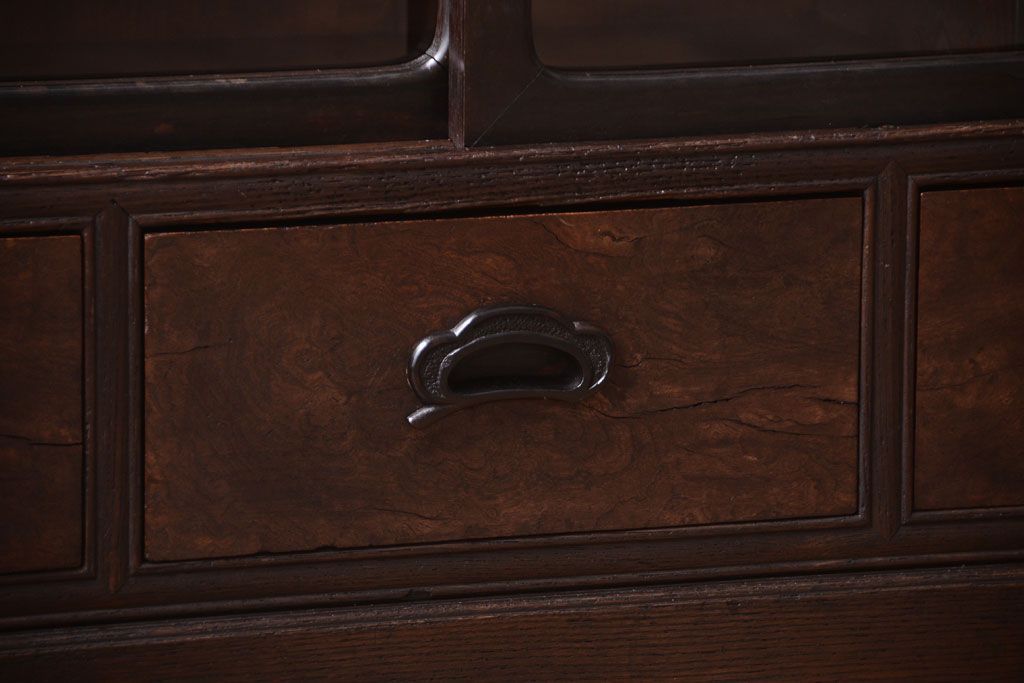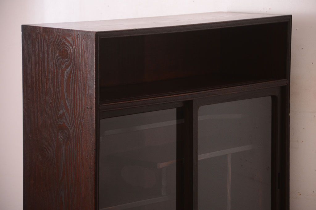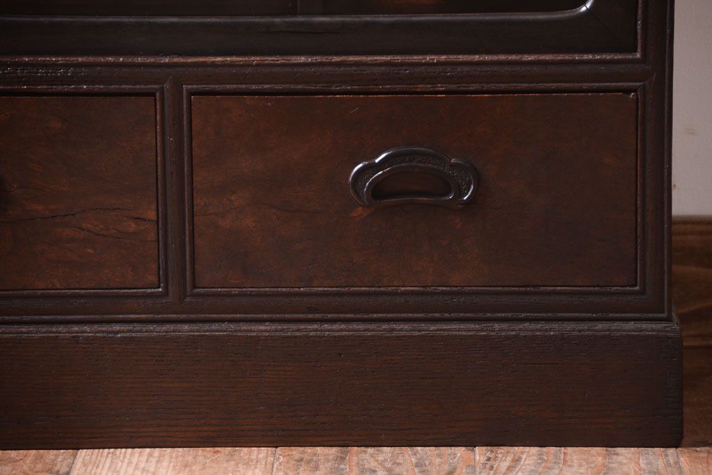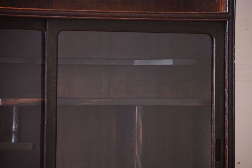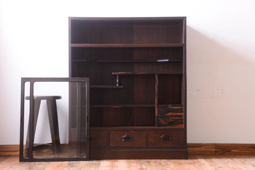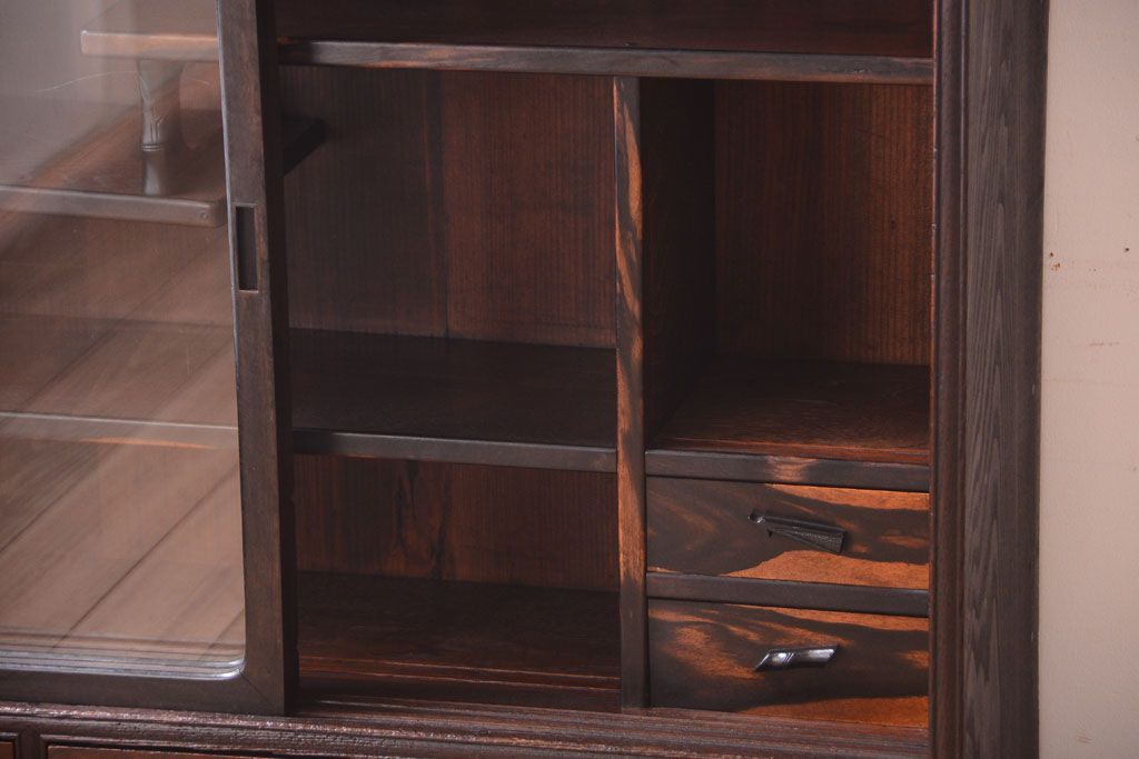 本体上部とガラス戸内下部に付いていた、引き戸・倹飩(けんどん)扉が欠損しています。ご理解の上お買い求めください。