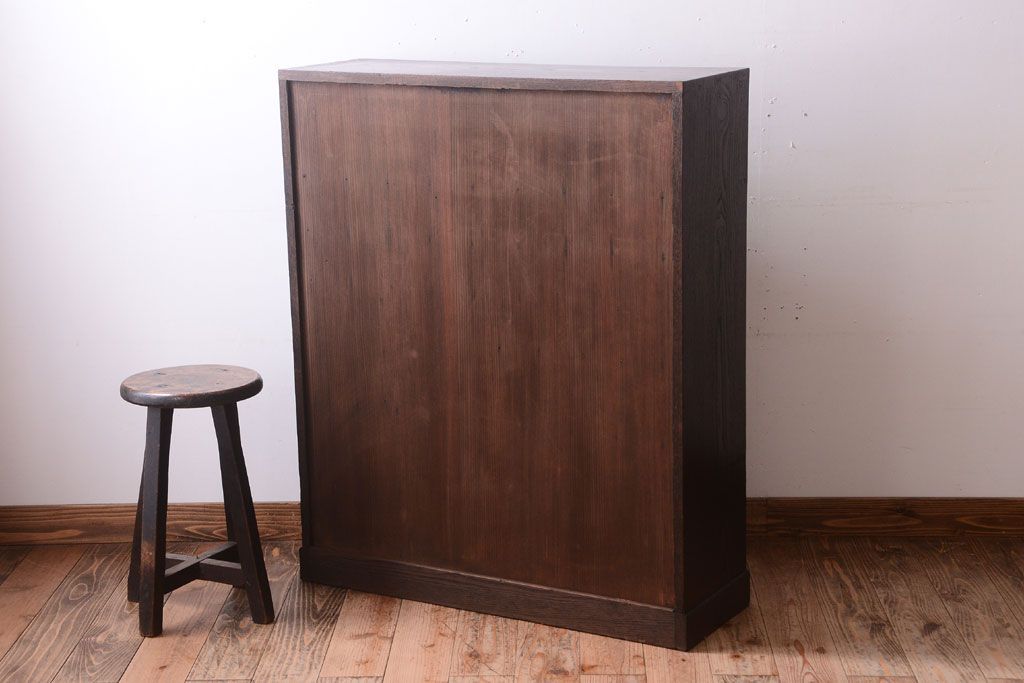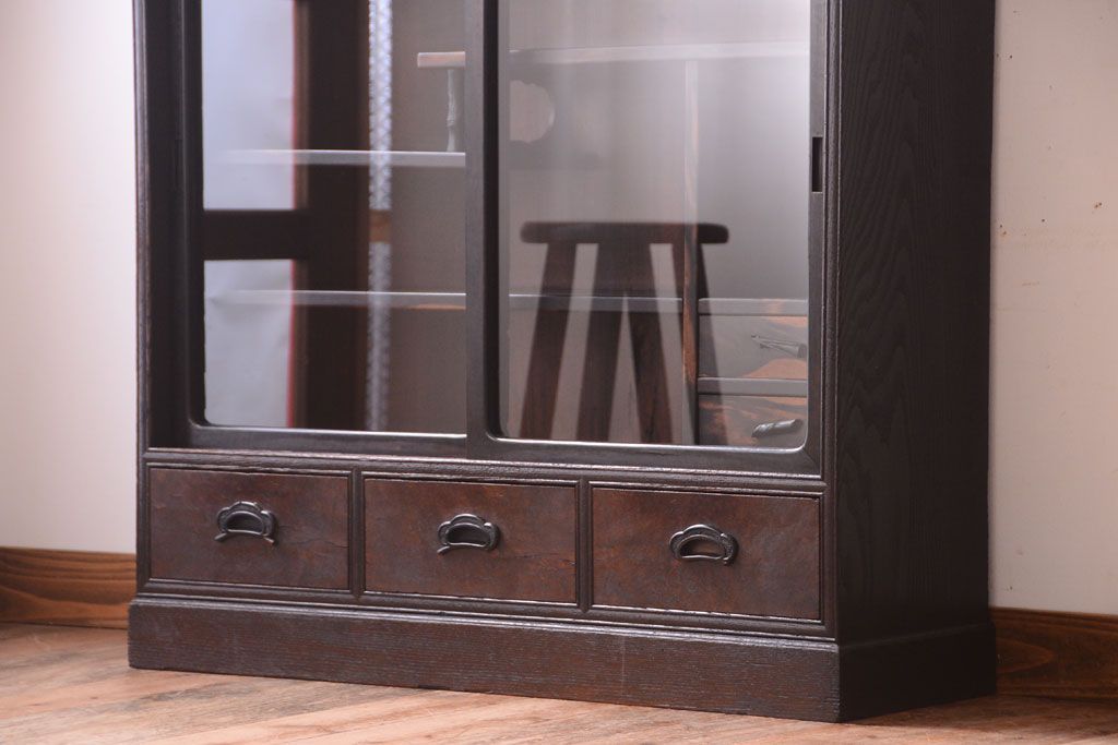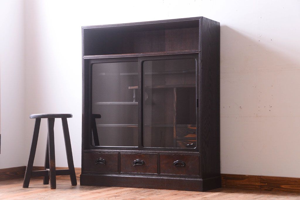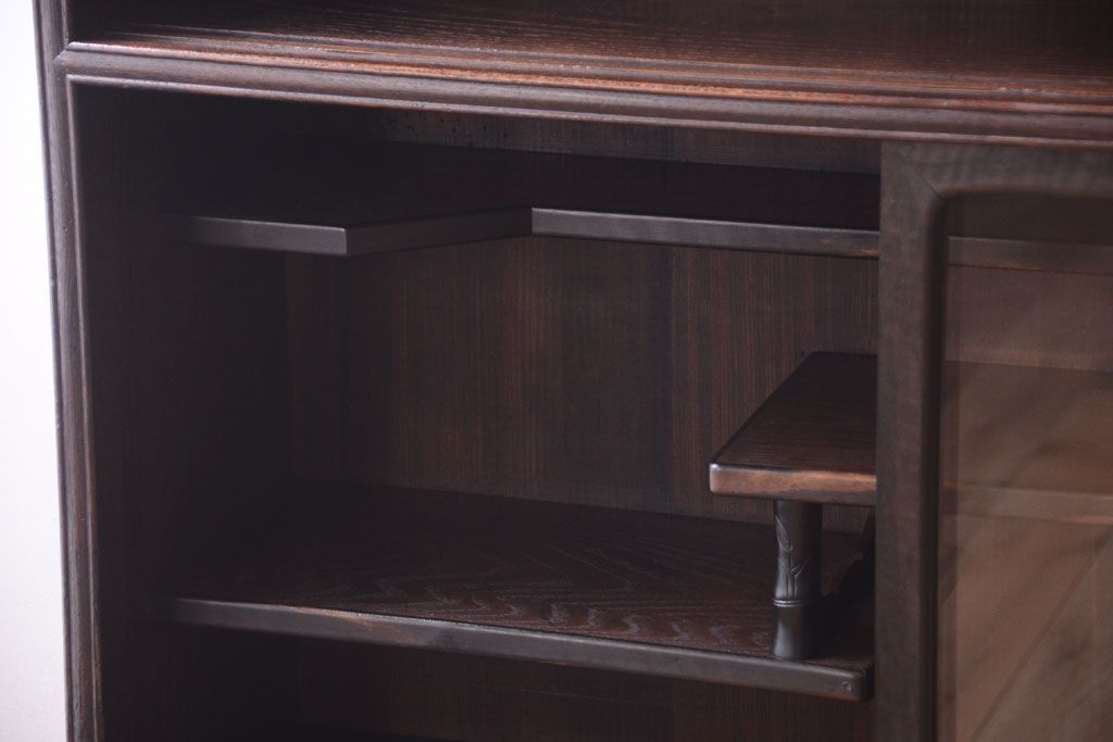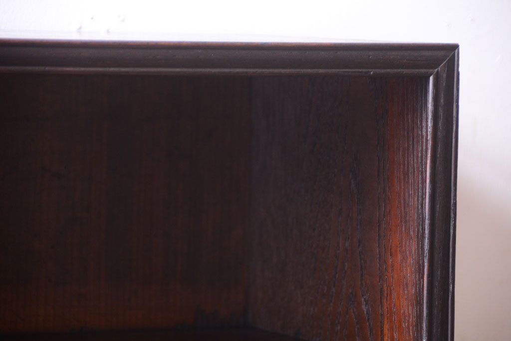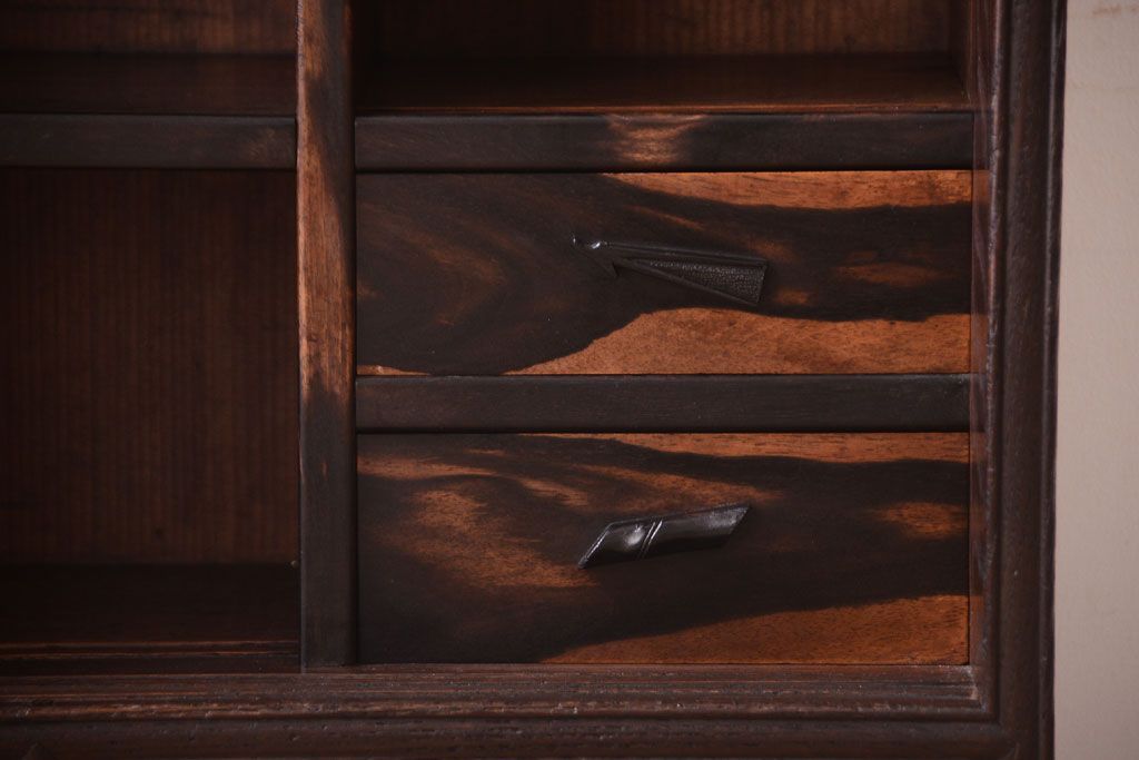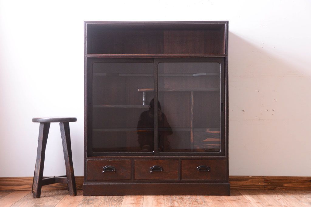 本体上部とガラス戸内下部に付いていた、引き戸・倹飩(けんどん)扉が欠損しています。ご理解の上お買い求めください。