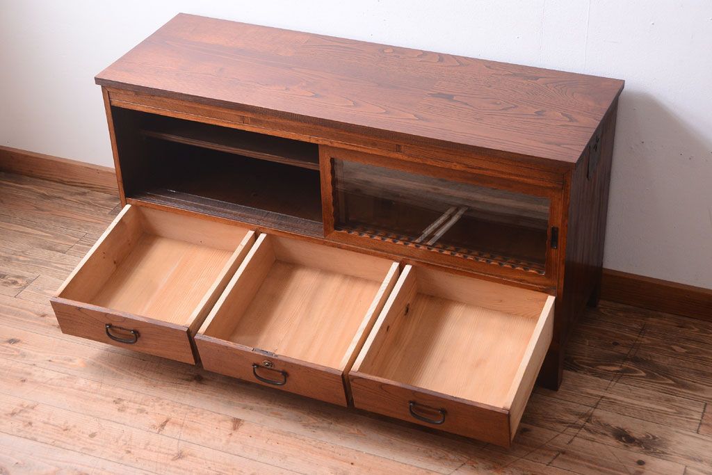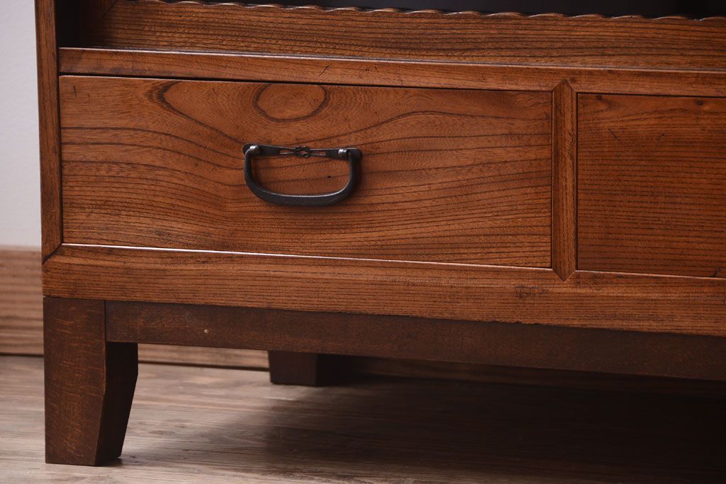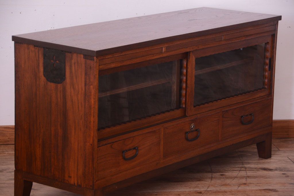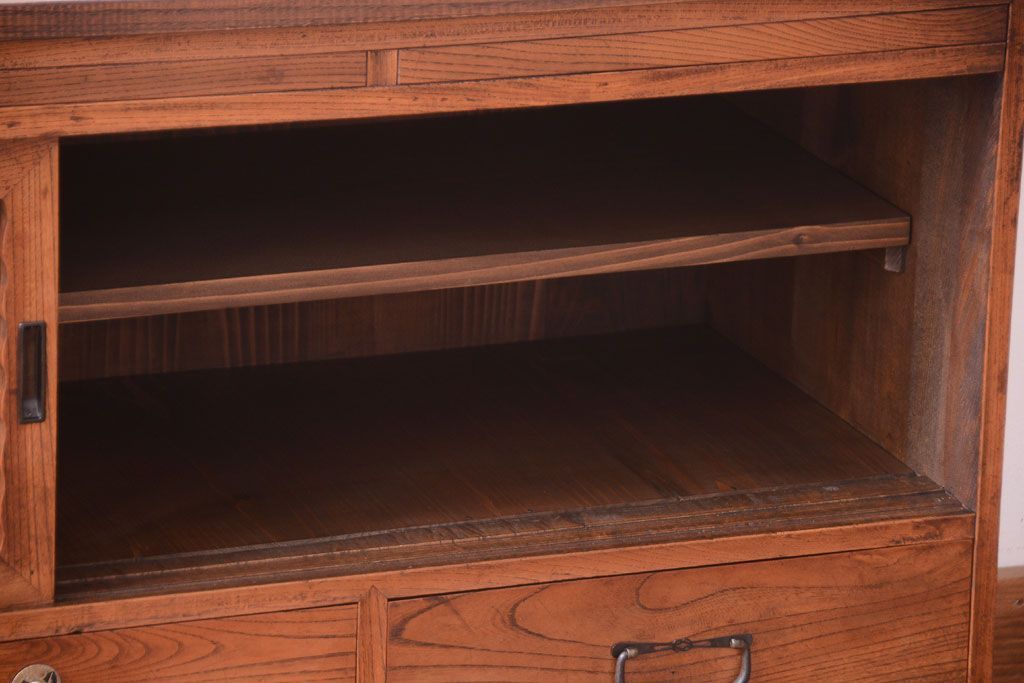 天板栗材リメイク 前面欅材のアンティーク脚付きローボード(テレビボード)です。