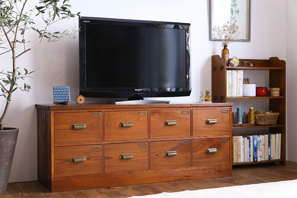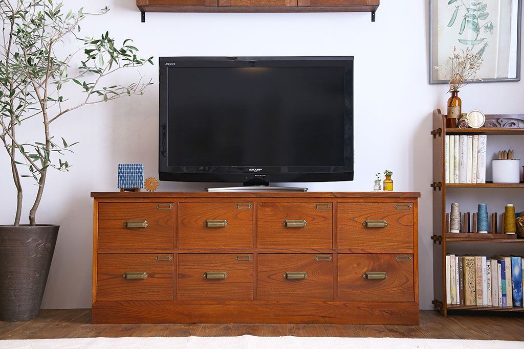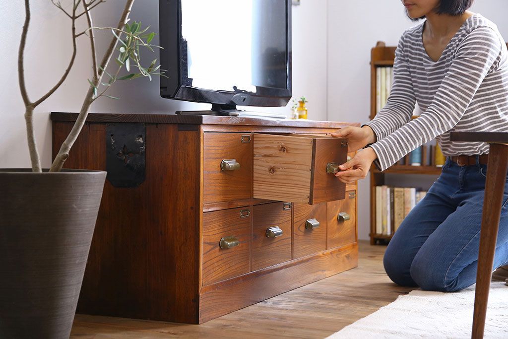 ラフジュ工房> キャビネット・戸棚> テレビ台・ローボード > アンティーク家具 栗材天板のリメイク品 前面欅材の和製アンティークローボード(2)(ローチェスト)