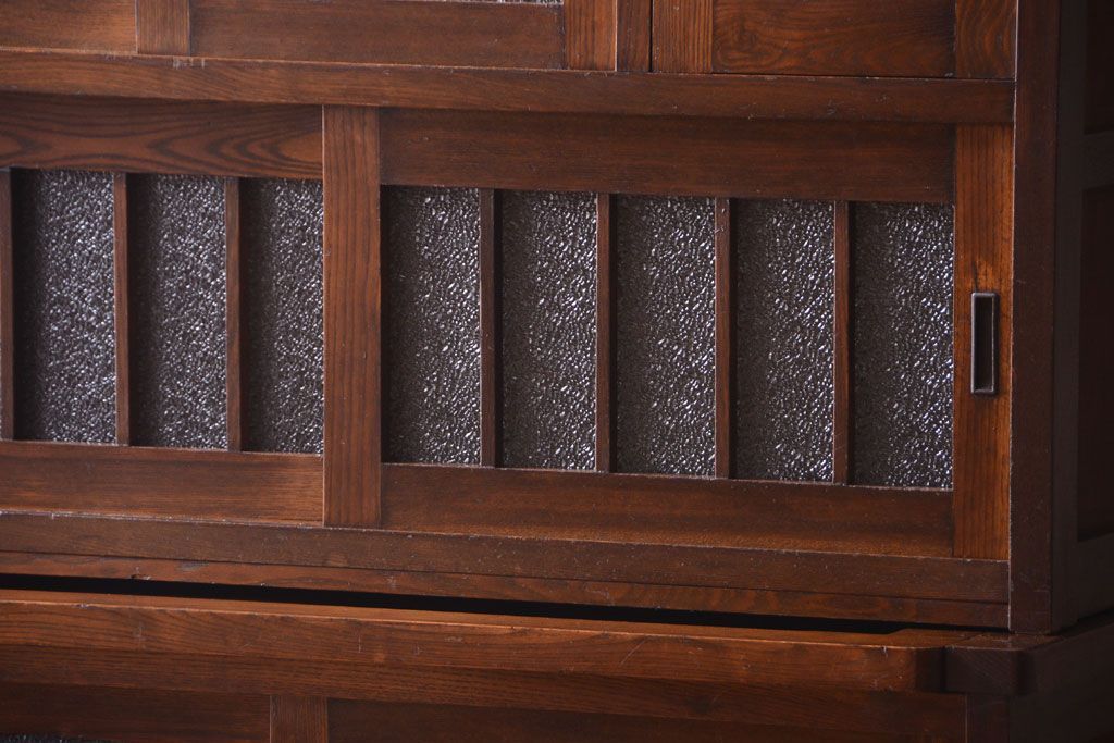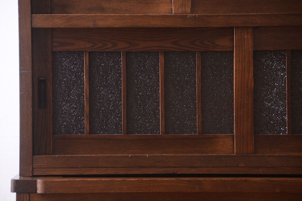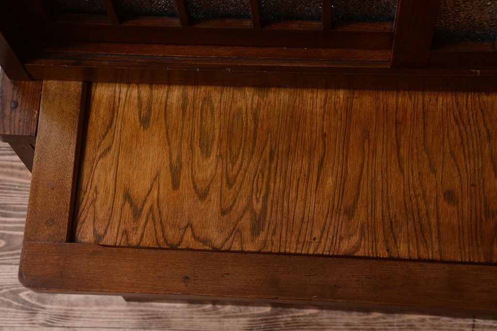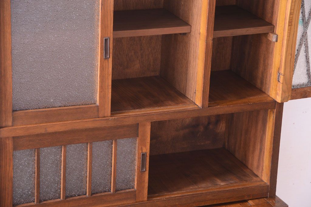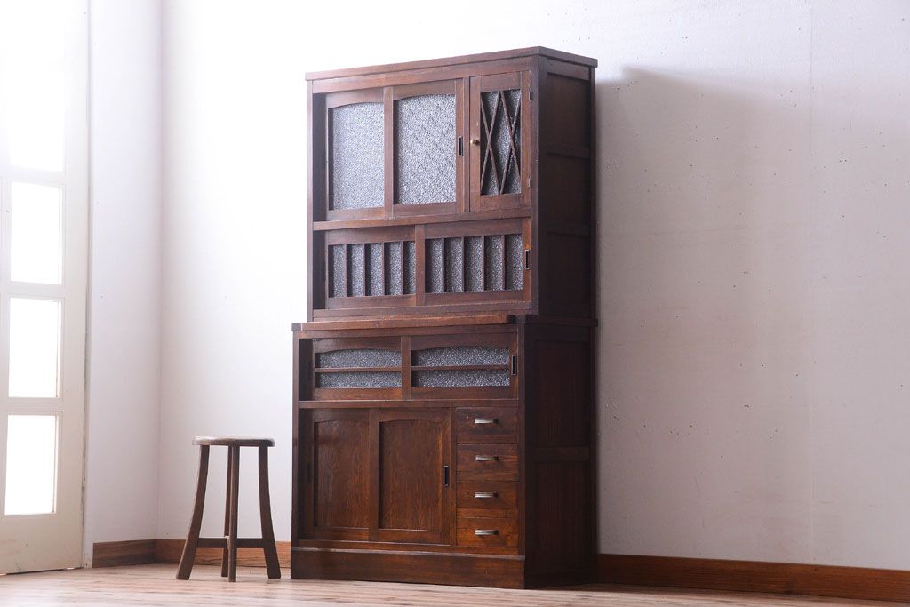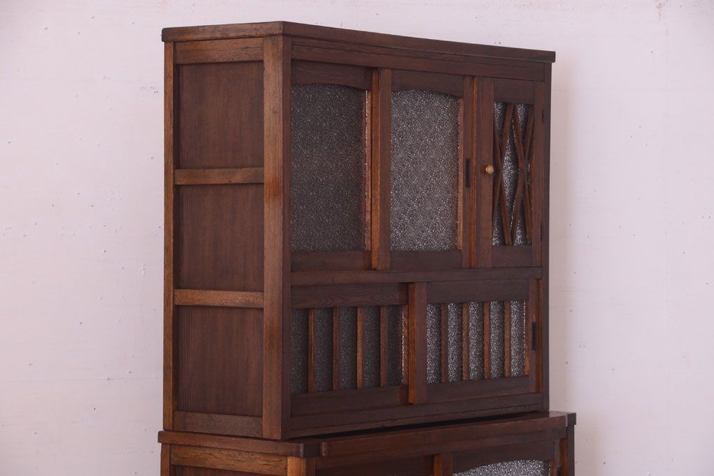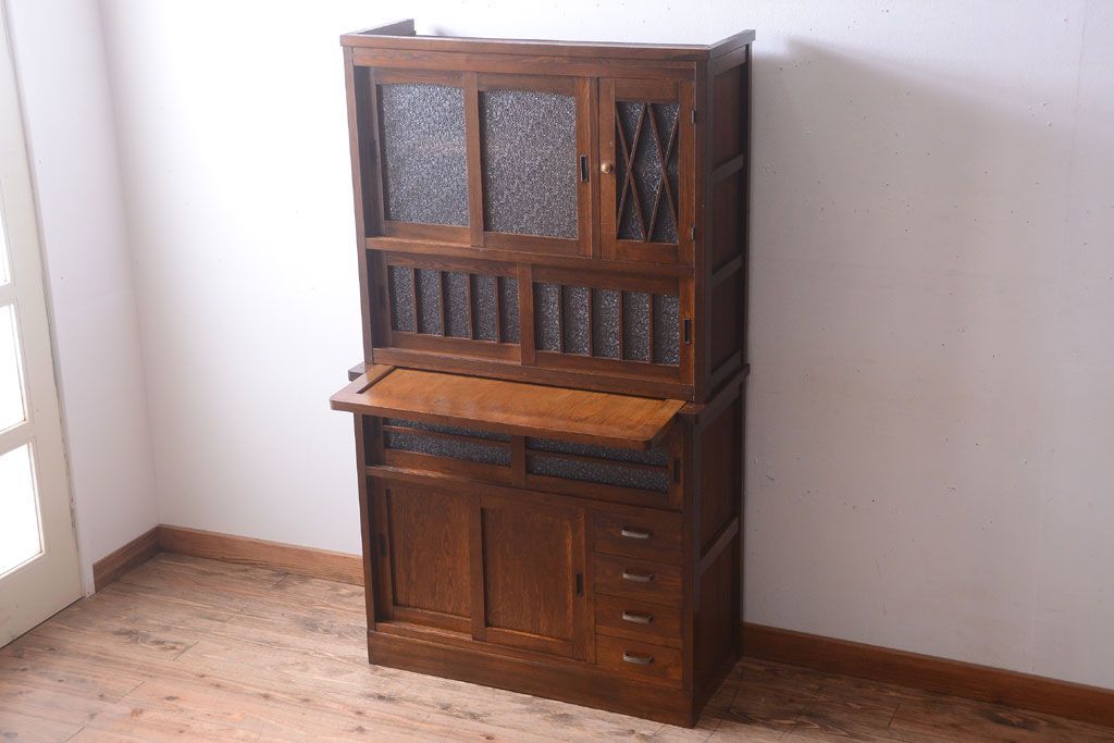 アンティーク家具 ダイヤガラス入り!作業台付き 古い木の和製アンティーク食器棚