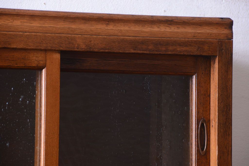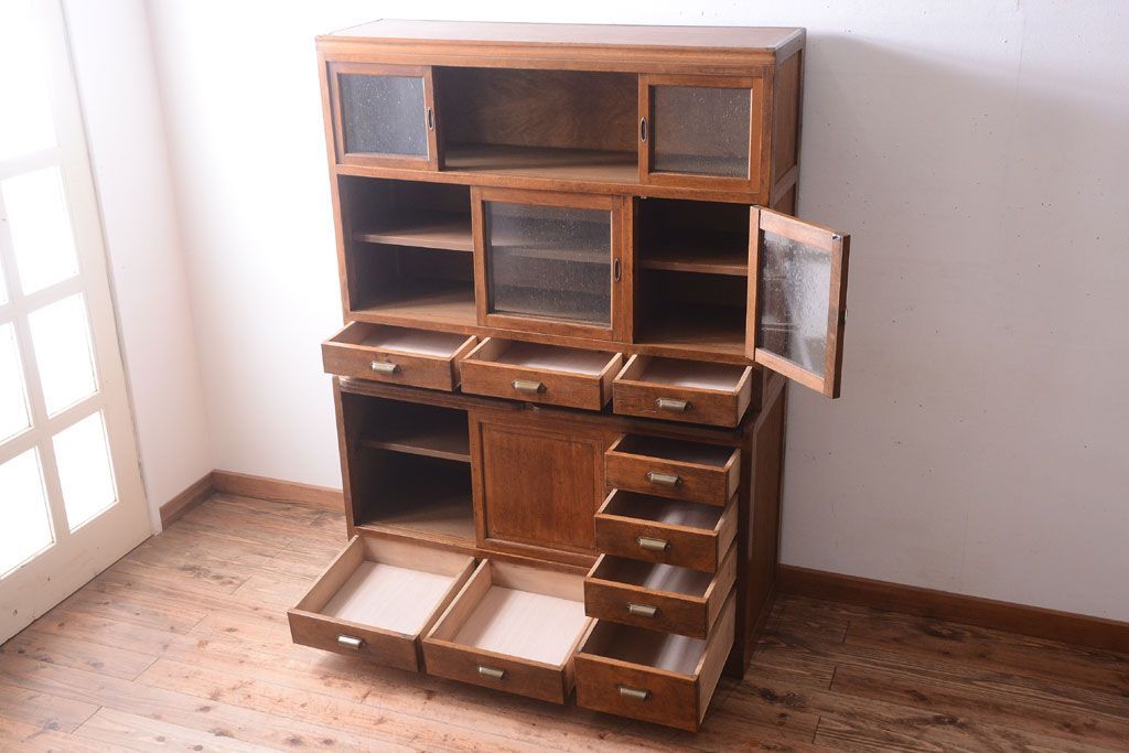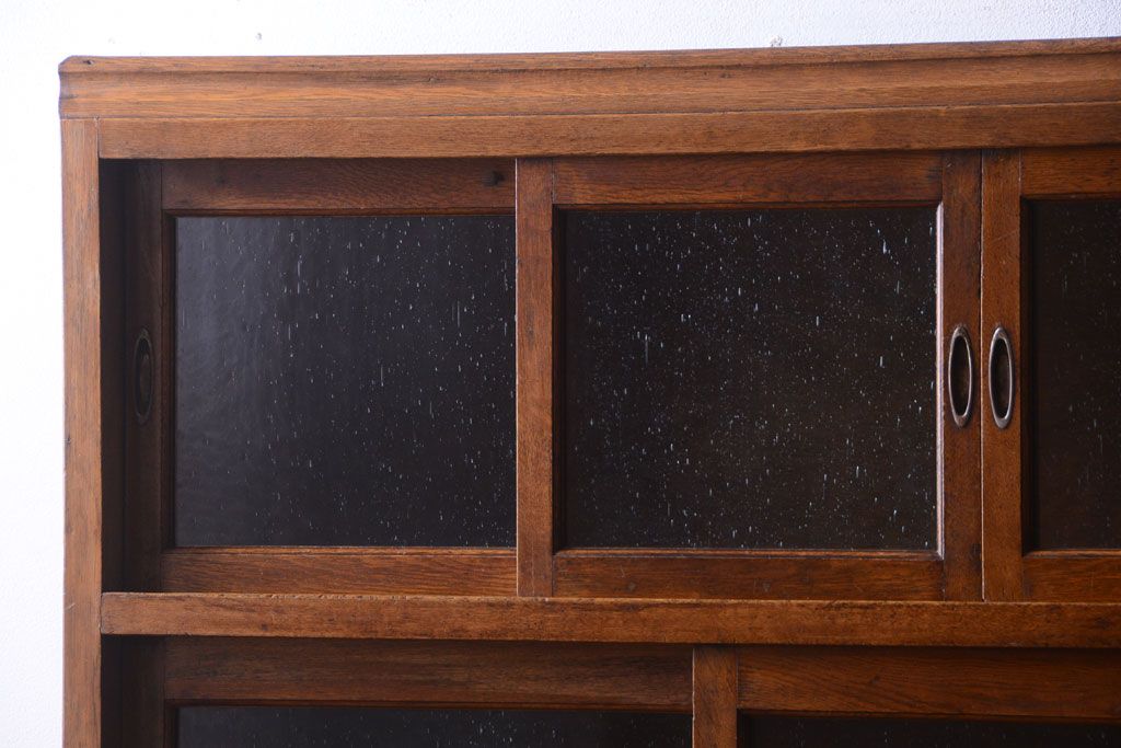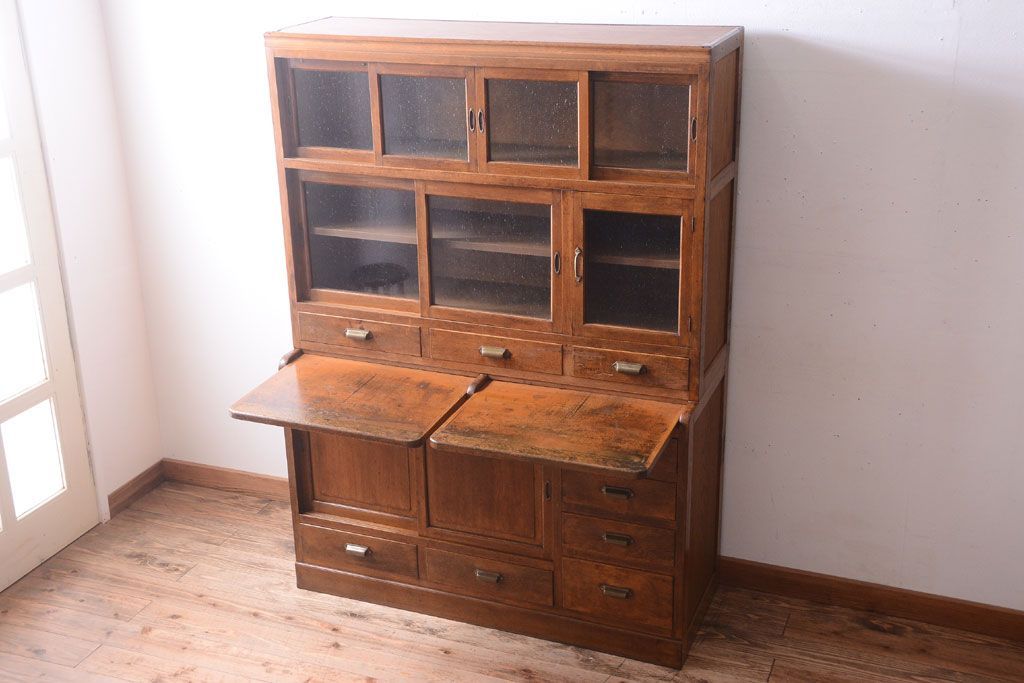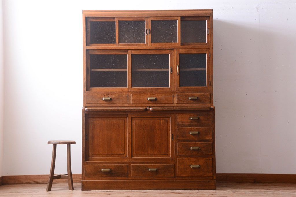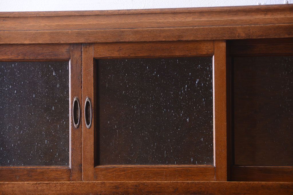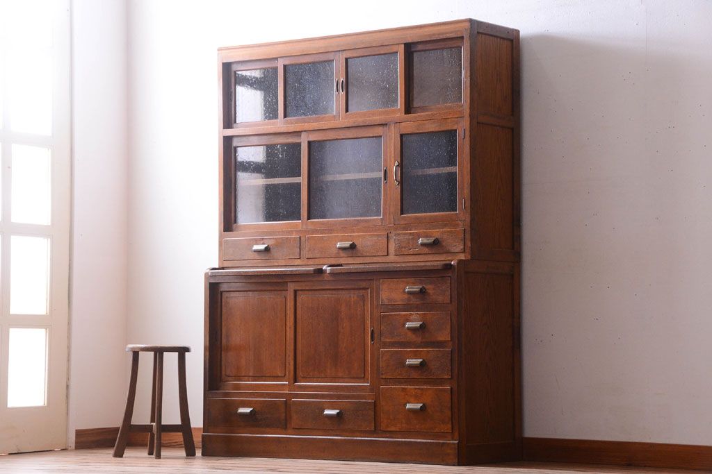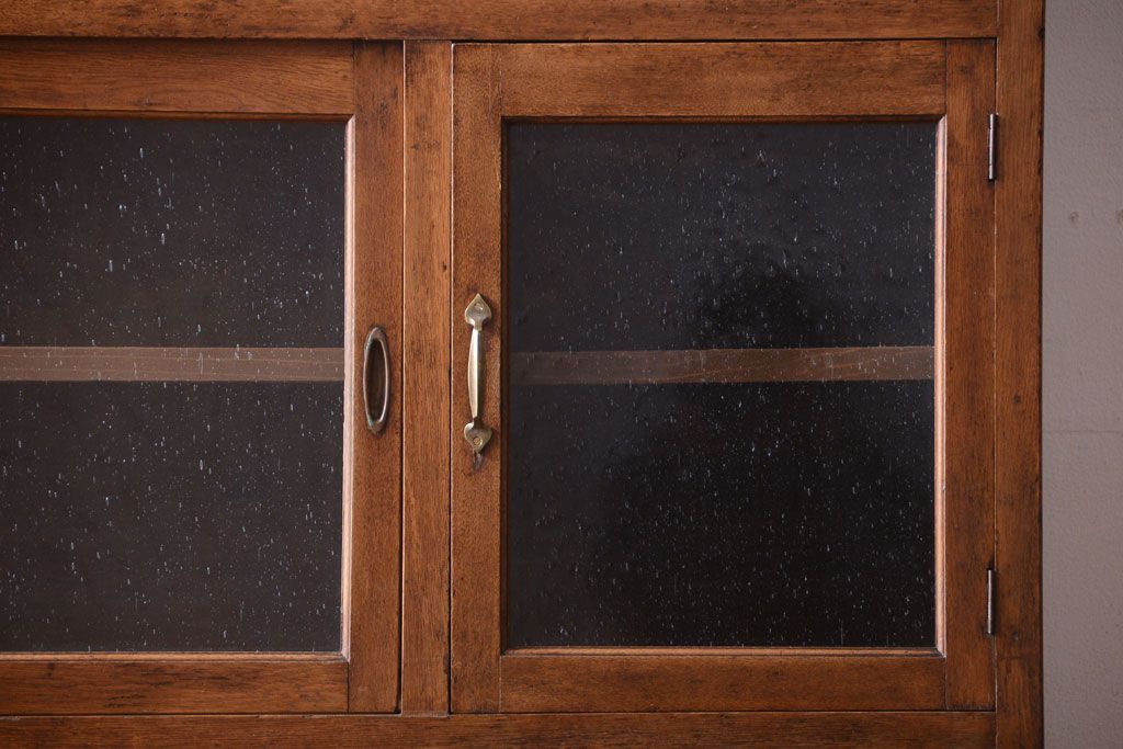 レトロ家具 気泡ガラス入り!古い木の昭和レトロなアンティーク食器棚(カップボード)