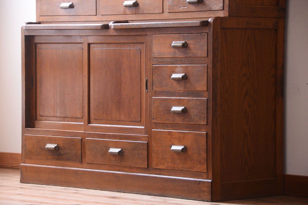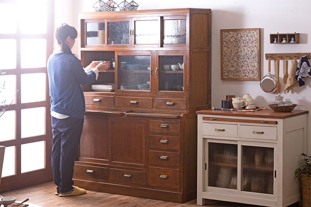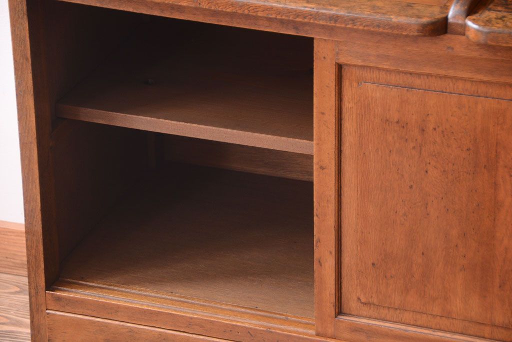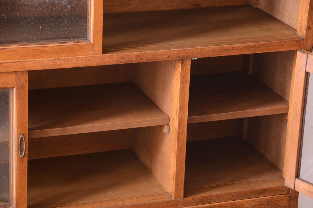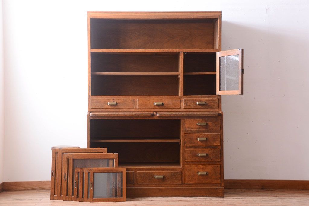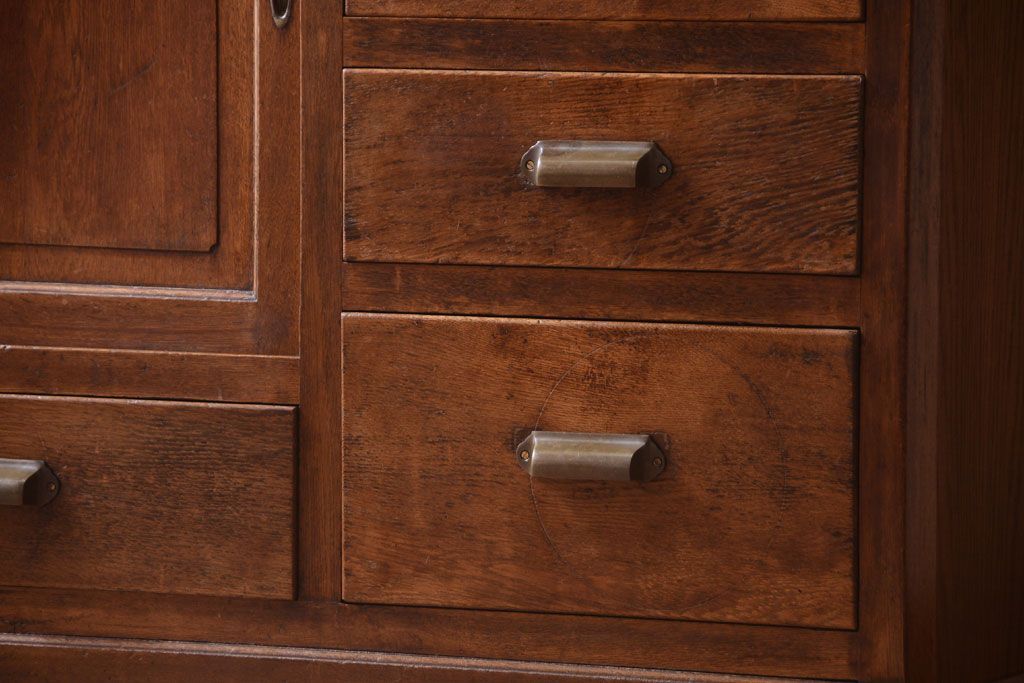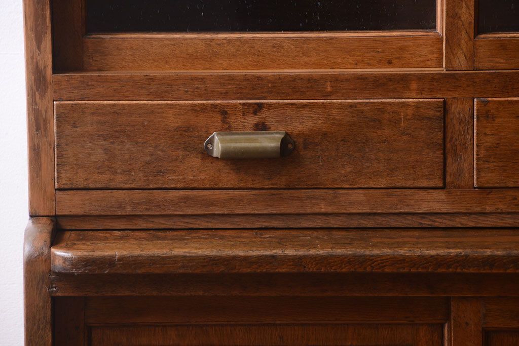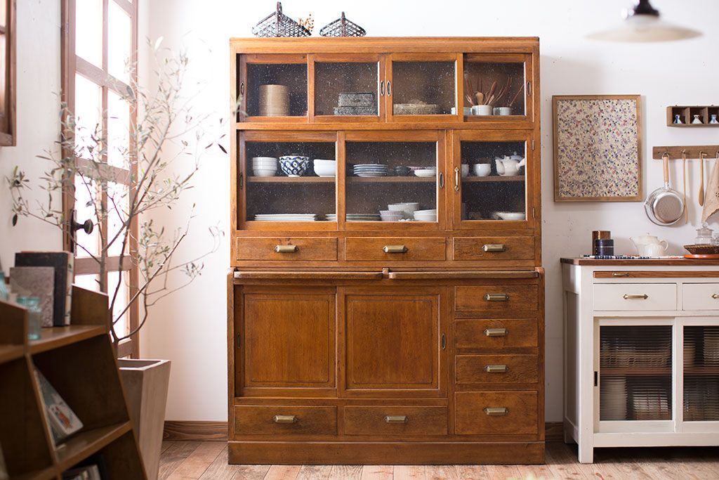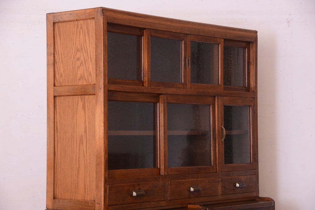 レトロ家具 気泡ガラス入り!古い木の昭和レトロなアンティーク食器棚(カップボード)