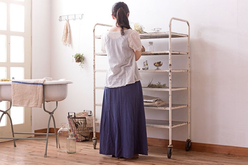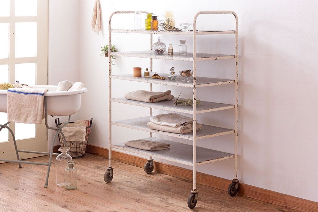 ラフジュ工房> オープンラック・シェルフ> ディスプレイラック > ヴィンテージ家具 イギリスビンテージ キャスター付き!シャビーなアイアンシェルフ