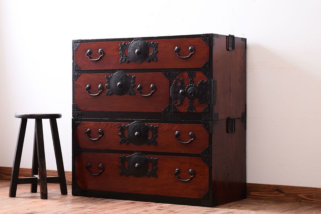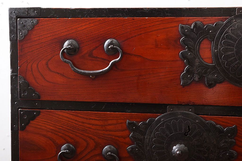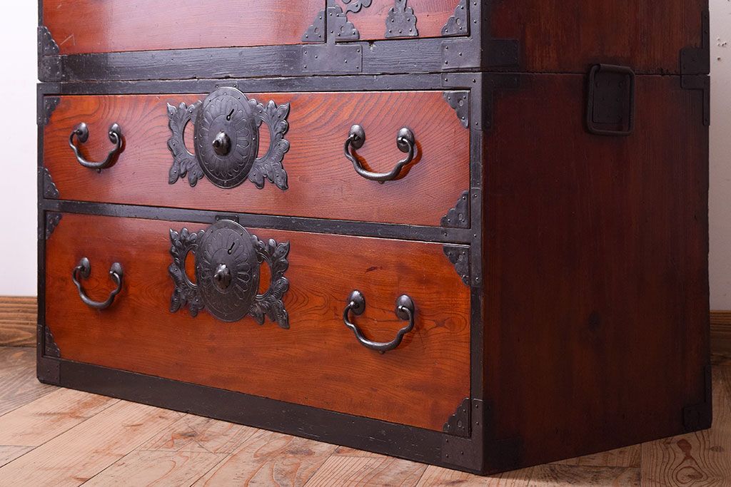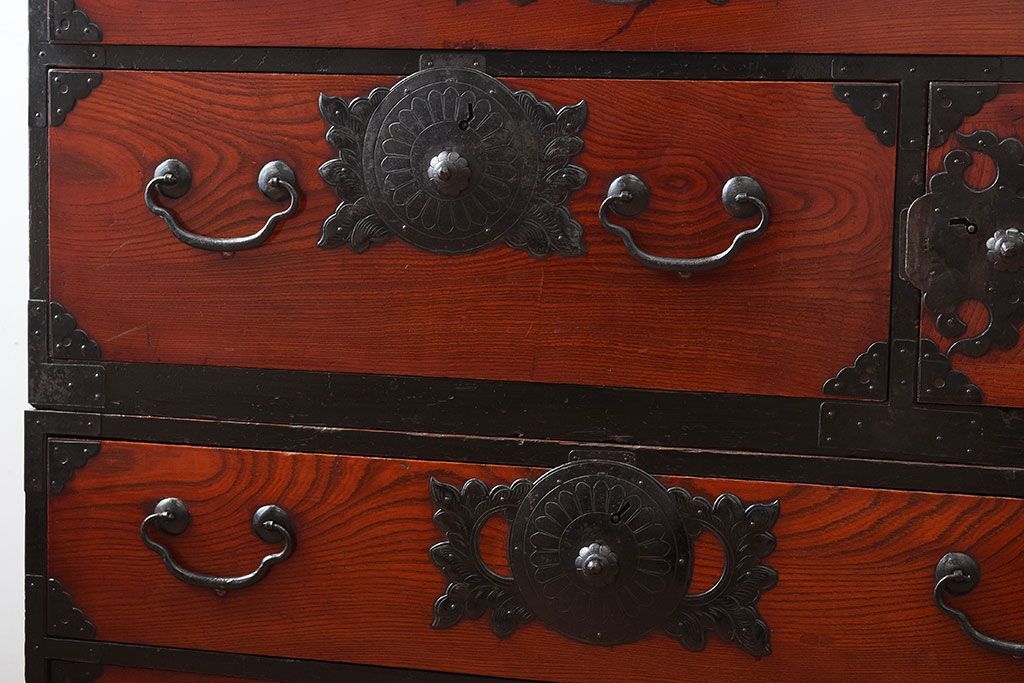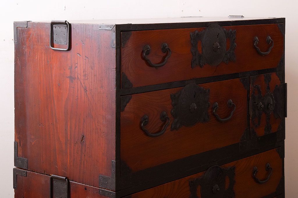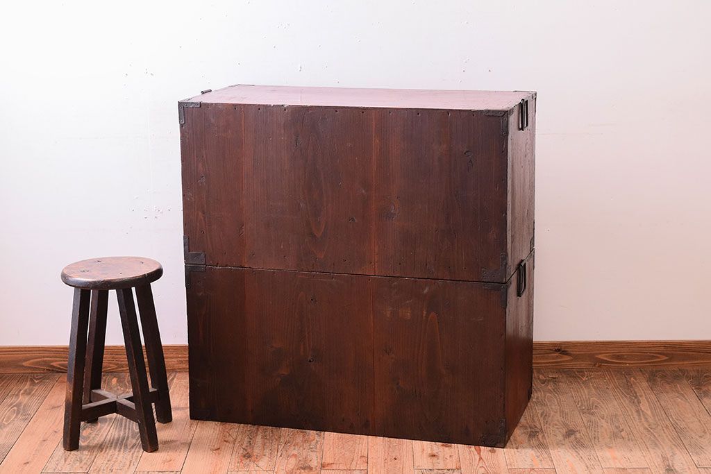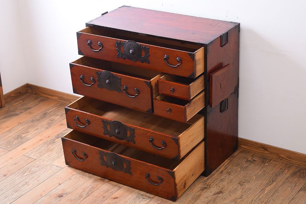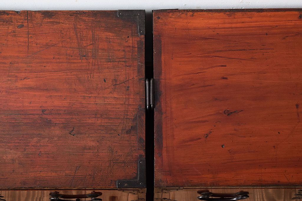アンティーク家具 明治大正期 前面欅材の小ぶりな重ね仙台箪笥(衣装箪笥)