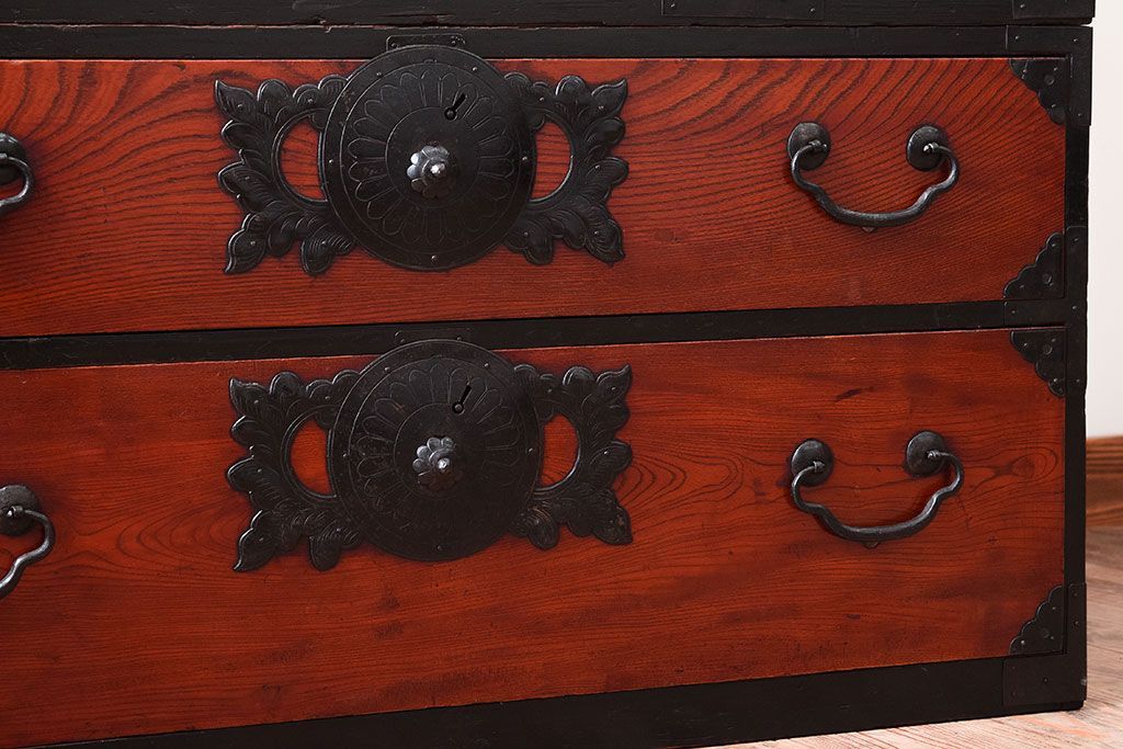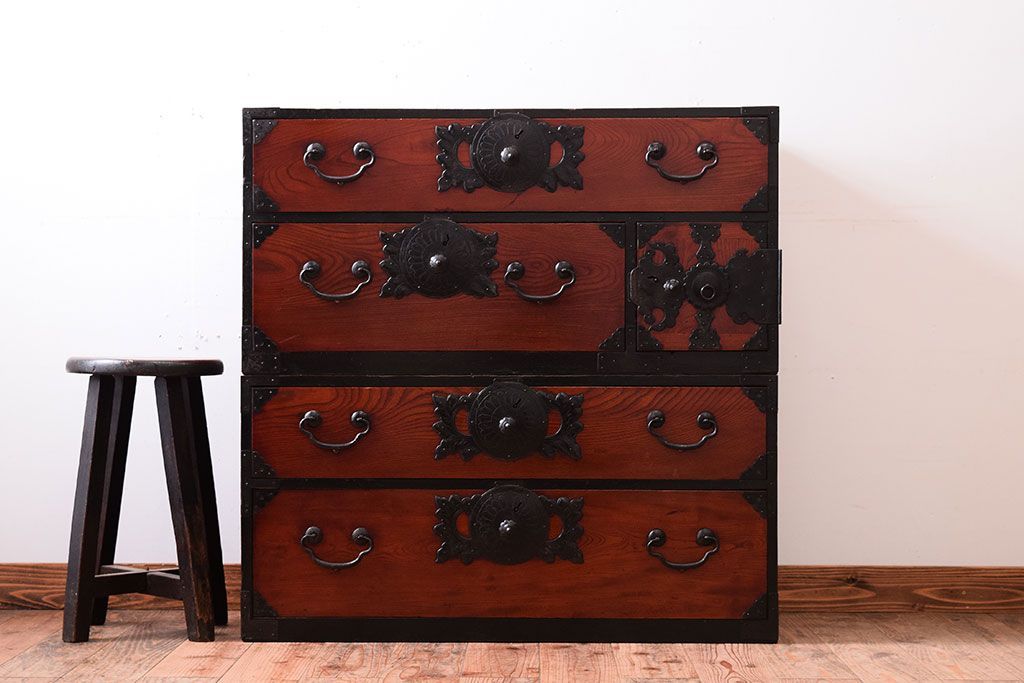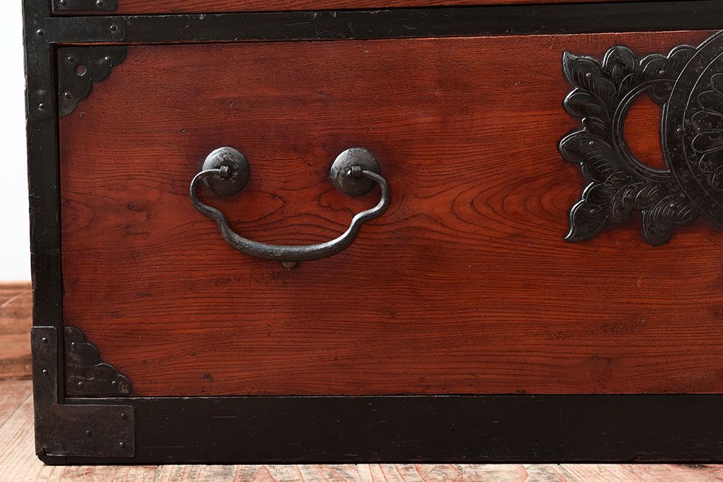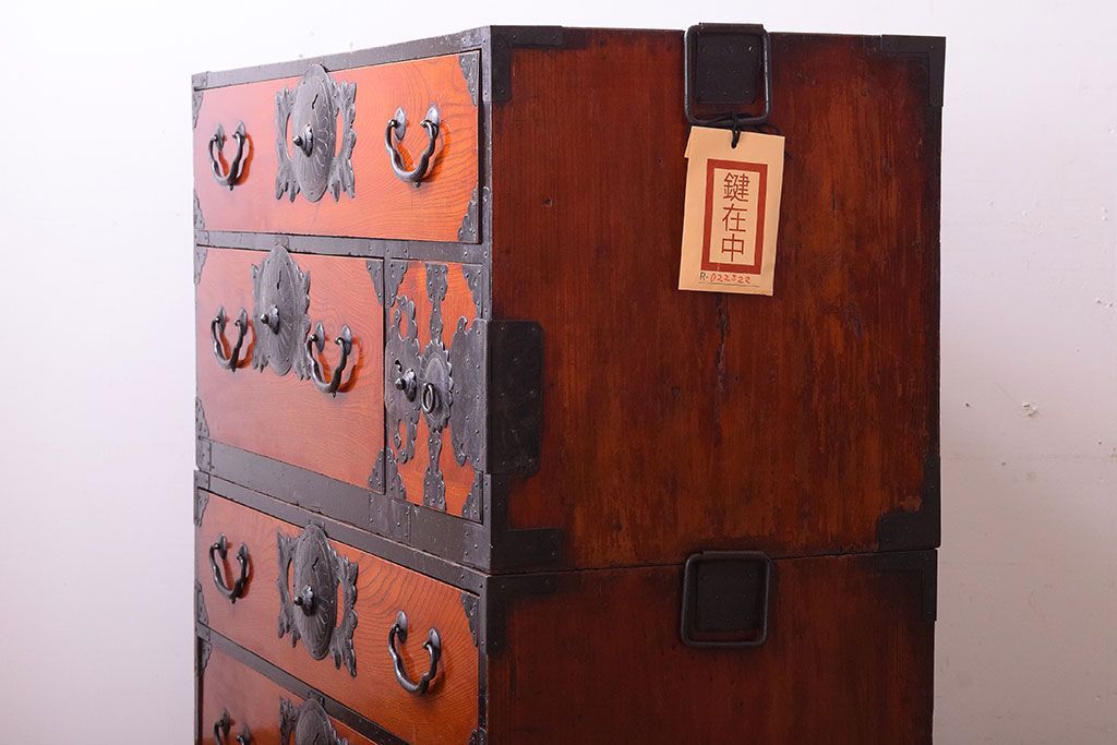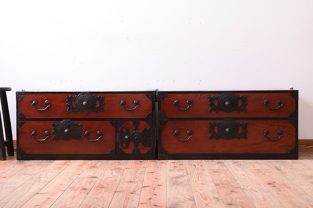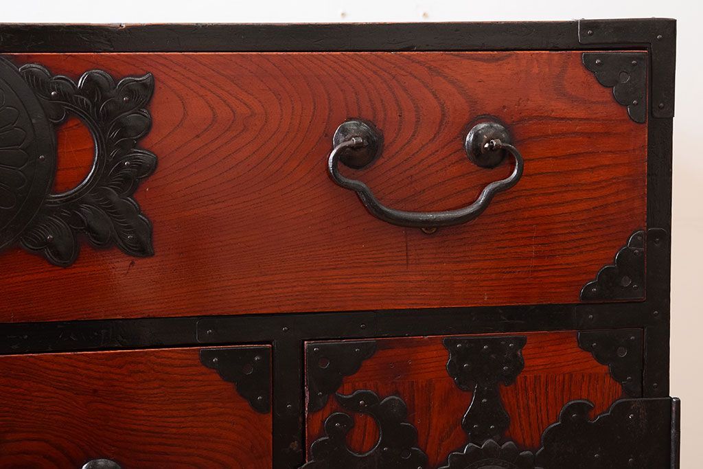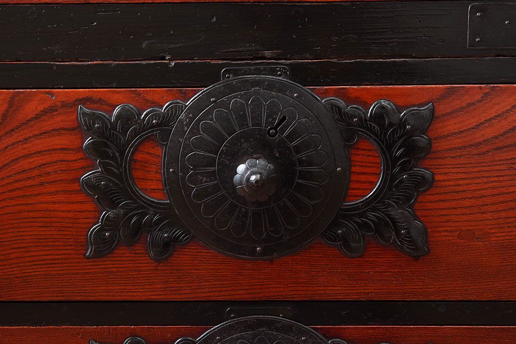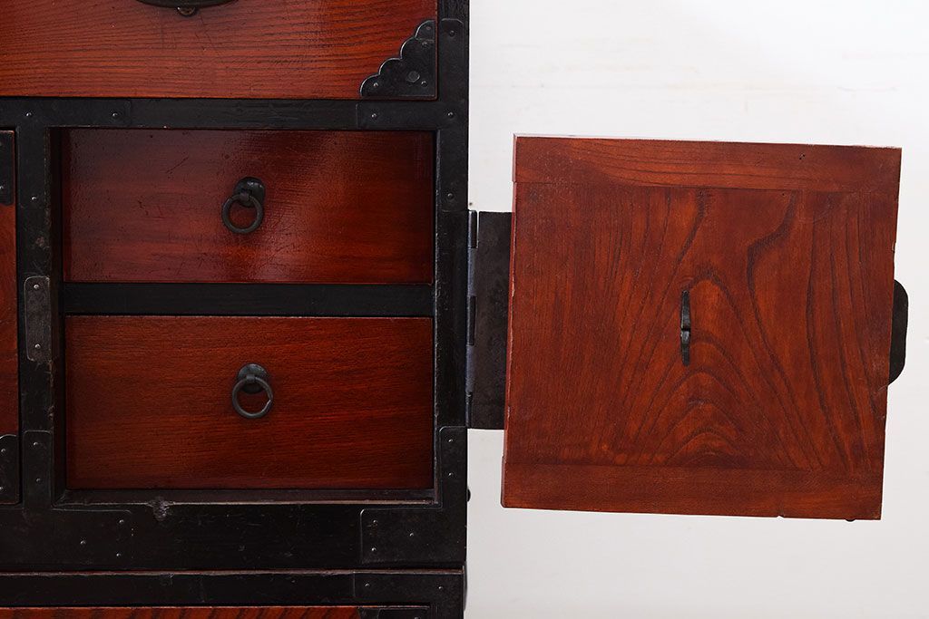 アンティーク家具 明治大正期 前面欅材の小ぶりな重ね仙台箪笥(衣装箪笥)