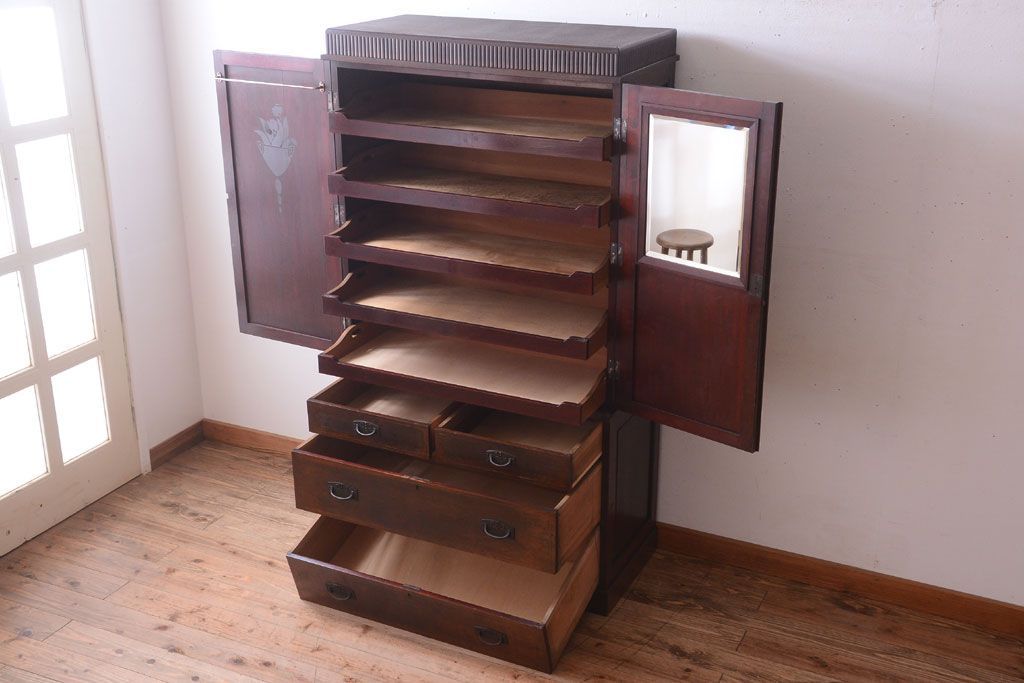 アンティーク家具 大正ロマン 象嵌入り!和製アンティークの鏡付き衣装箪笥