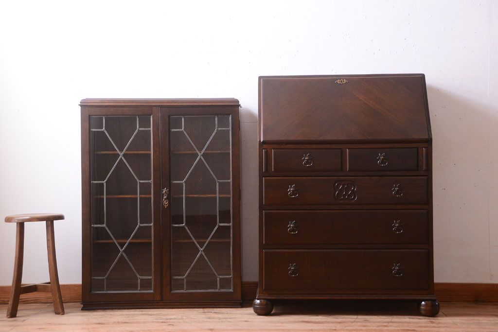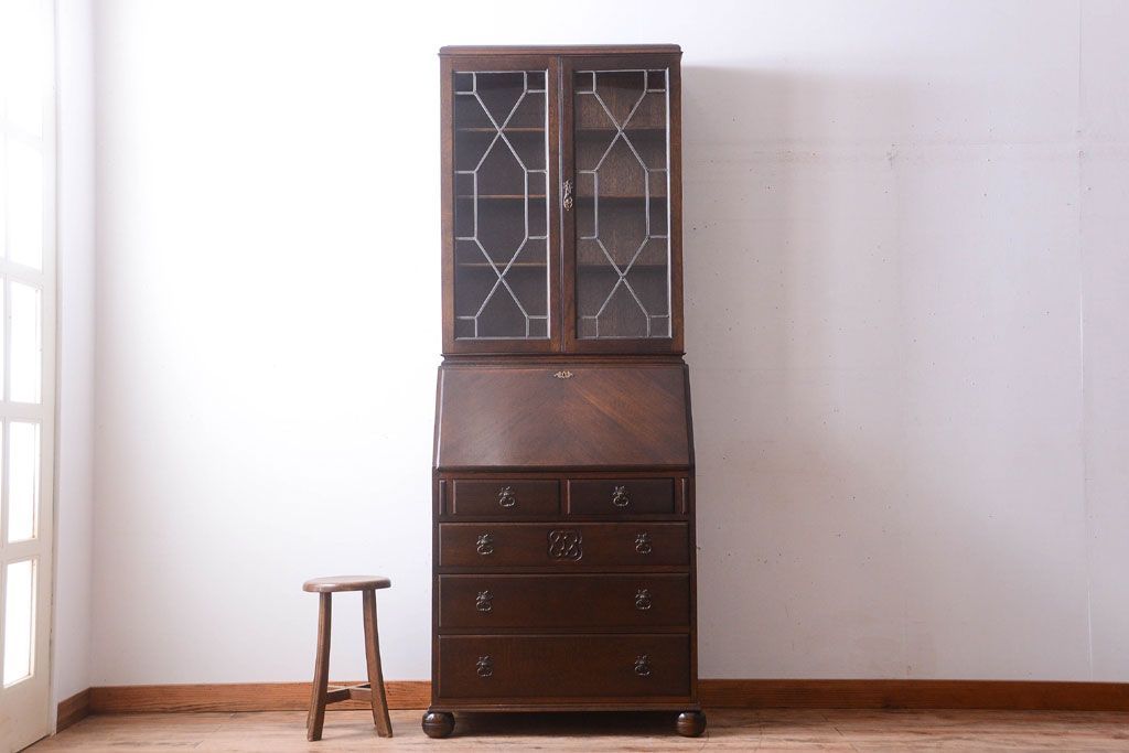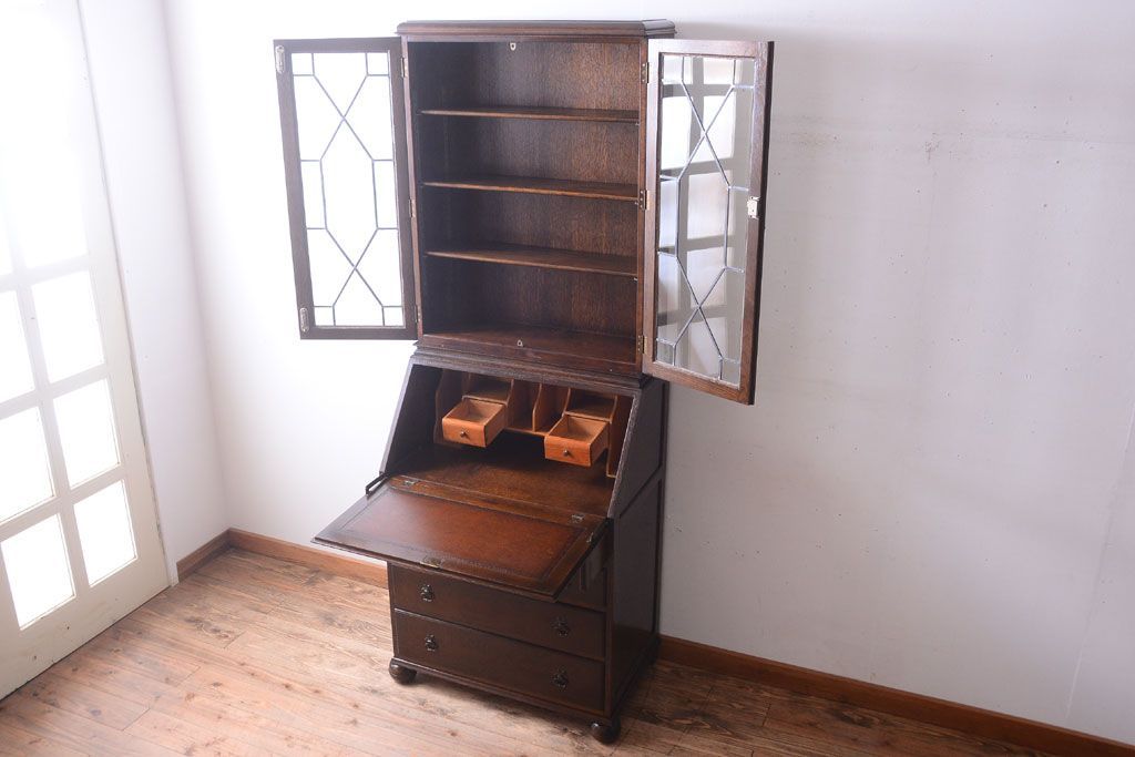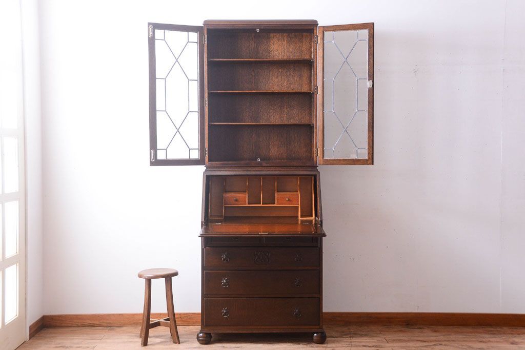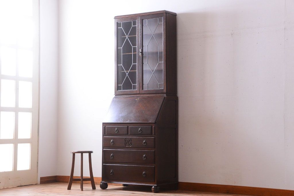 ステンドグラスが美しい、オーク材で作られたビューローブックケース