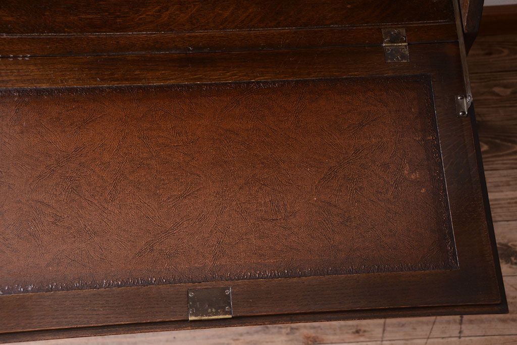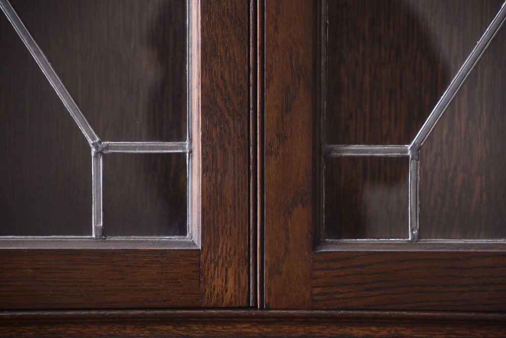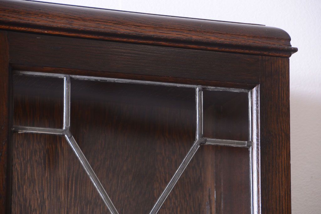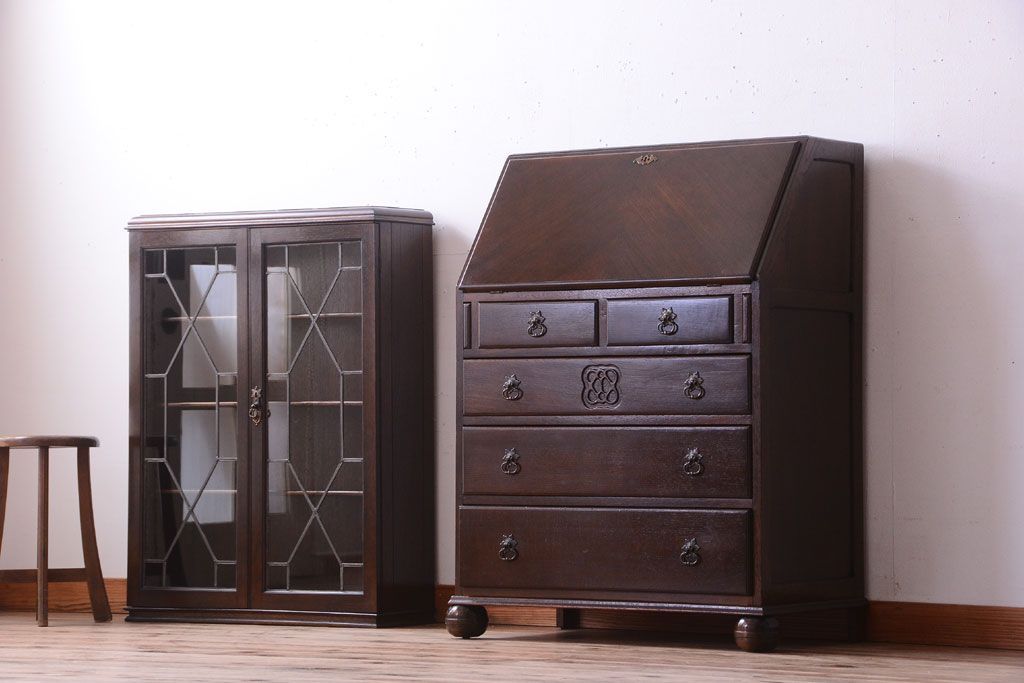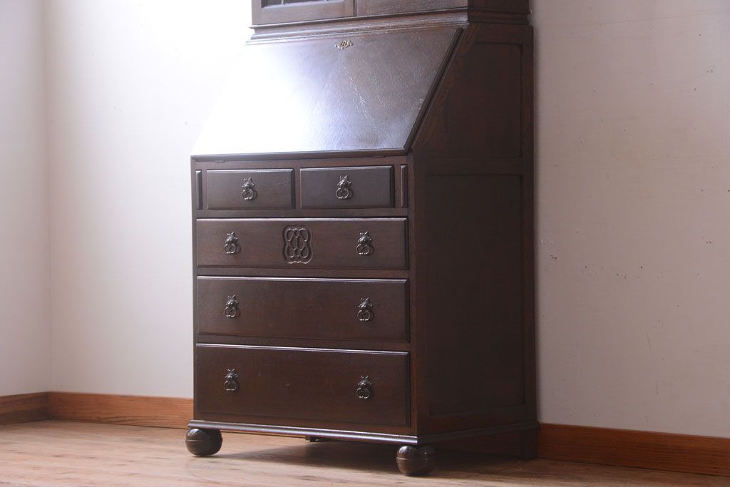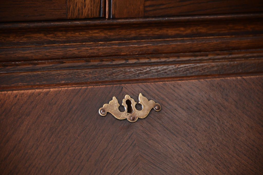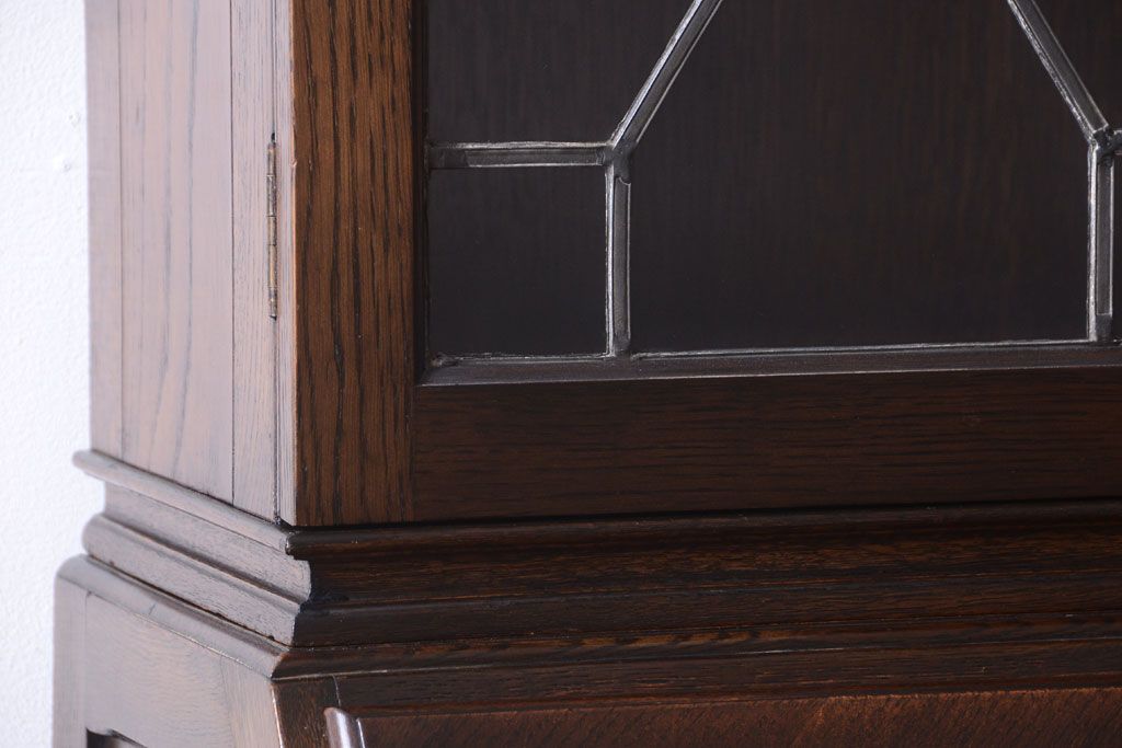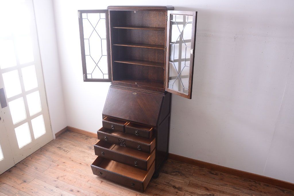透明なステンドグラスが素敵な、イギリスアンティークのビューローブックケースです。ヨーロッパの家具に馴染み深い高級素材・オーク材が使われ、落ち着いた色合いが印象的なお品です。引き出しも多く、デザイン性と収納性を兼ね備えており、使い勝手の良さも魅力的です。上品な空間づくりにおすすめの逸品です。