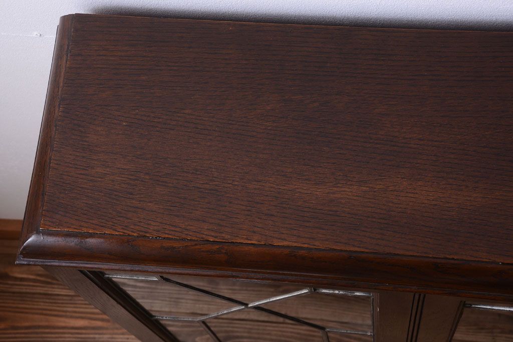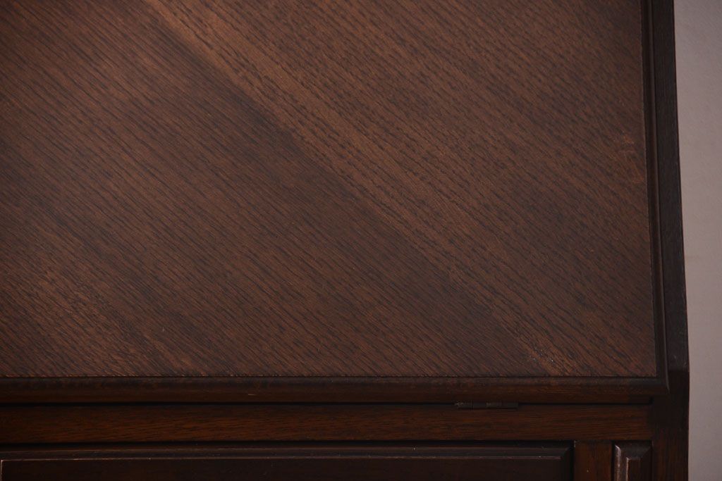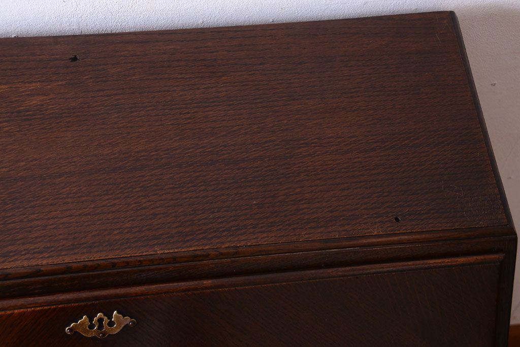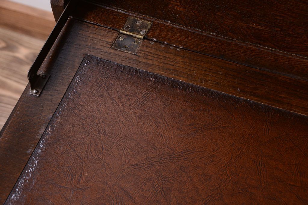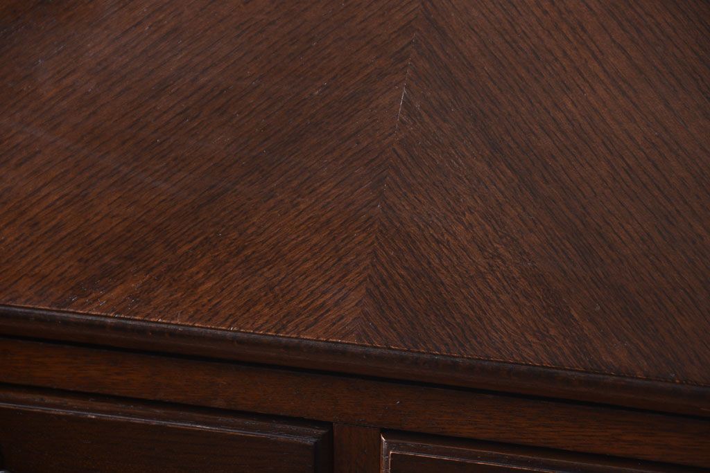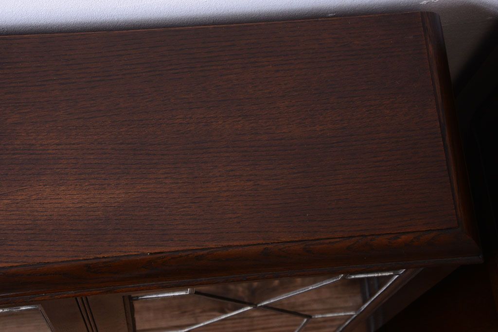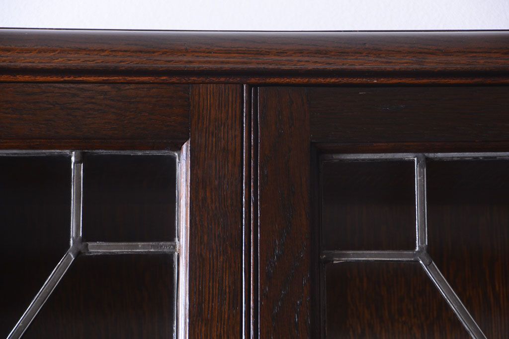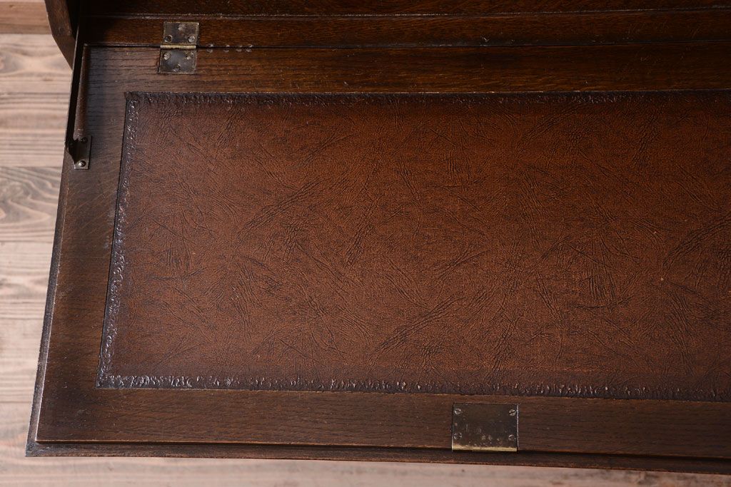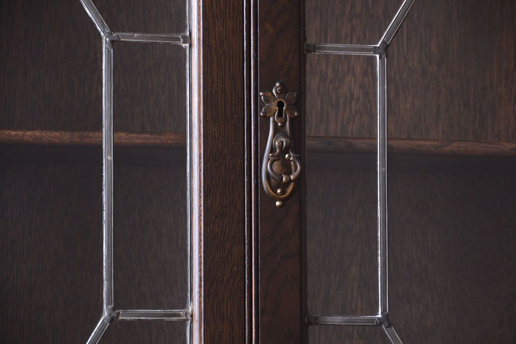 透明なステンドグラスが素敵な、イギリスアンティークのビューローブックケースです。ヨーロッパの家具に馴染み深い高級素材・オーク材が使われ、落ち着いた色合いが印象的なお品です。引き出しも多く、デザイン性と収納性を兼ね備えており、使い勝手の良さも魅力的です。上品な空間づくりにおすすめの逸品です。