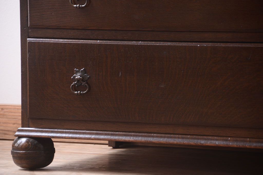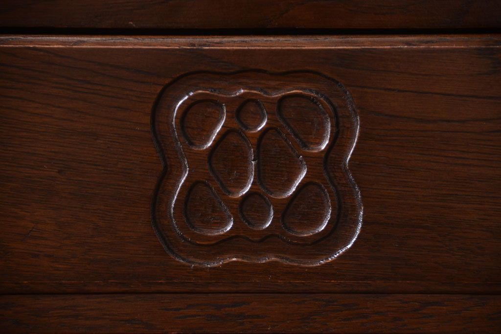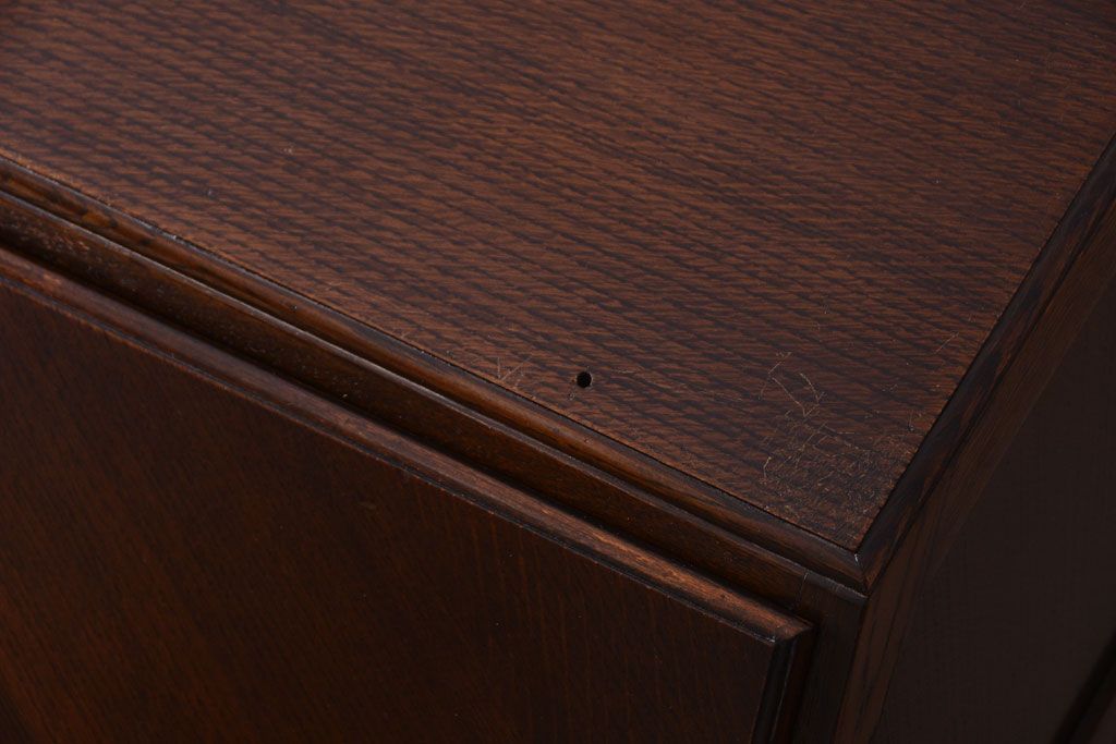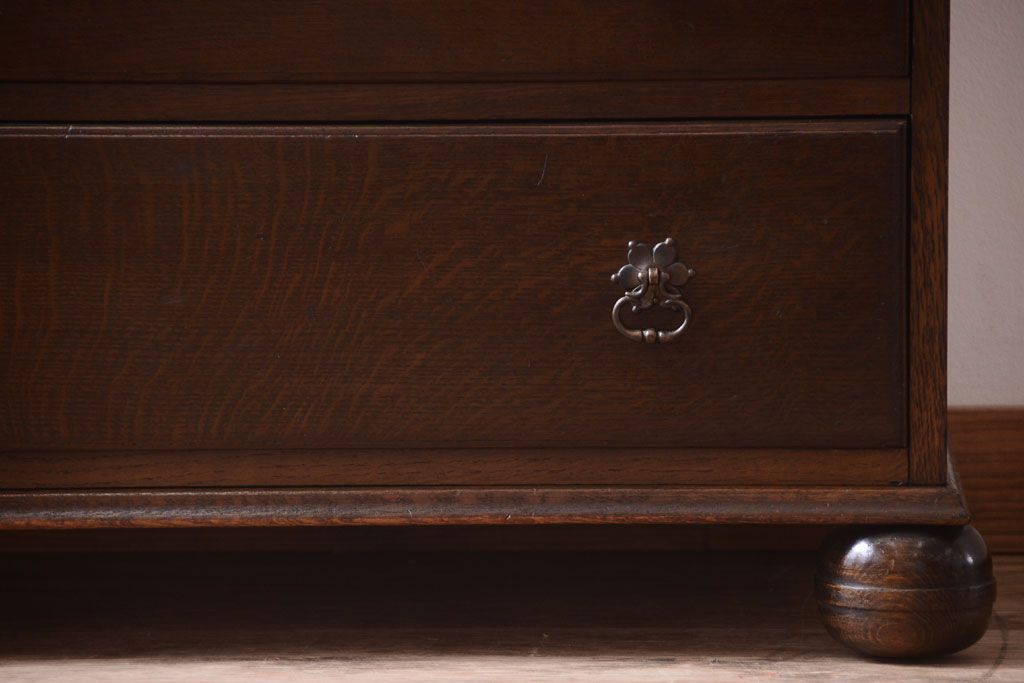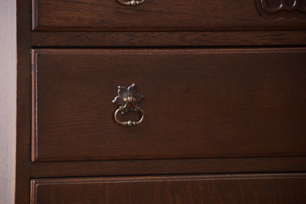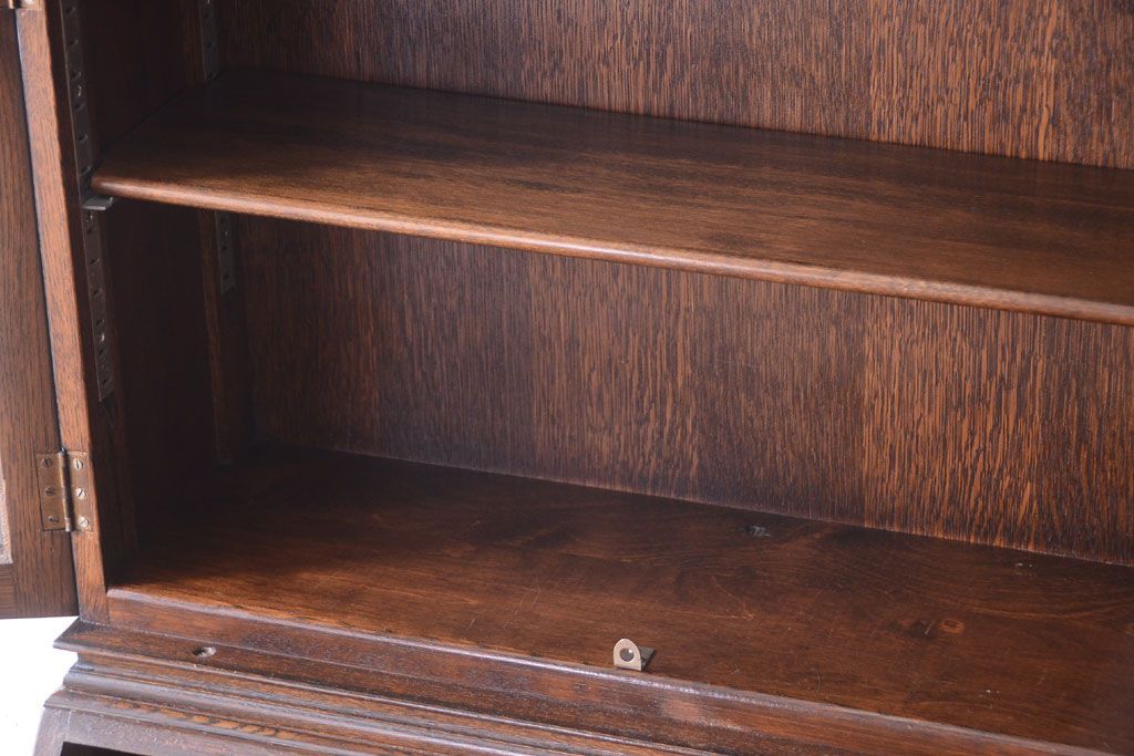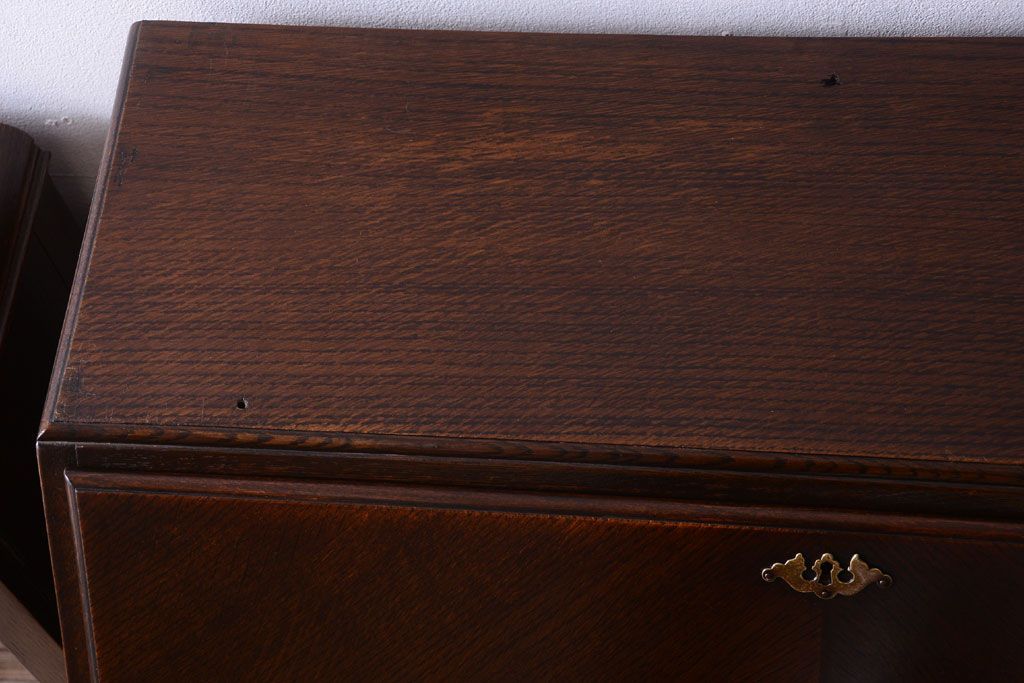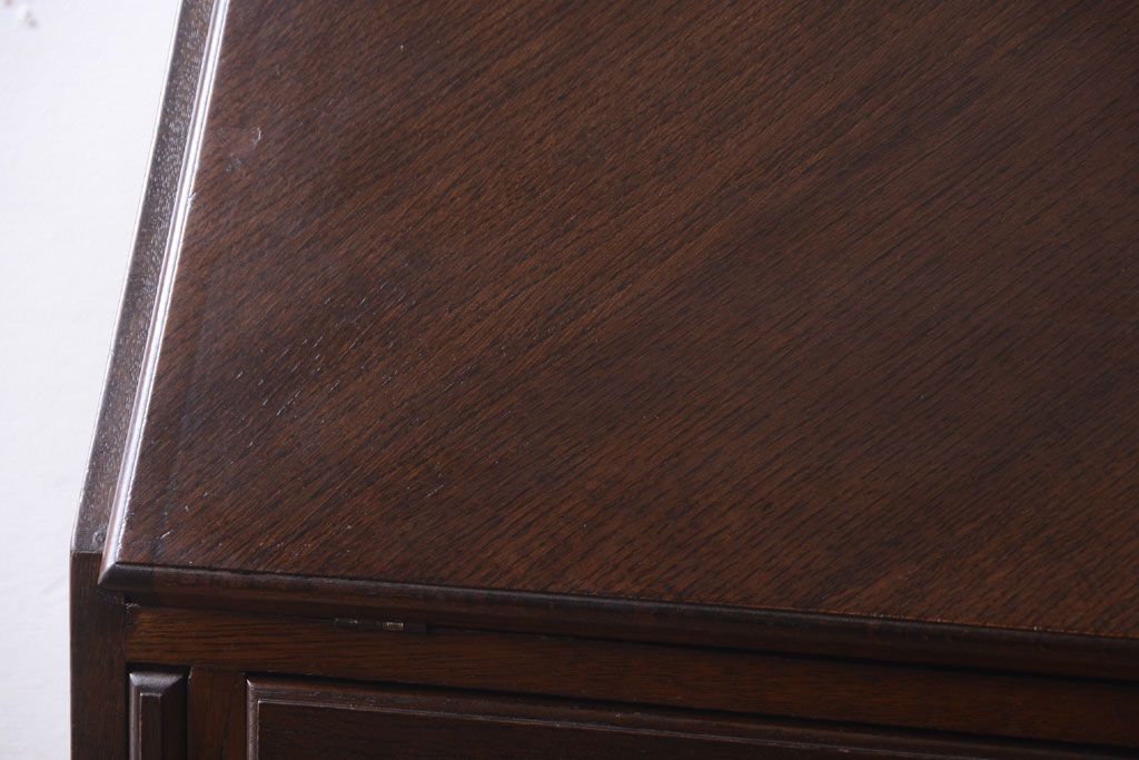 透明なステンドグラスが素敵な、イギリスアンティークのビューローブックケースです。ヨーロッパの家具に馴染み深い高級素材・オーク材が使われ、落ち着いた色合いが印象的なお品です。引き出しも多く、デザイン性と収納性を兼ね備えており、使い勝手の良さも魅力的です。上品な空間づくりにおすすめの逸品です。