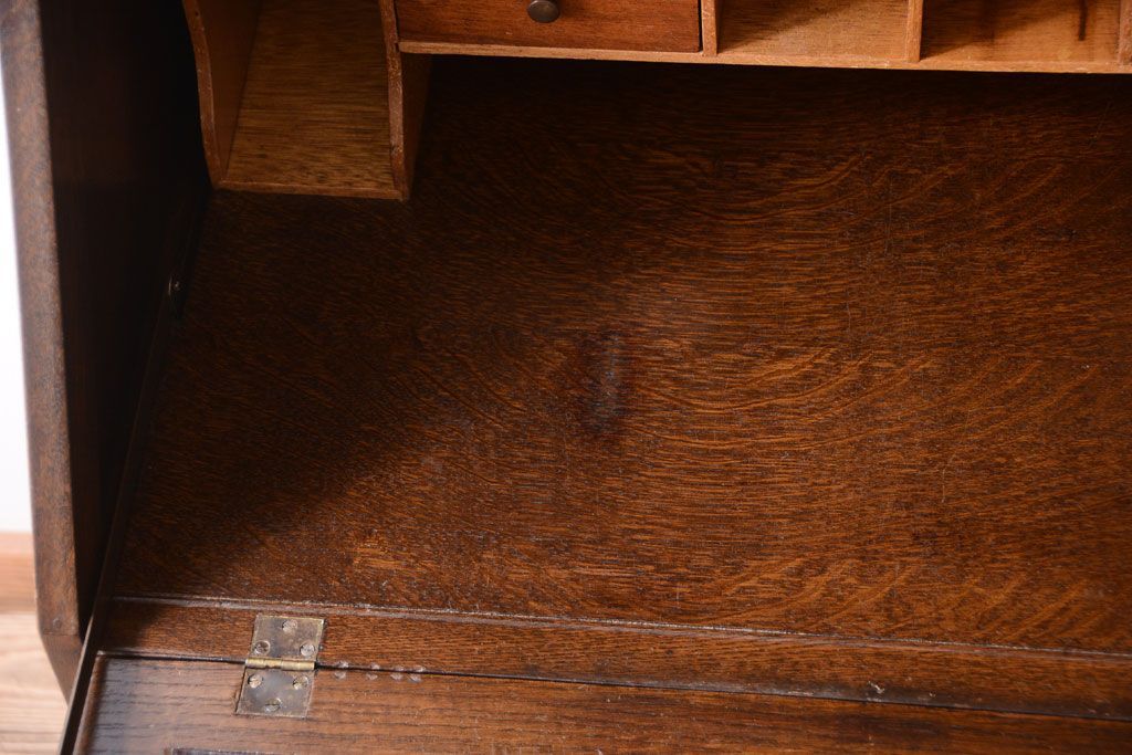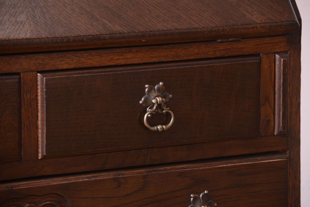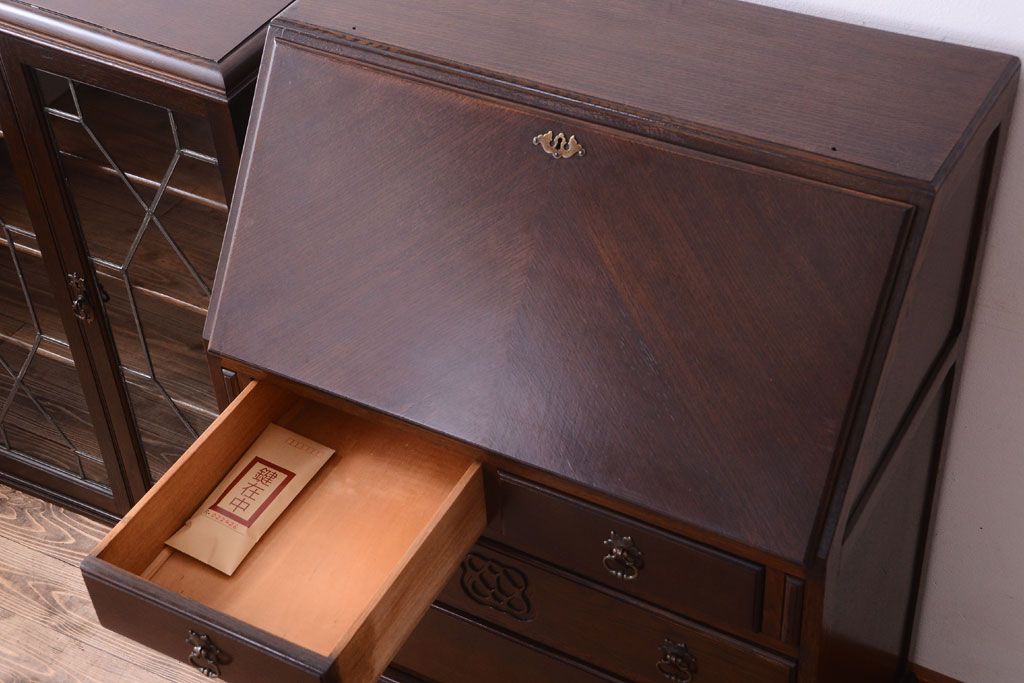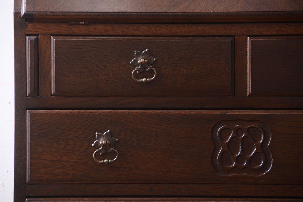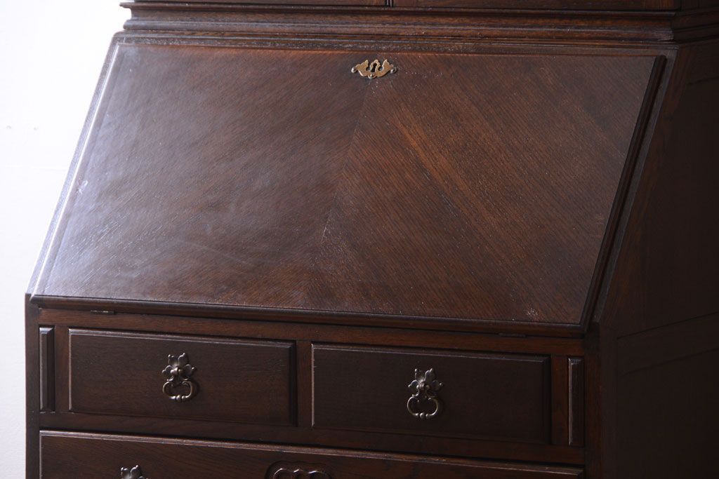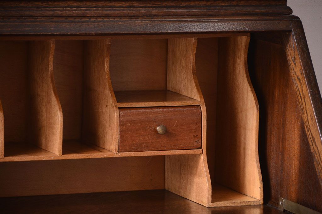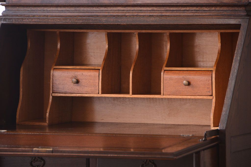 - ブックケースの3段の棚に、ライティングビューローの5杯の引き出し。たっぷりとした収納力があるので、お部屋のお片付けに活躍してくれるお品です。